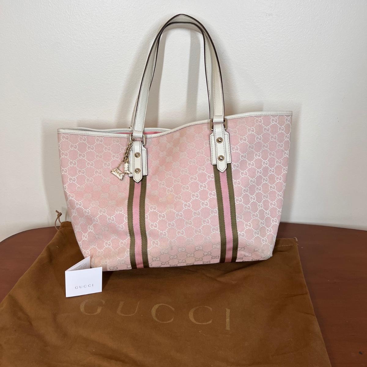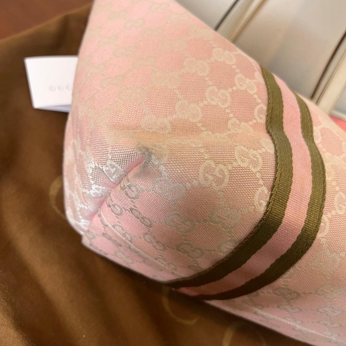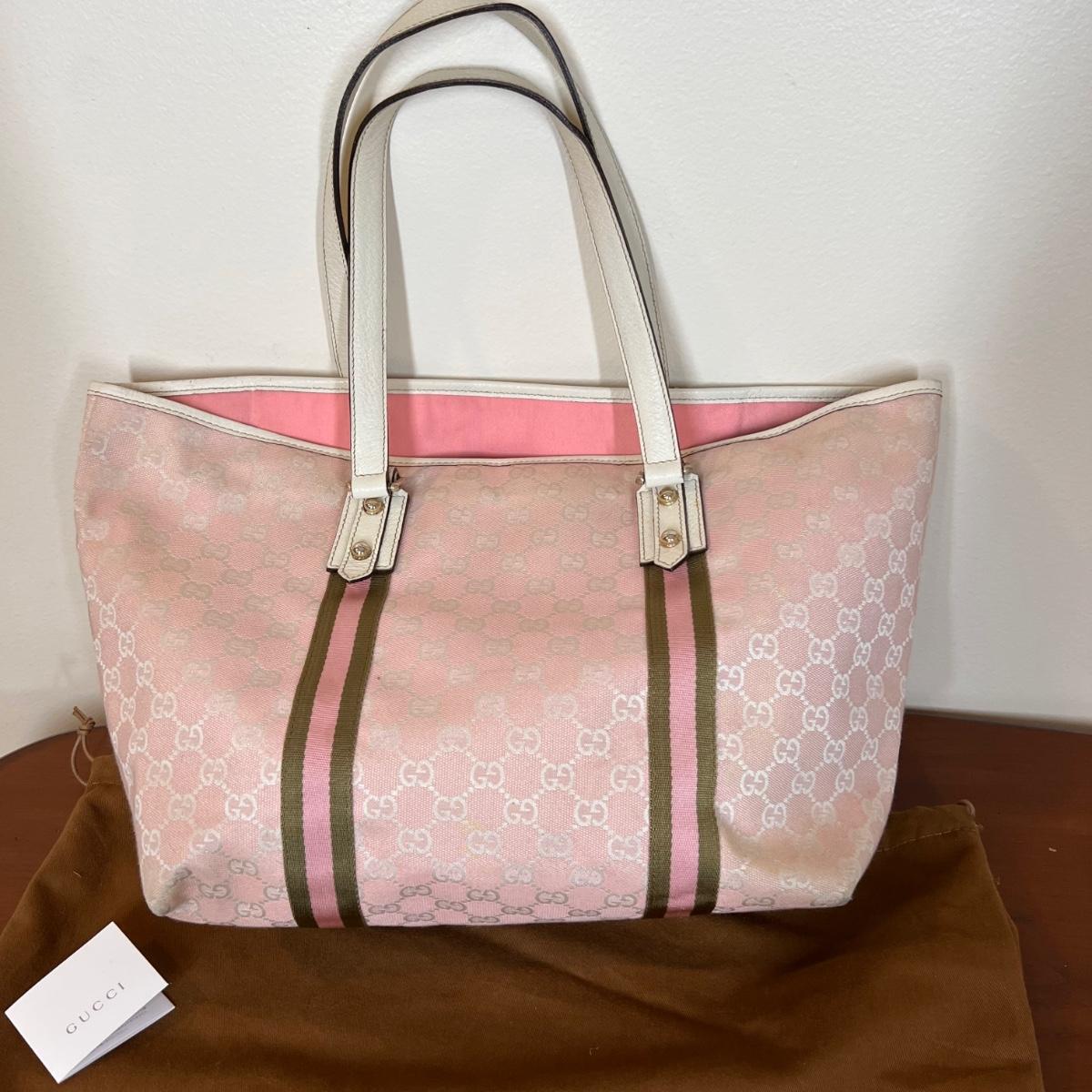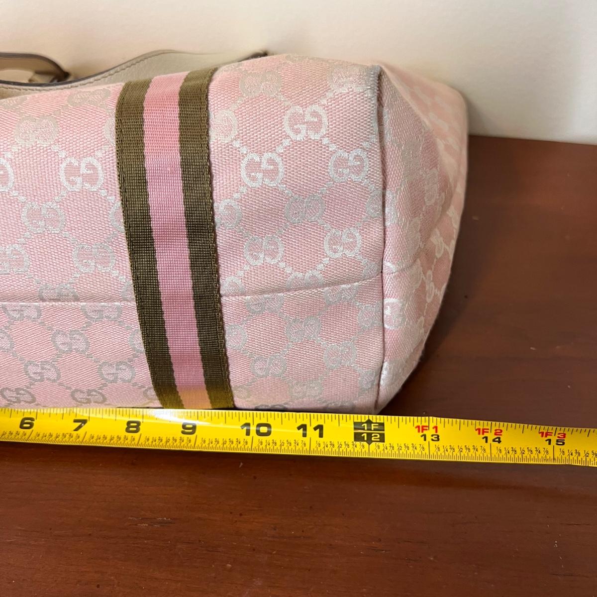 Color: pink white canvas with GG logo and olive green pink stripes, white leather gold tone hardware