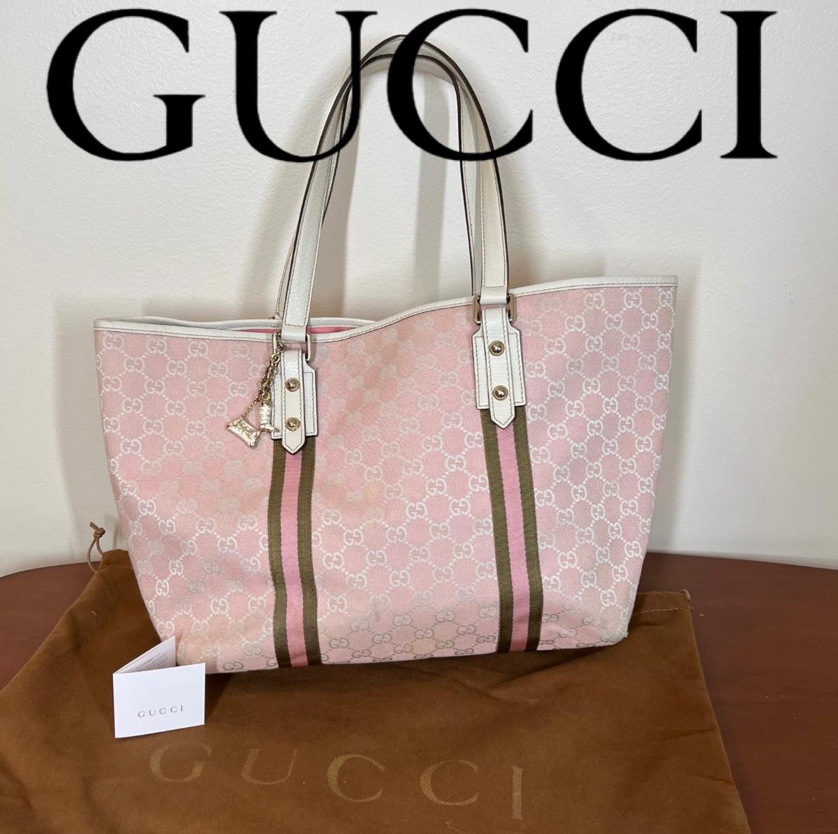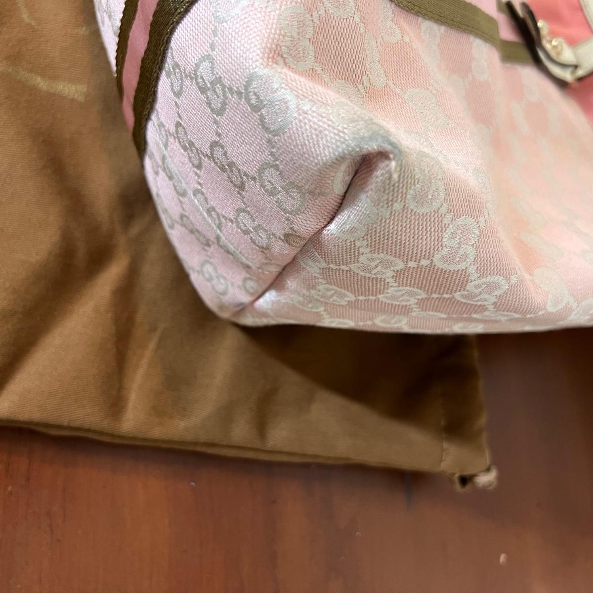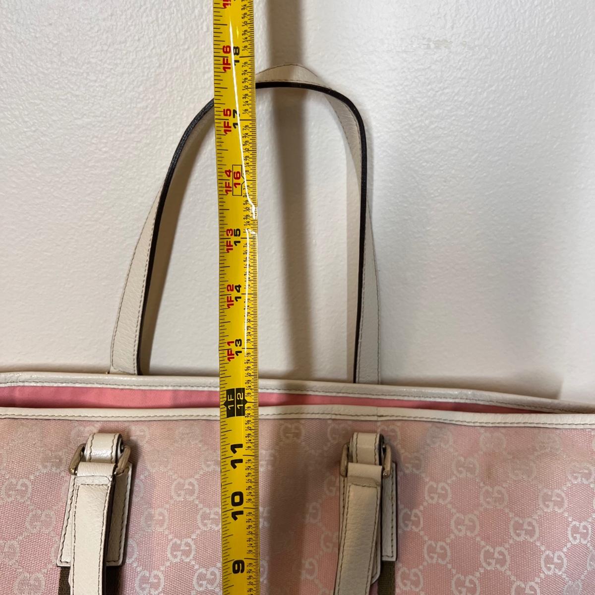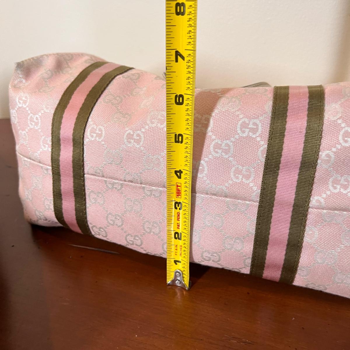 Color: pink white canvas with GG logo and olive green pink stripes, white leather gold tone hardware