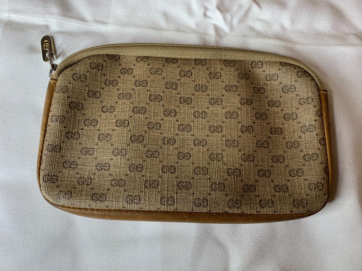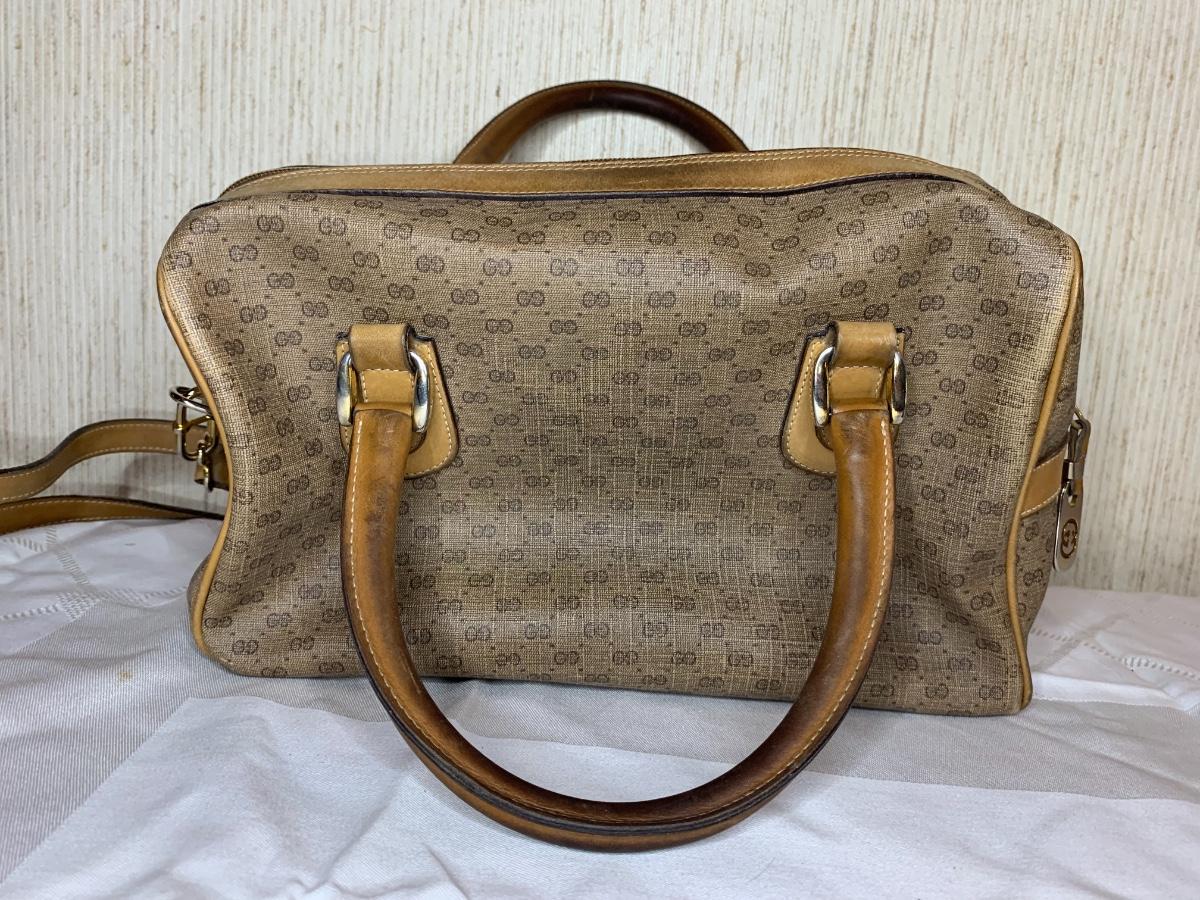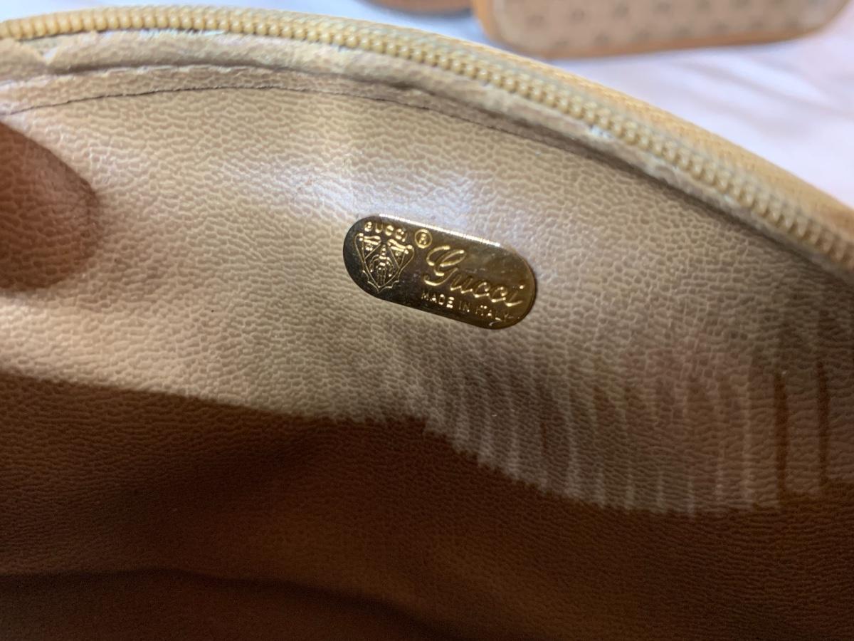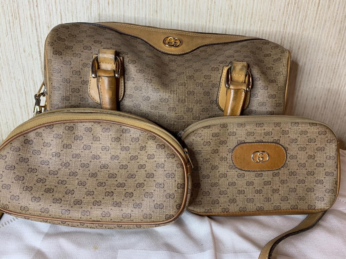 Gucci purse in great condition with the exception of normally worn handles (interior in fair condition), one small travel bag in great condition and one small travel bag with a faded tag otherwise in great condition