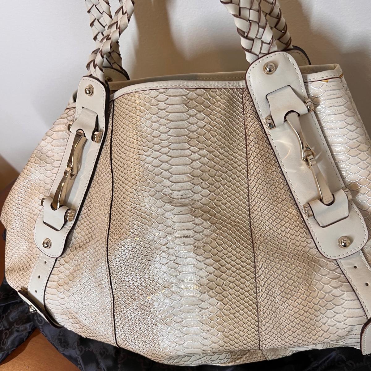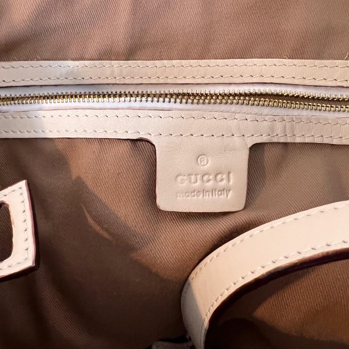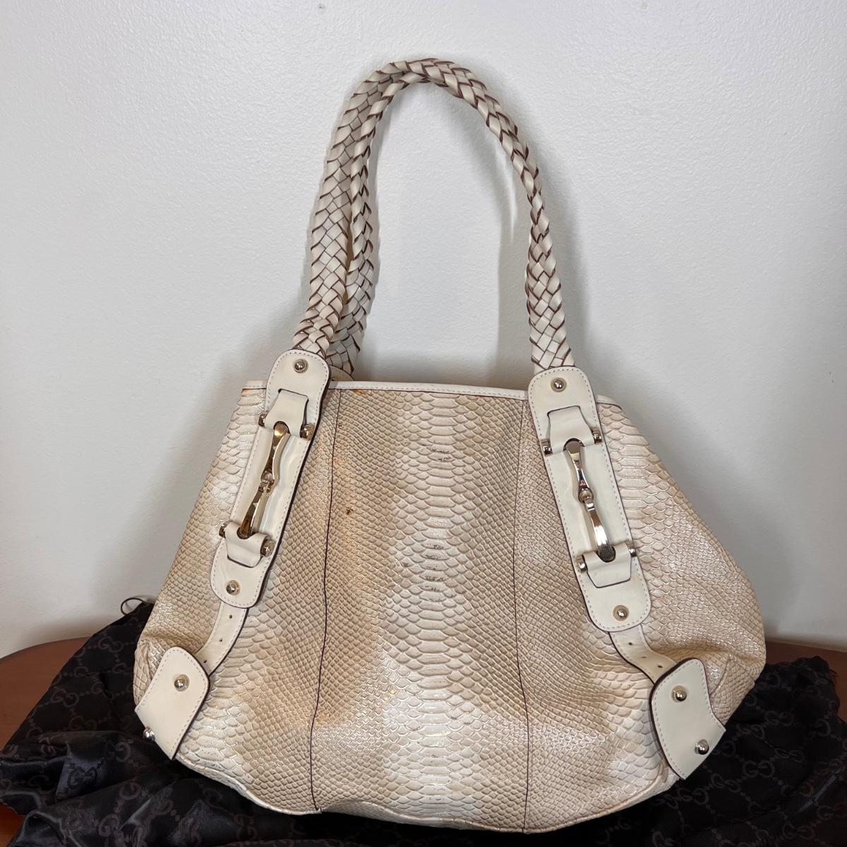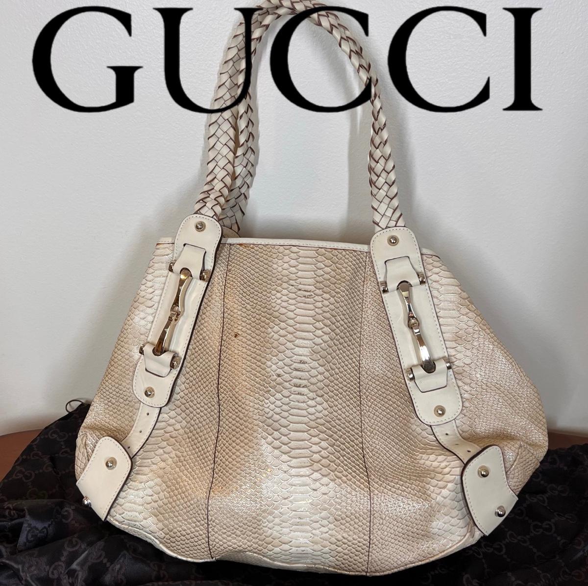Gucci white/cream leather (It has a slight gold iridescence to it) medium pelham hobo slouch shoulder bag features braided leather straps and gold tone horse bit hardware, Its part of Gucci's classic collection. Top open access with strap loop snap. Protective feet at the bottom