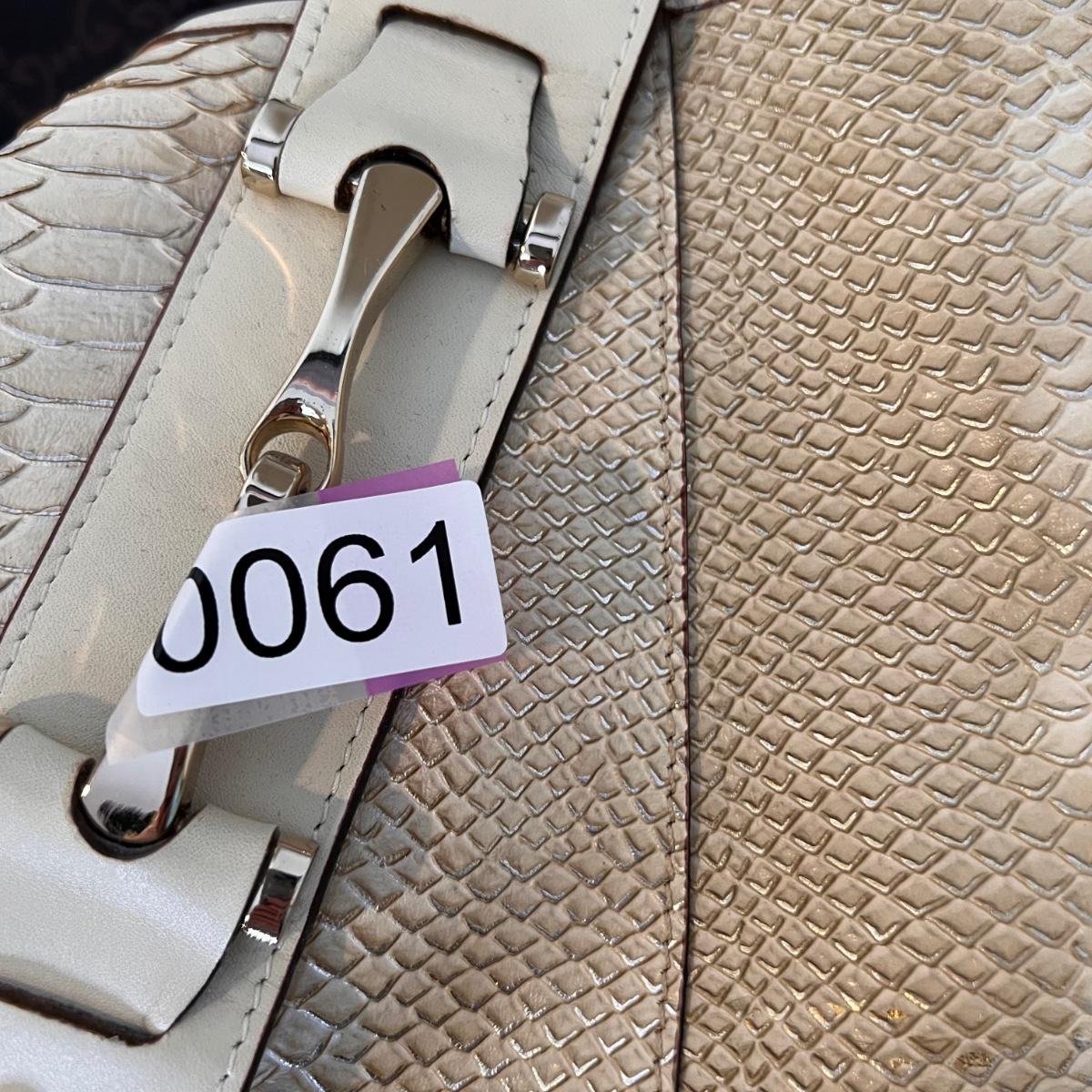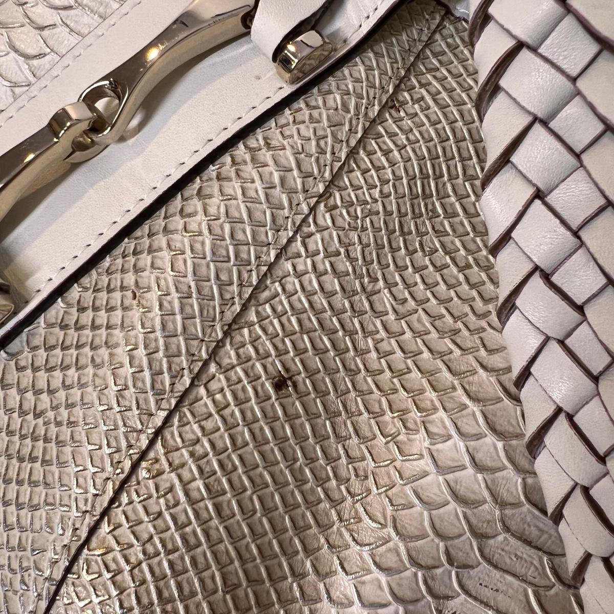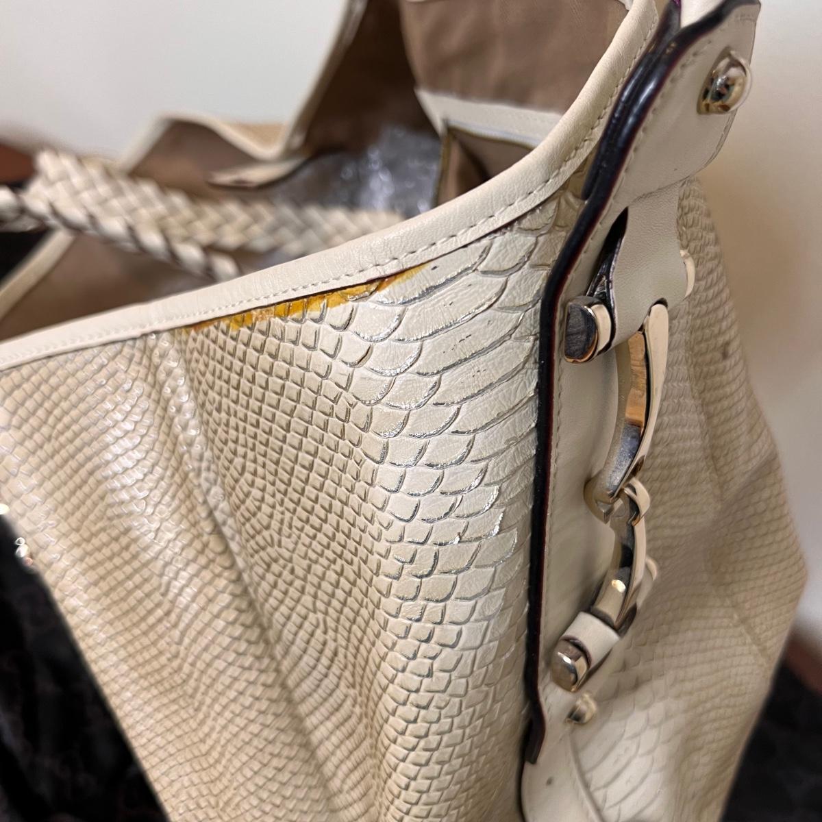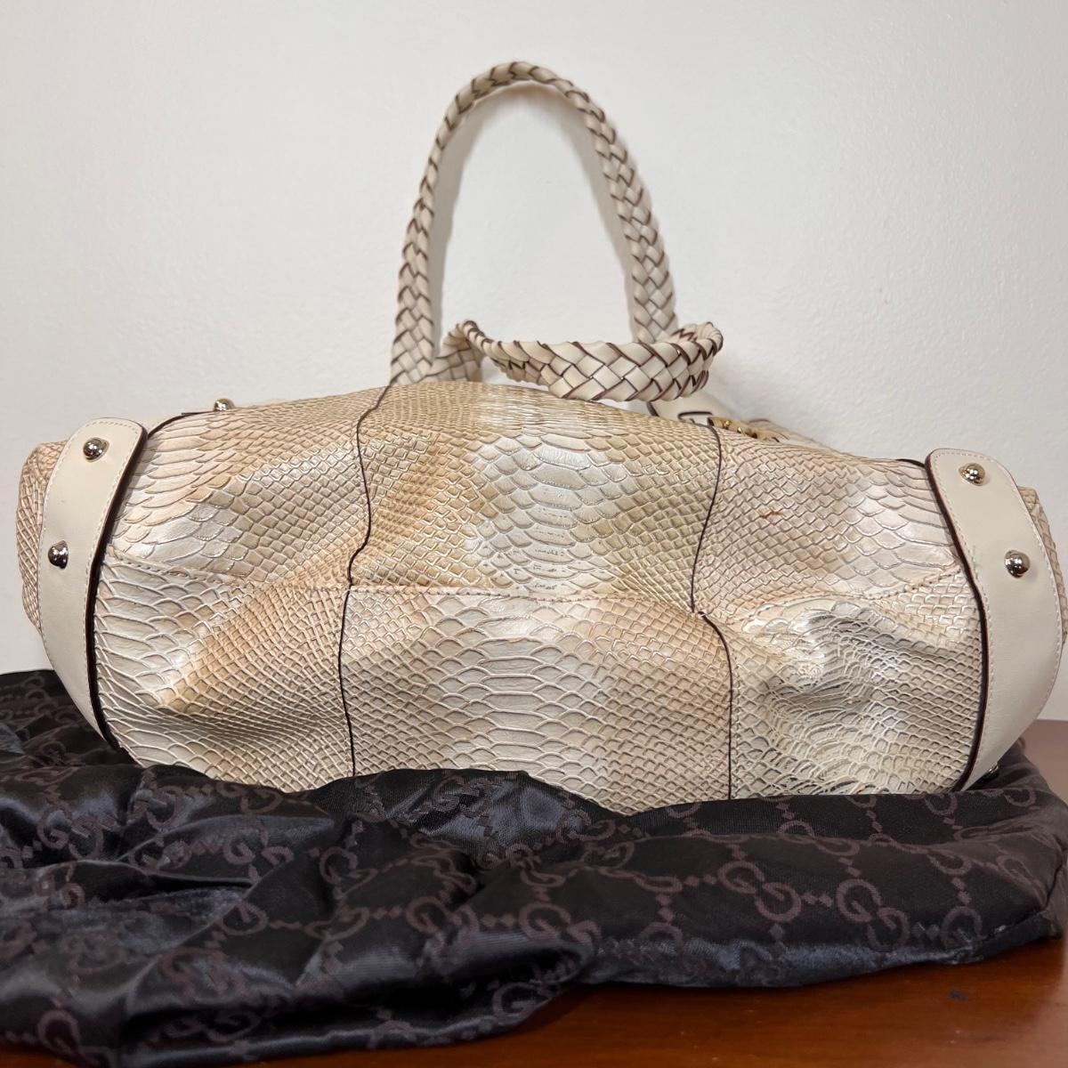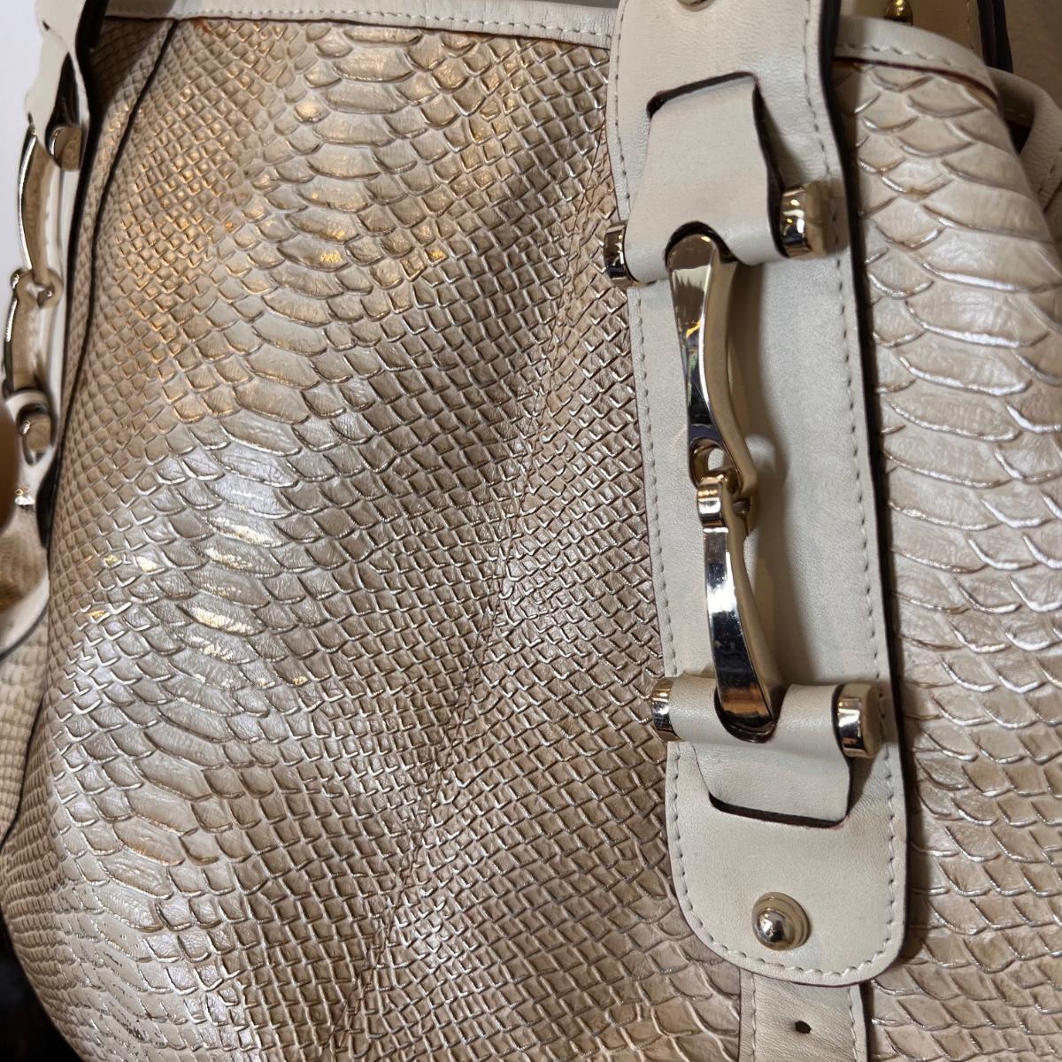 Gucci white/cream leather (It has a slight gold iridescence to it) medium pelham hobo slouch shoulder bag features braided leather straps and gold tone horse bit hardware, Its part of Gucci's classic collection. Top open access with strap loop snap. Protective feet at the bottom
