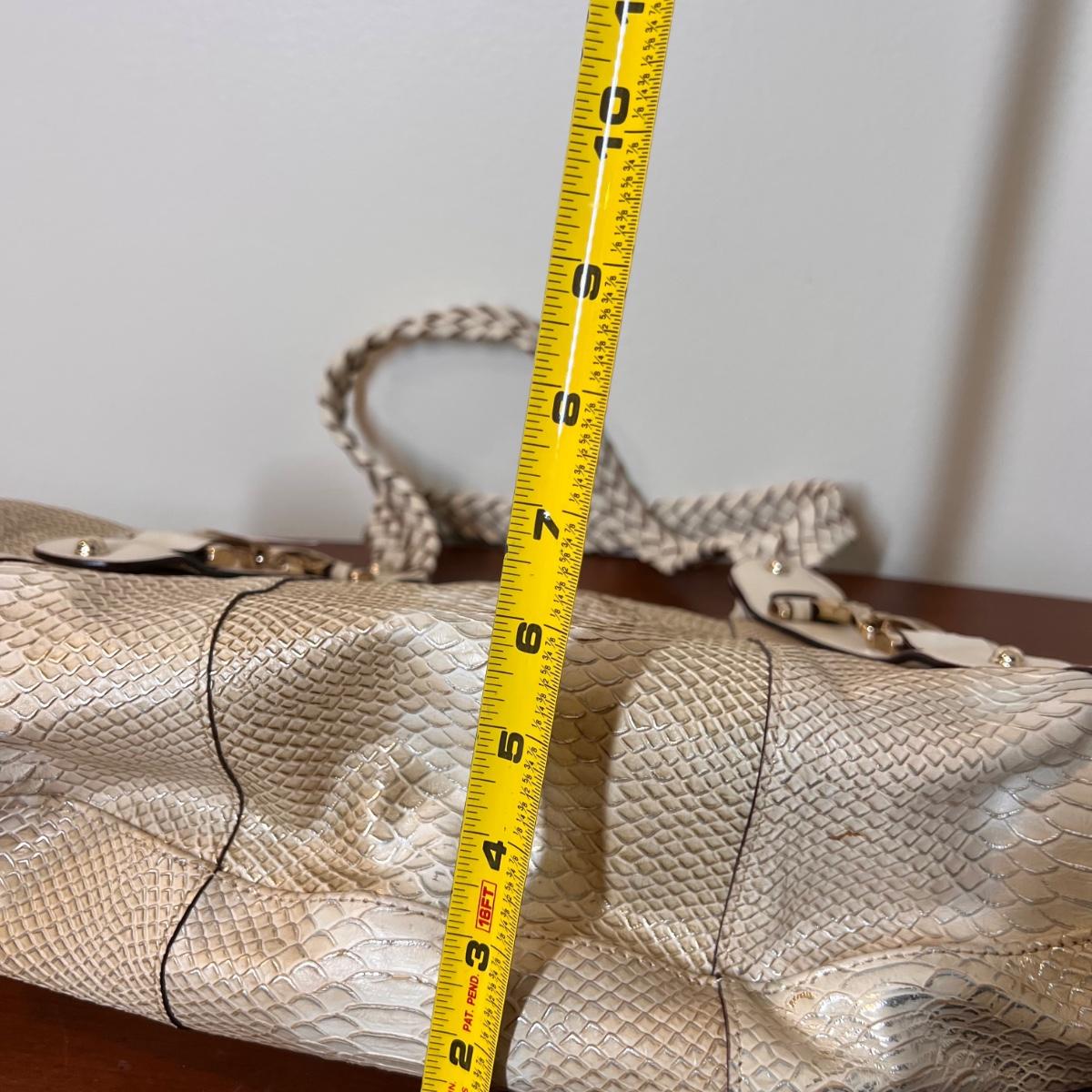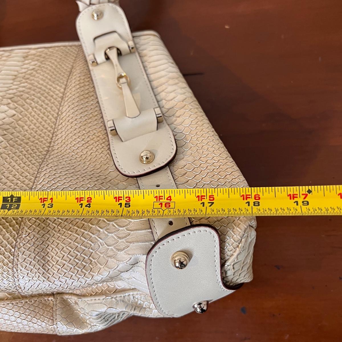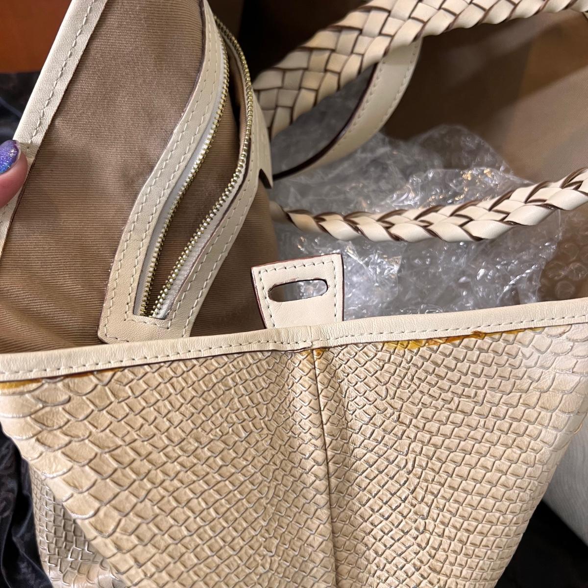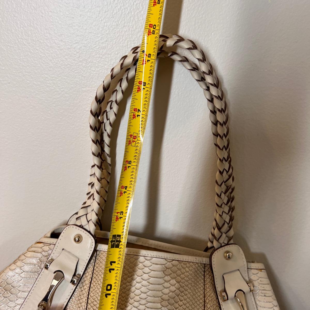 Gucci white/cream leather (It has a slight gold iridescence to it) medium pelham hobo slouch shoulder bag features braided leather straps and gold tone horse bit hardware, Its part of Gucci's classic collection. Top open access with strap loop snap. Protective feet at the bottom