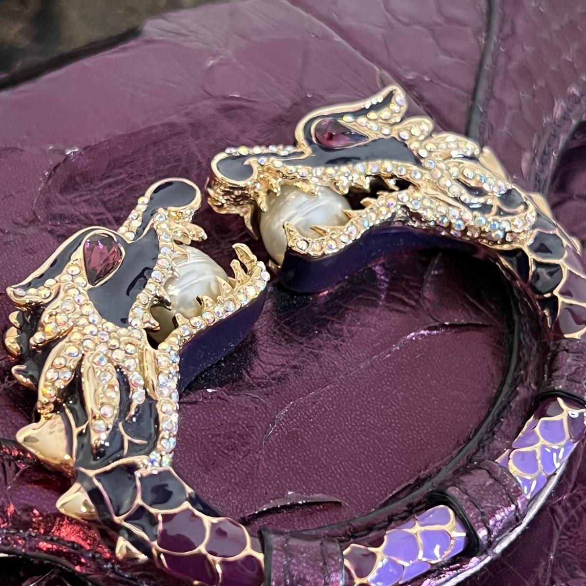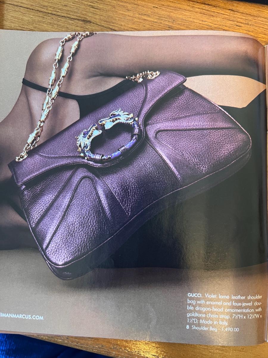 GUCCI LIMITED EDITION designed by Tom Ford. Violet lamé leather shoulder bag with enamel and faux-iewel double dragon head ornamentation with