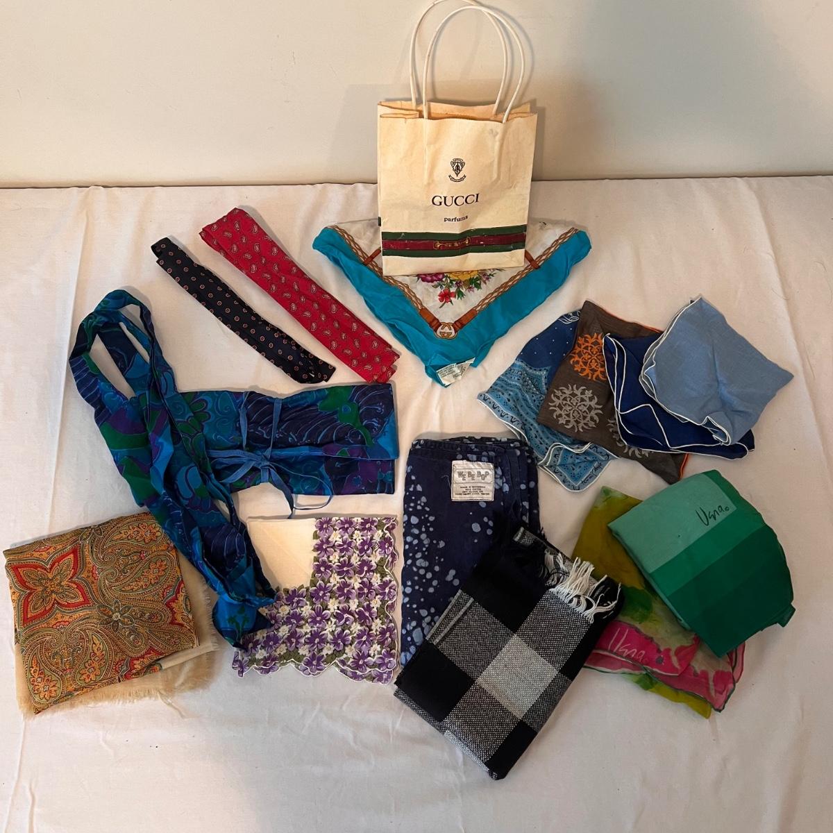 This lot has over twelve accessories, including head scarfs, neck ties, and hanker chiefs. The black and white scarf measures 72” x 11”H. The first scarf pictured comes in its shopping bag and appears to be Gucci. Other name brands you’ll see are Ray Trauss, We Be Bop, and scarves by Una. Shipping available.