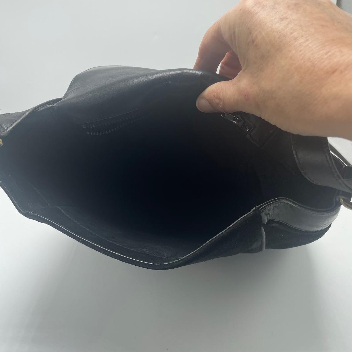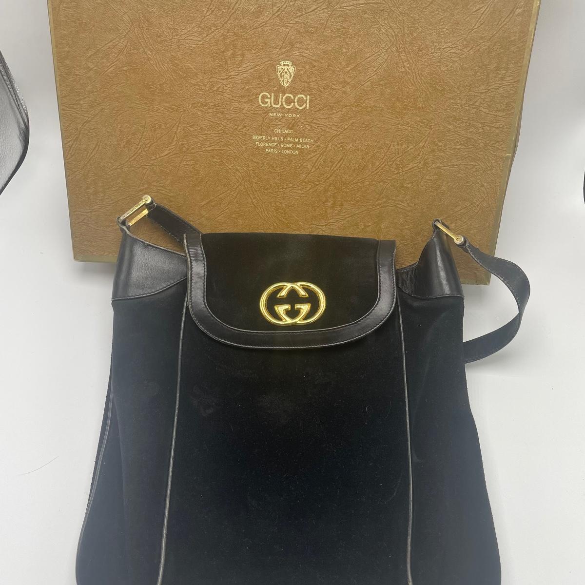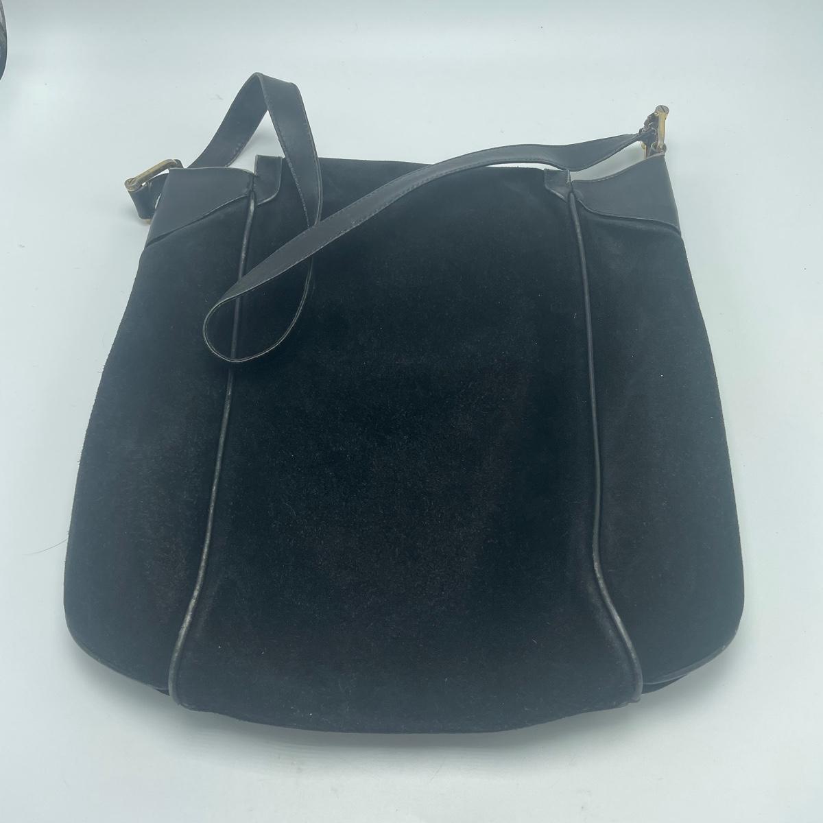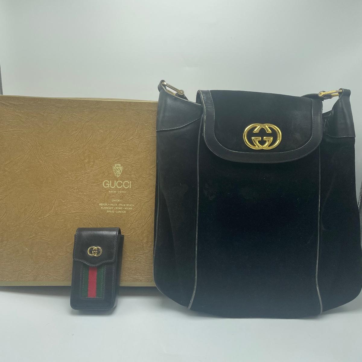 This gorgeous Gucci mid sized purse is black suede with a good colored Gucci logo. It has a mid length strap (small tear and worn buckle shown in an image) and a zippered inner pocket and comes with its original box. Also included is a small Gucci case that measures 4.5” x 2.5” x 1”. Purse measures 11.5” x 12” x 1”. A small gold colored metal tag was added to this lot later.