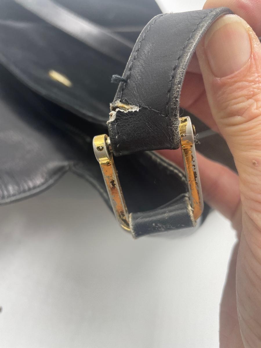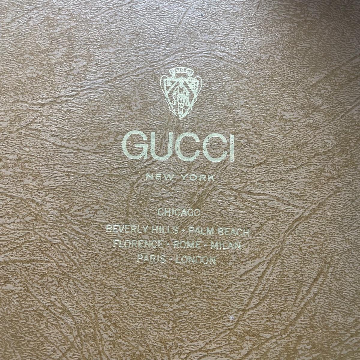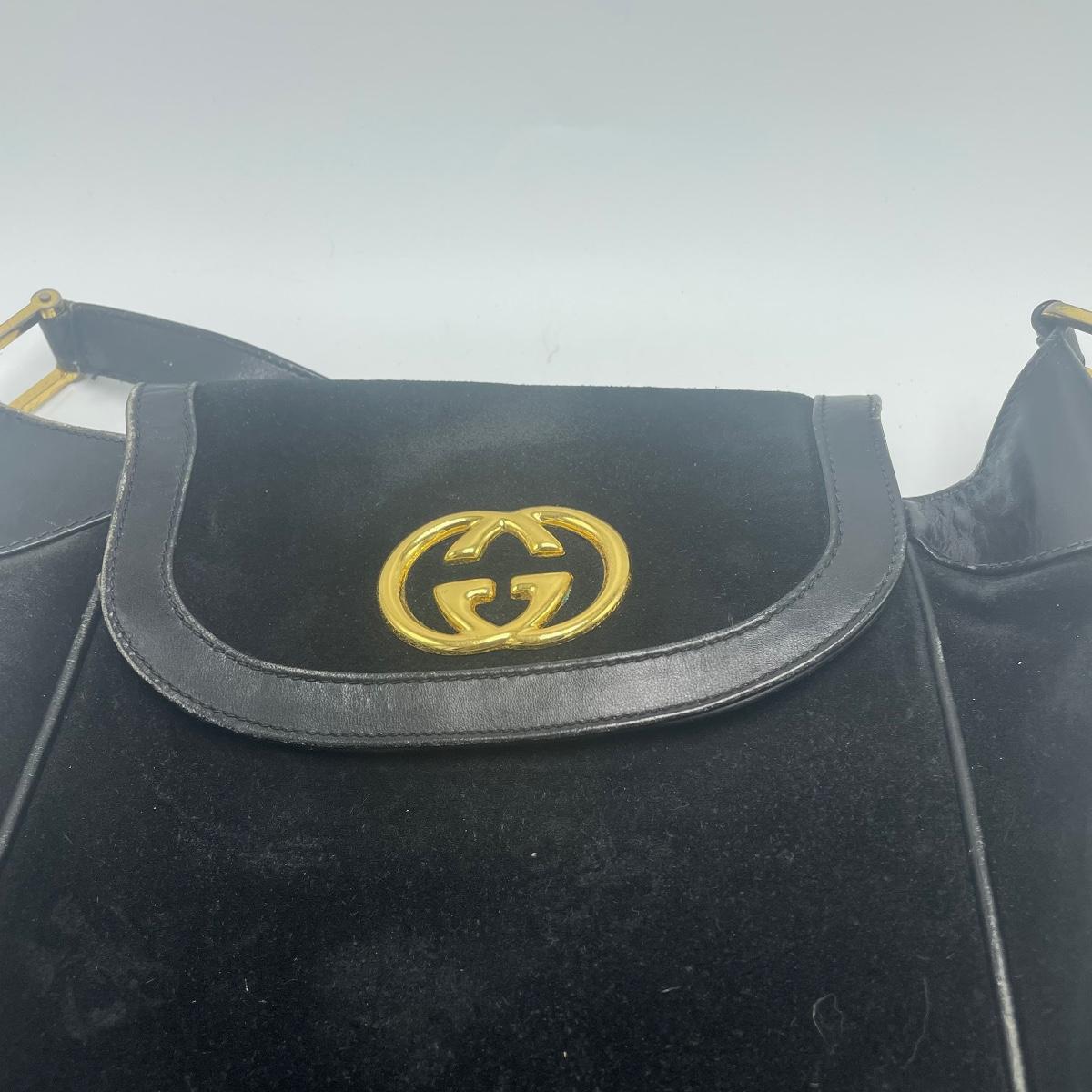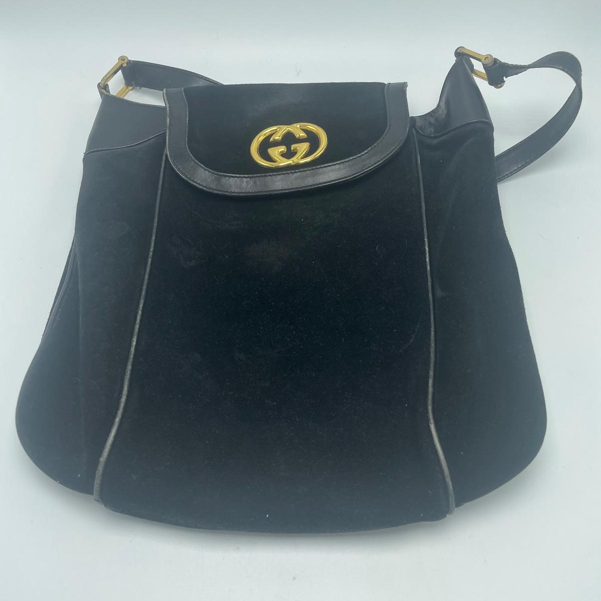 This gorgeous Gucci mid sized purse is black suede with a good colored Gucci logo. It has a mid length strap (small tear and worn buckle shown in an image) and a zippered inner pocket and comes with its original box. Also included is a small Gucci case that measures 4.5” x 2.5” x 1”. Purse measures 11.5” x 12” x 1”. A small gold colored metal tag was added to this lot later.