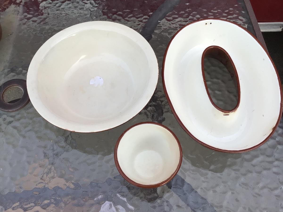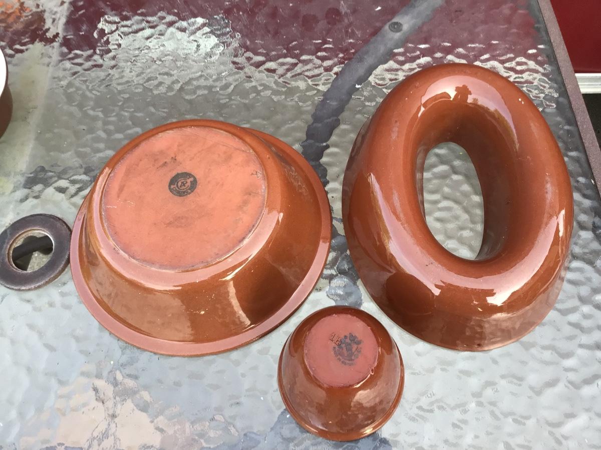 Bowl and dip cup both have Guernsey mark, O Bolwl has a different make just can5 make it out. All three dishes go.