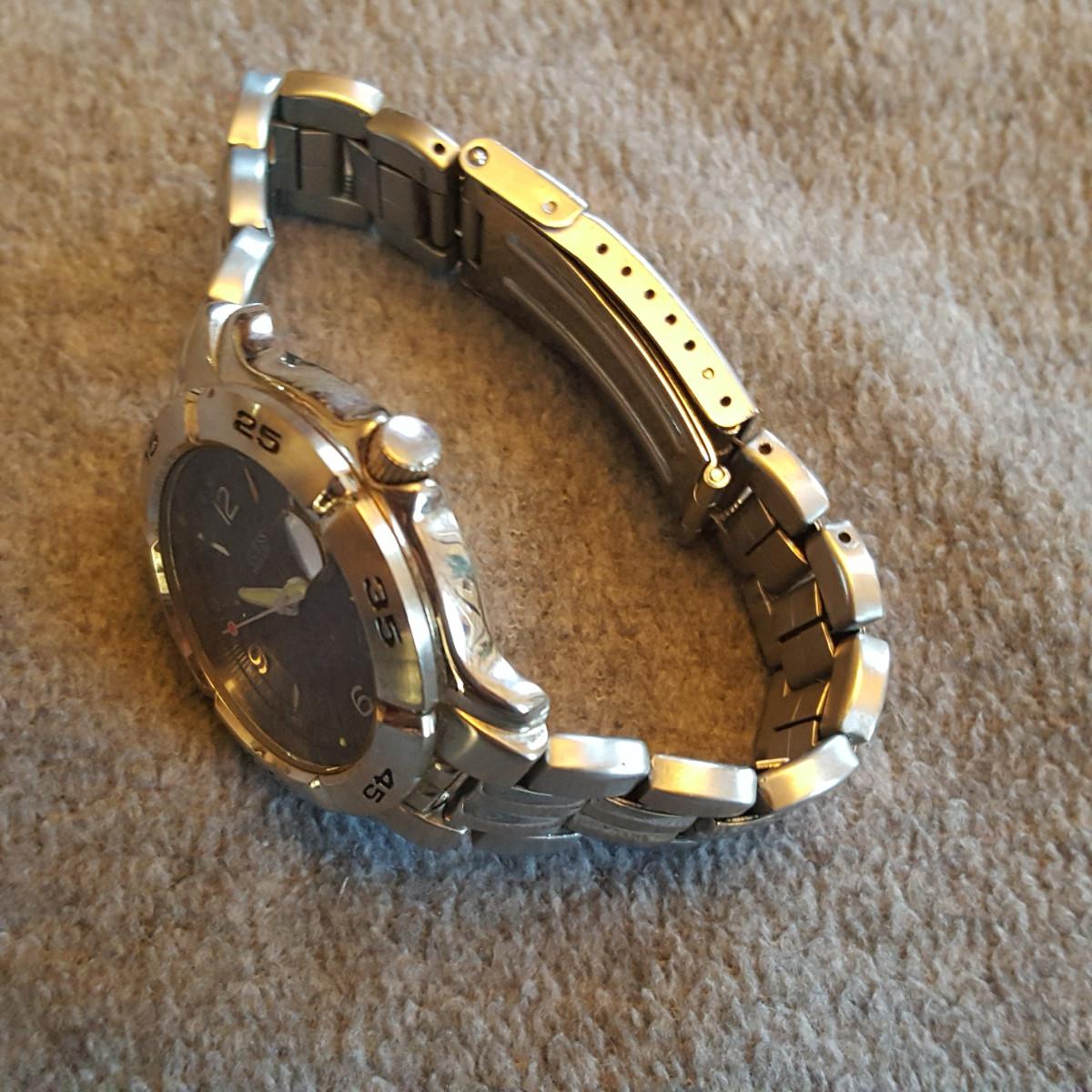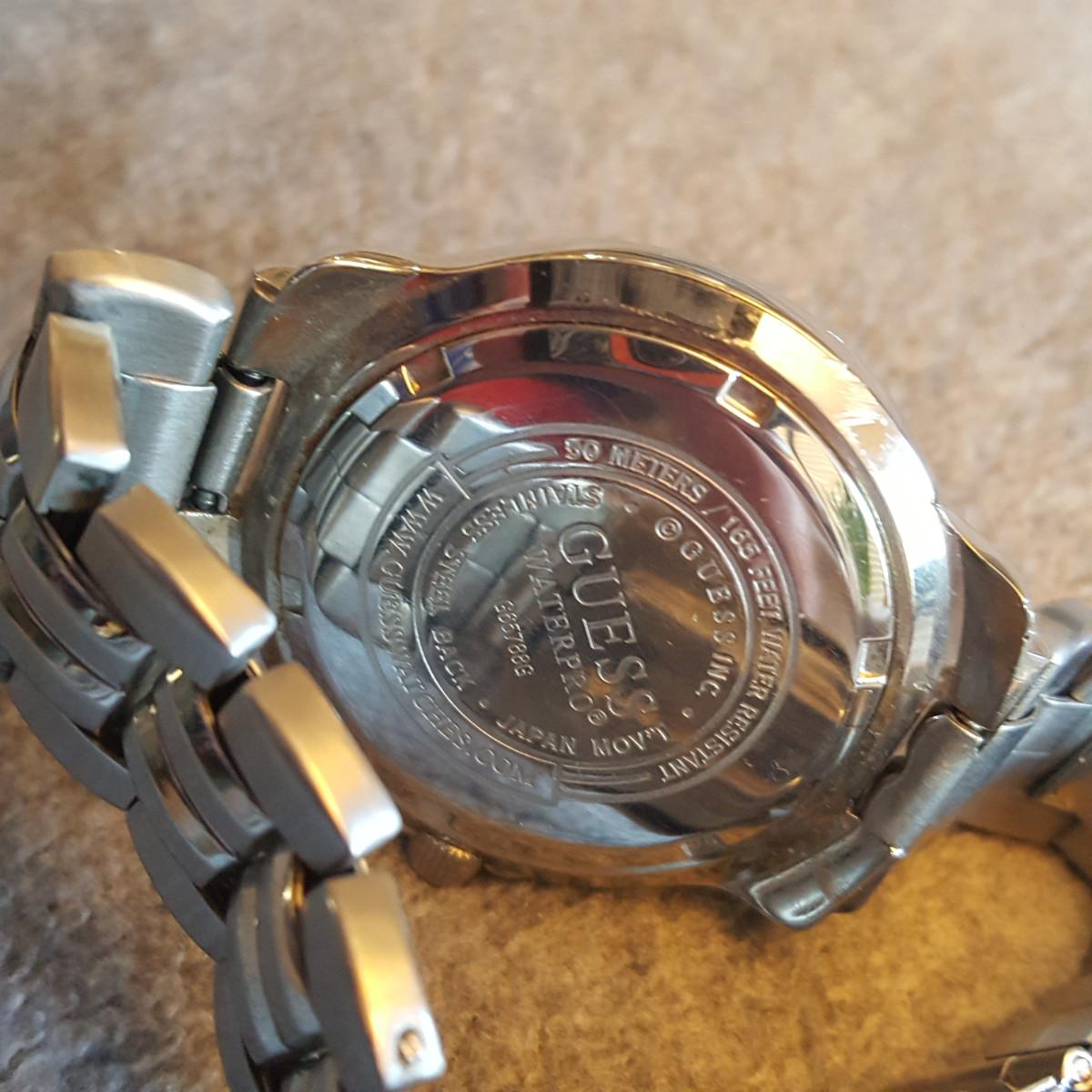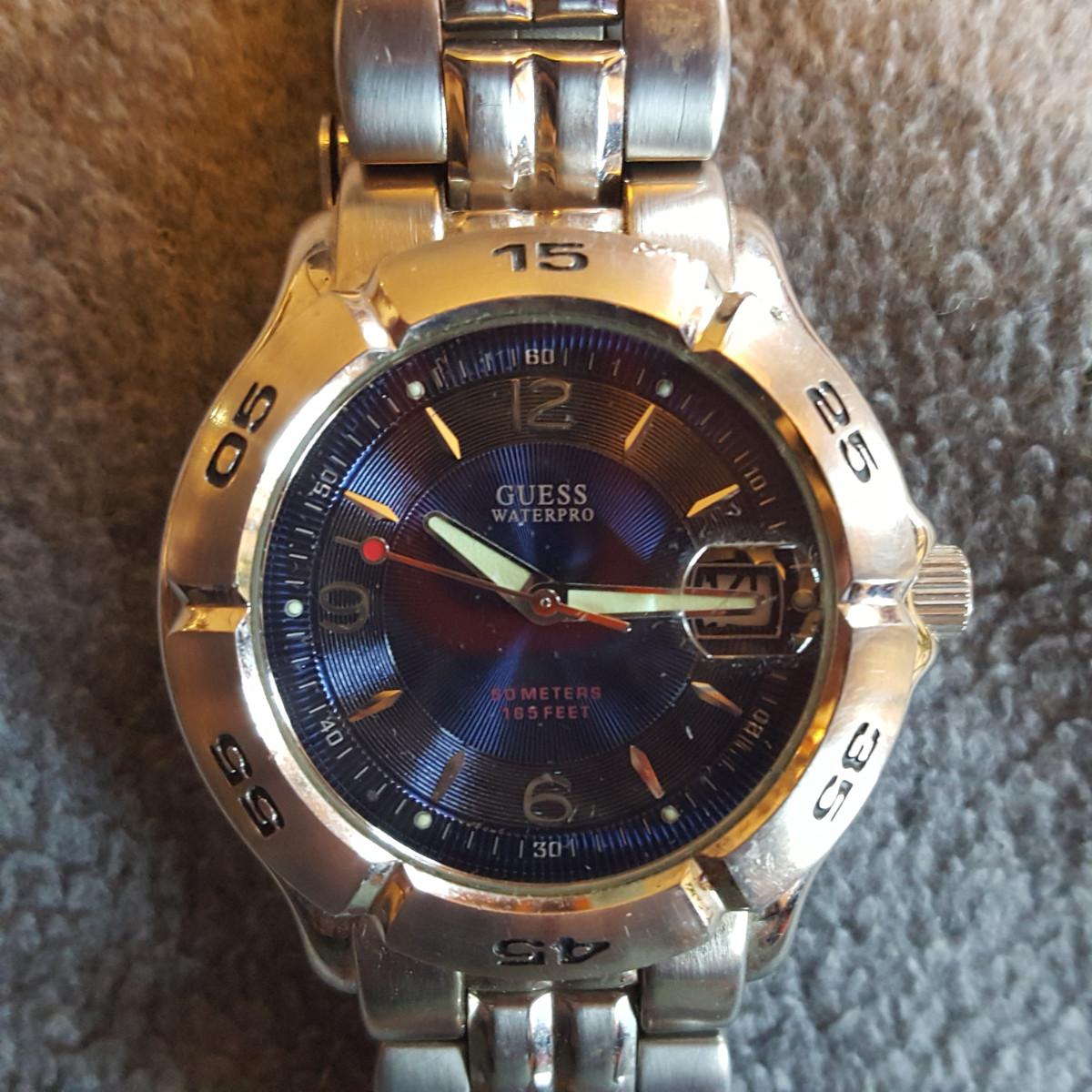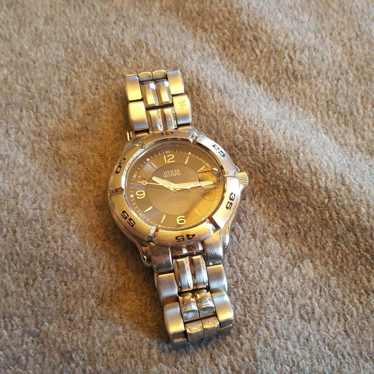 This auction lot is for a vintage Guess Waterpro Wristwatch. This watch is executed in chrome and is rated for 50 meters. The movement was made in Japan and has a nice design. The watch is heavy and perfect for the active man. Needs a battery but otherwise appears fine.