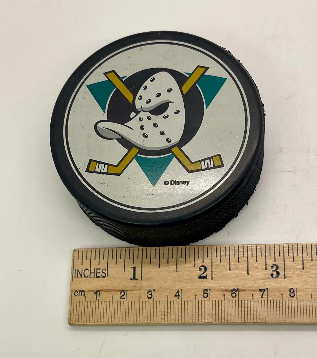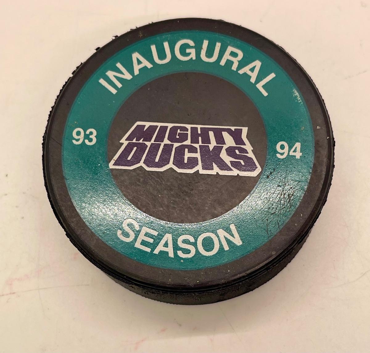 Inaugural Season 1993-1994 collectible hockey puck. Looks like it was sold after game use, shows some wear and tear typical of a used puck.