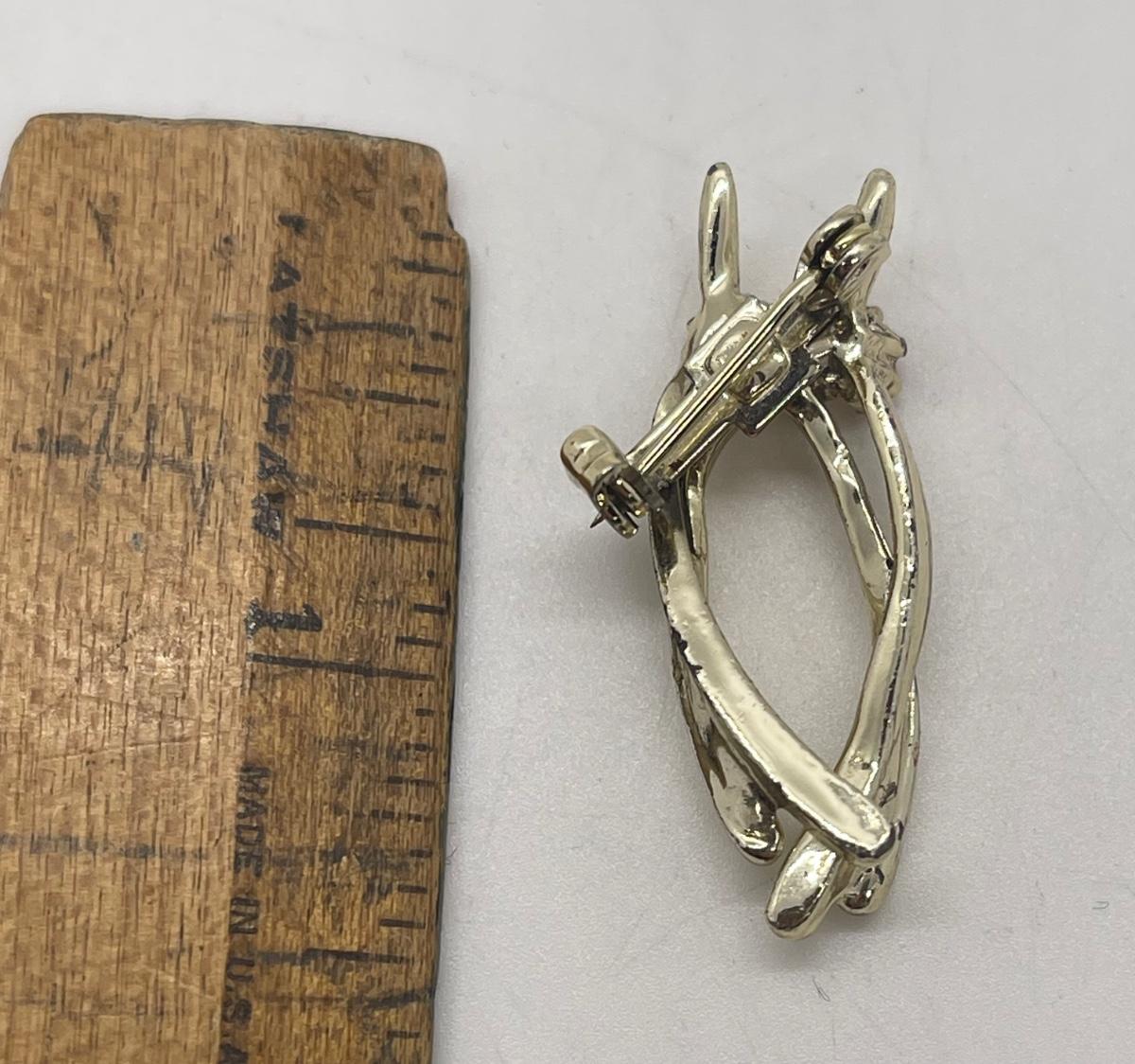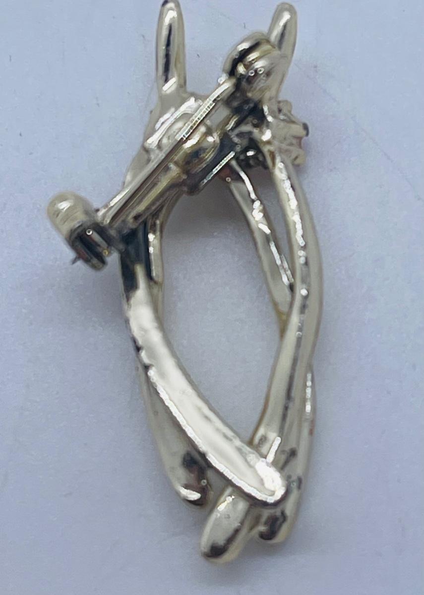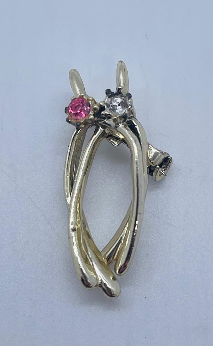 Silver tone metal, with 1 pink stone (the other stone is missing).