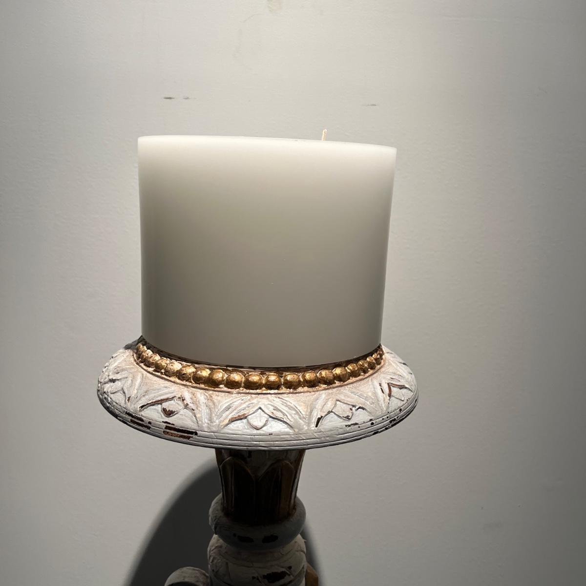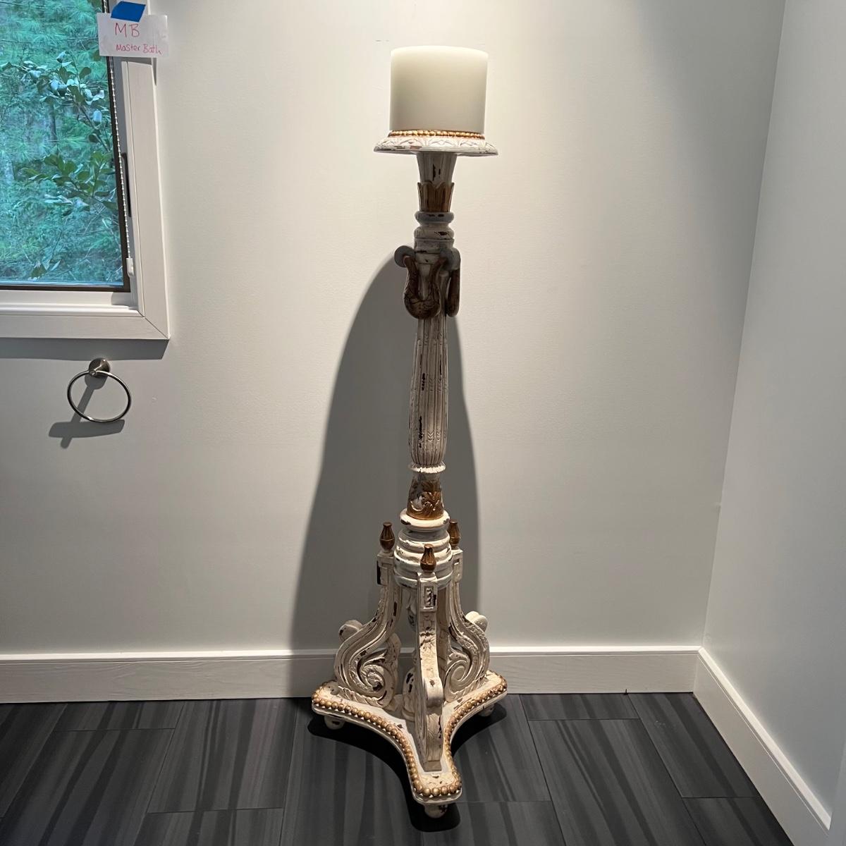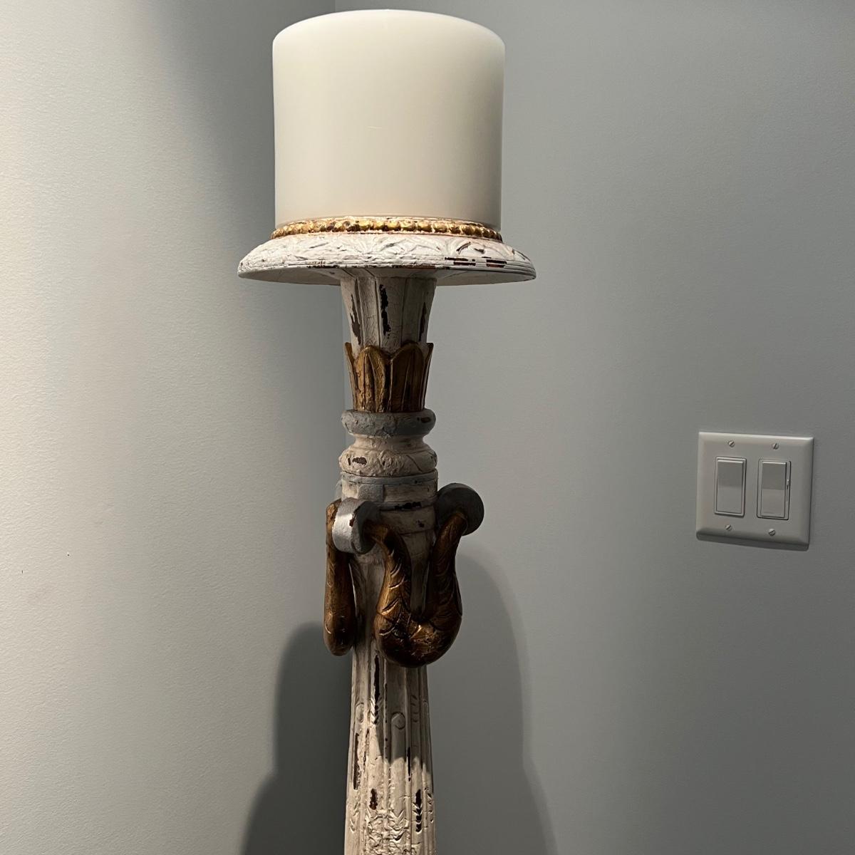 Tall whitewashed candle pedestal by GuildMaster. Item appears to be wood and is painted in gold and light blue accents. The candle itself is 6”D x8”H and the pedestal is 21” x 60”H.