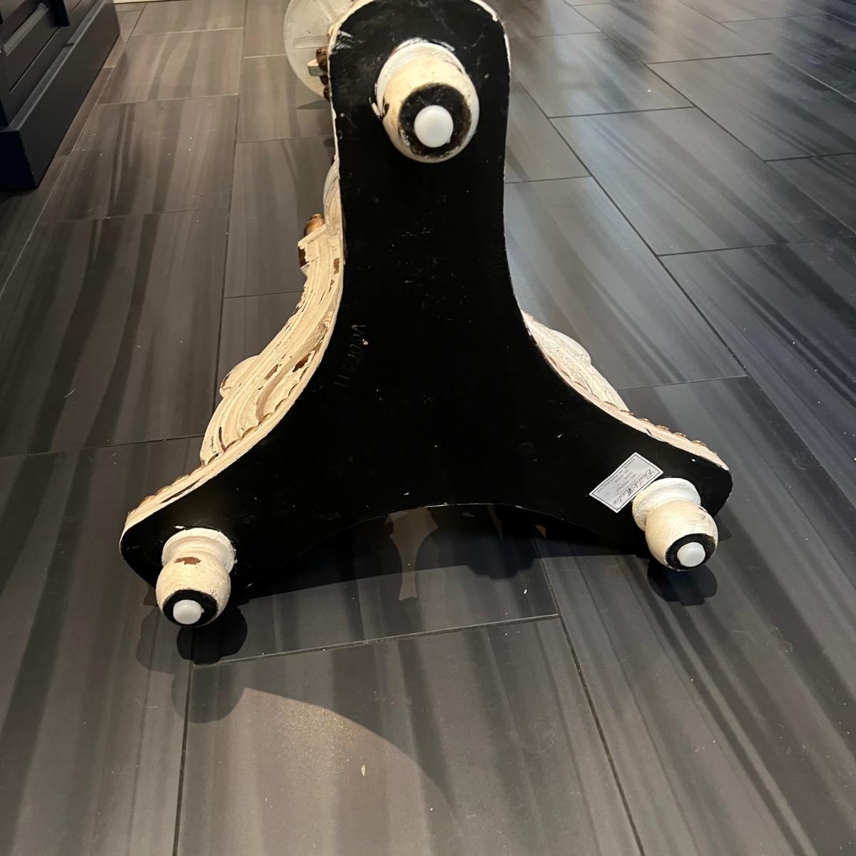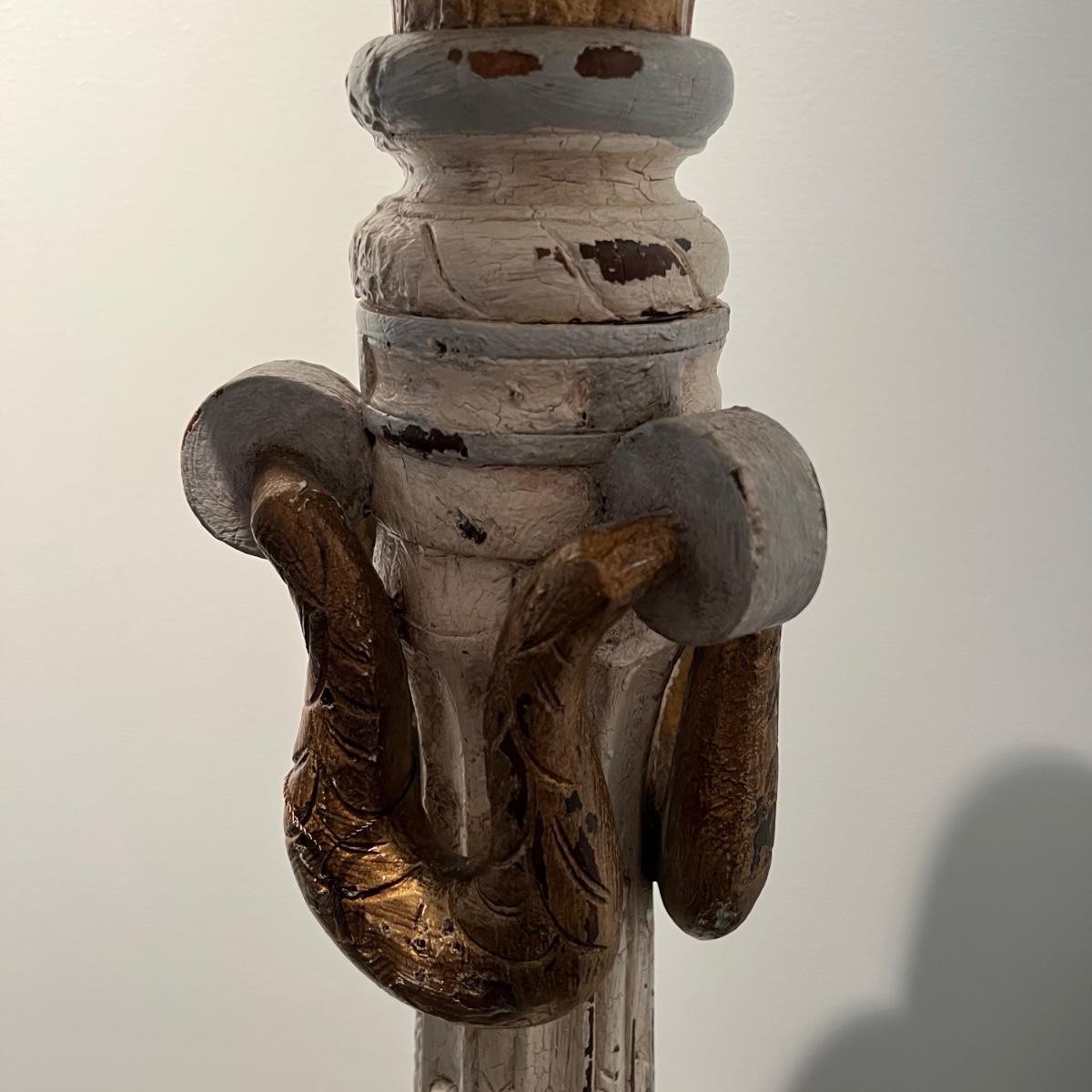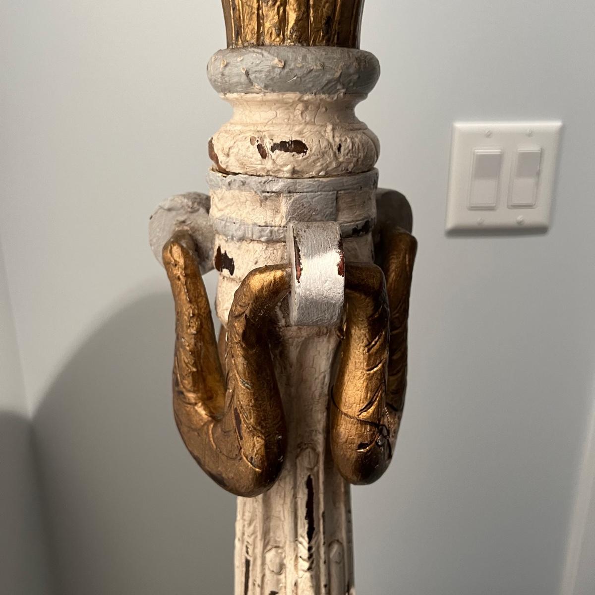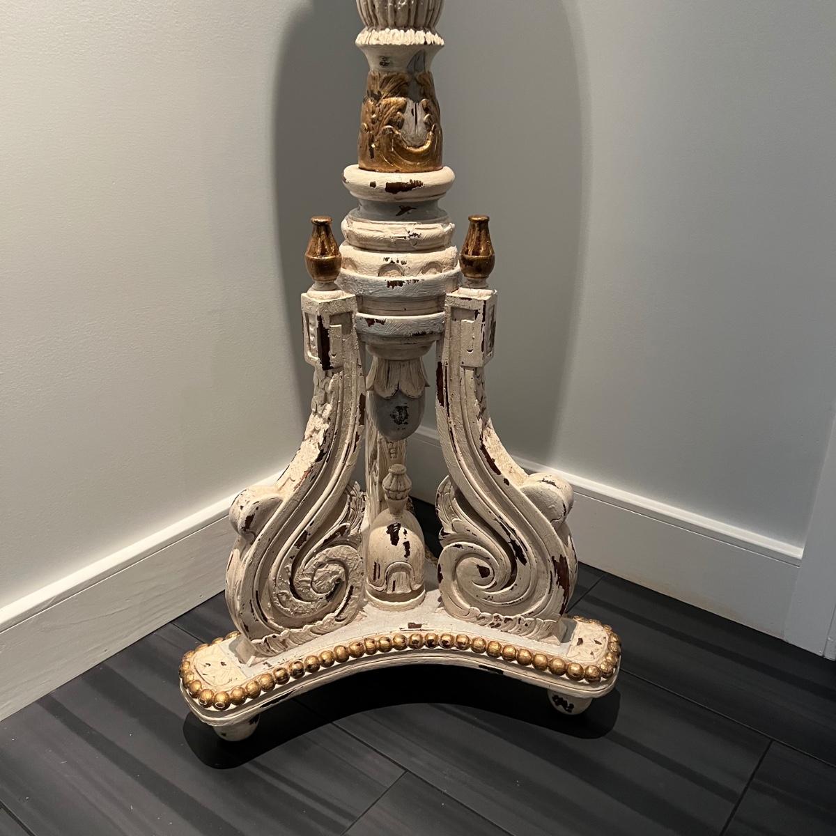 Tall whitewashed candle pedestal by GuildMaster. Item appears to be wood and is painted in gold and light blue accents. The candle itself is 6”D x8”H and the pedestal is 21” x 60”H.