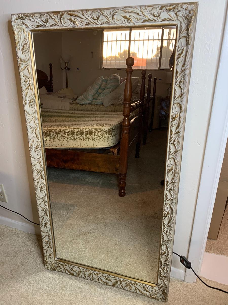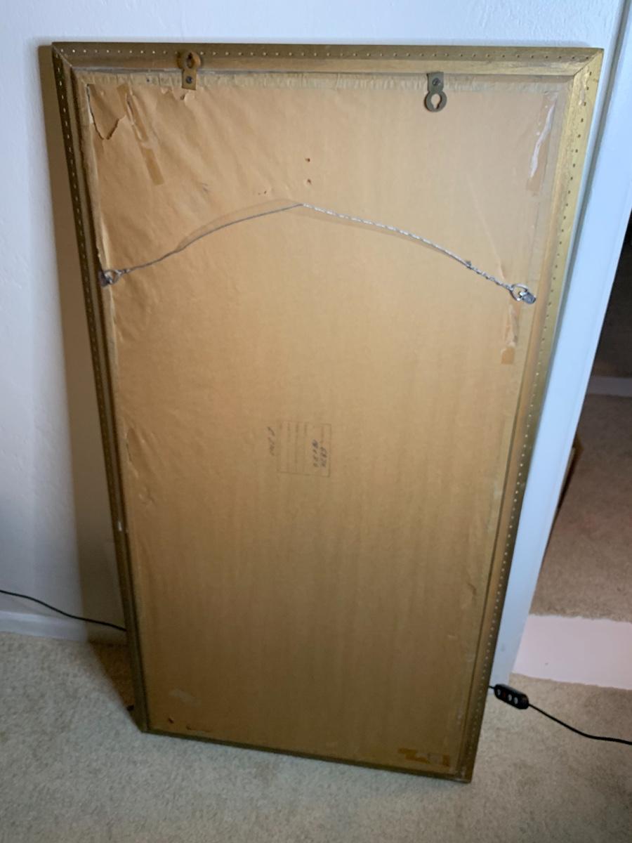 Lot is for a vintage 39x21” wood framed mirror with gold accents. Contents in Mirror's reflection not included.