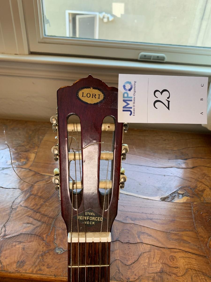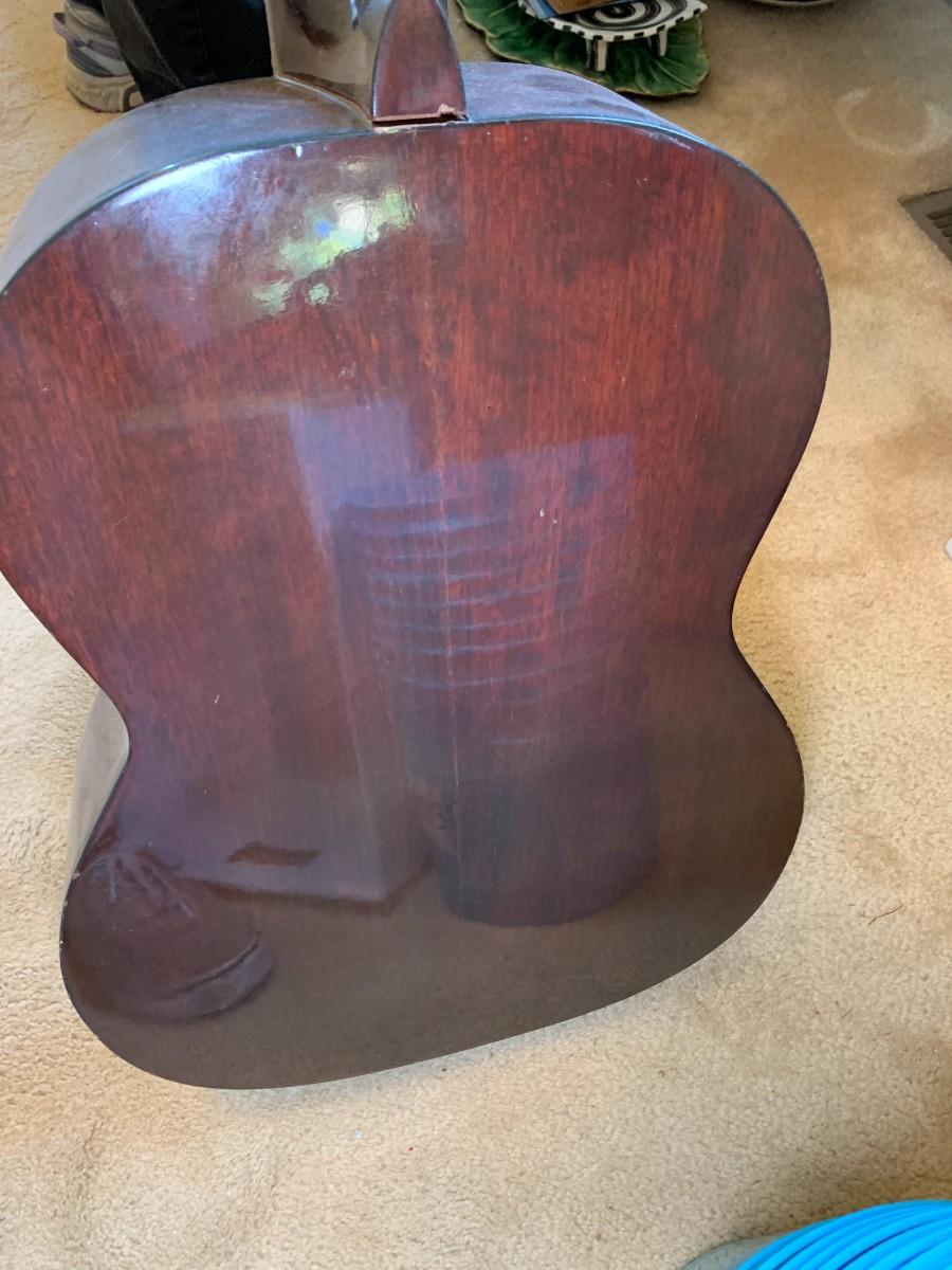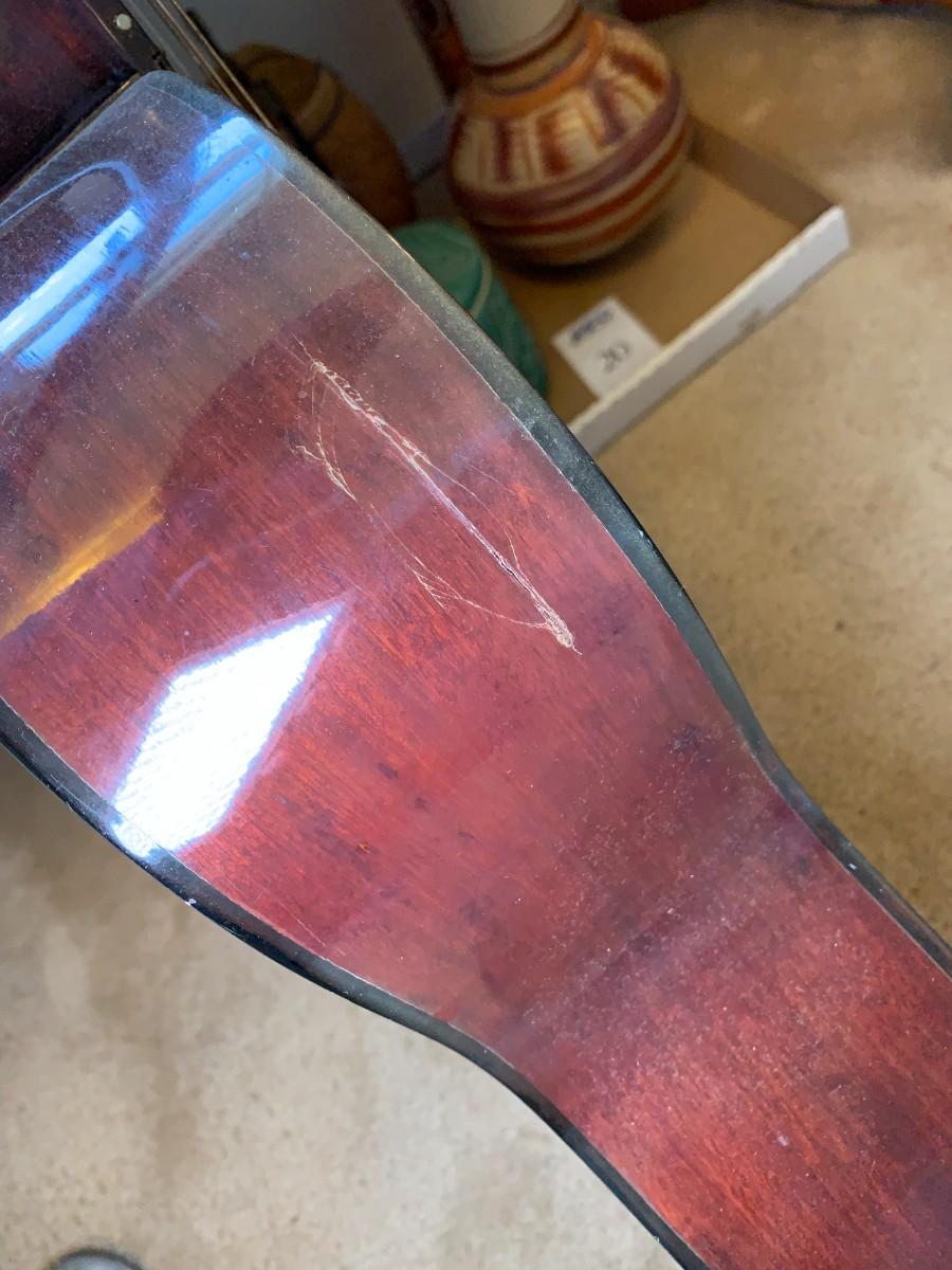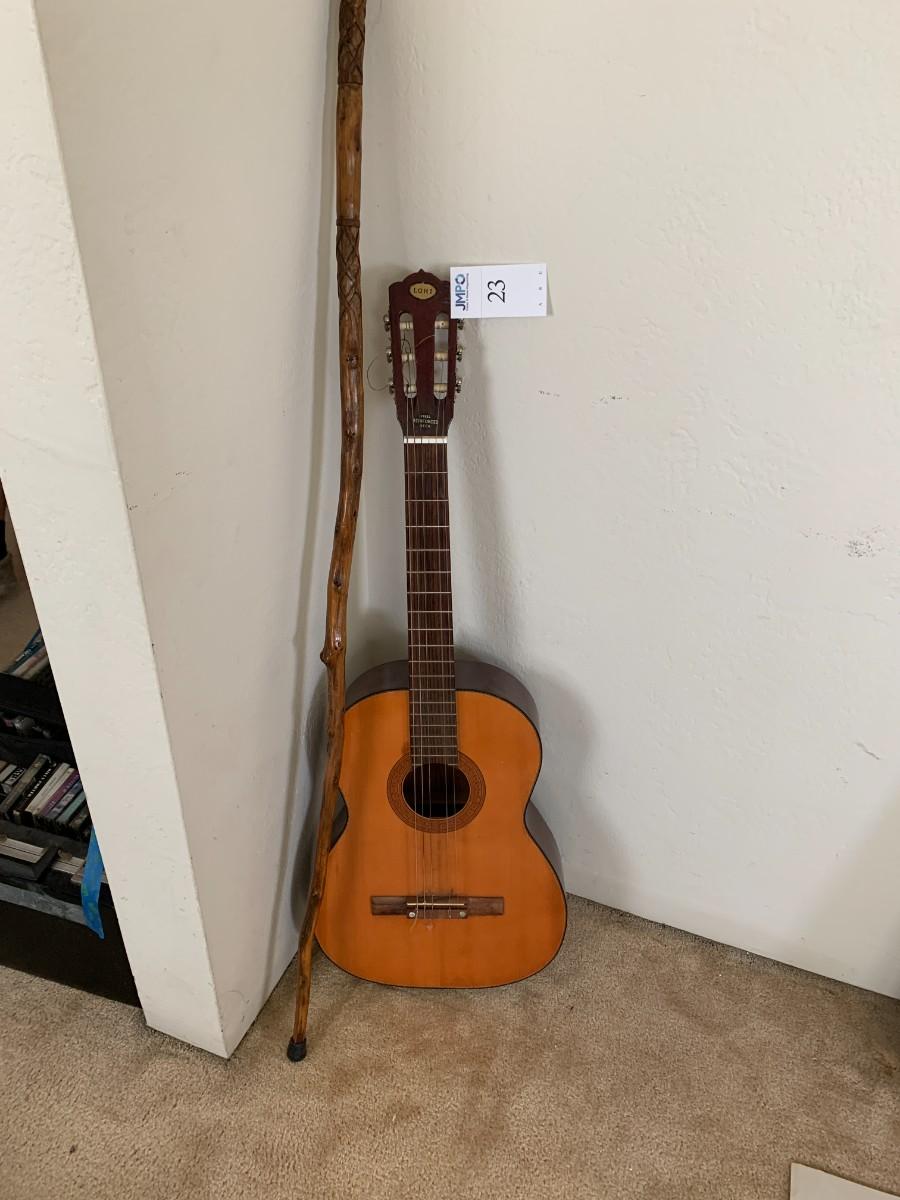Lori acoustic guitar. Significant damage as shown. Walking stick with metal capped handle and rubber capped foot.