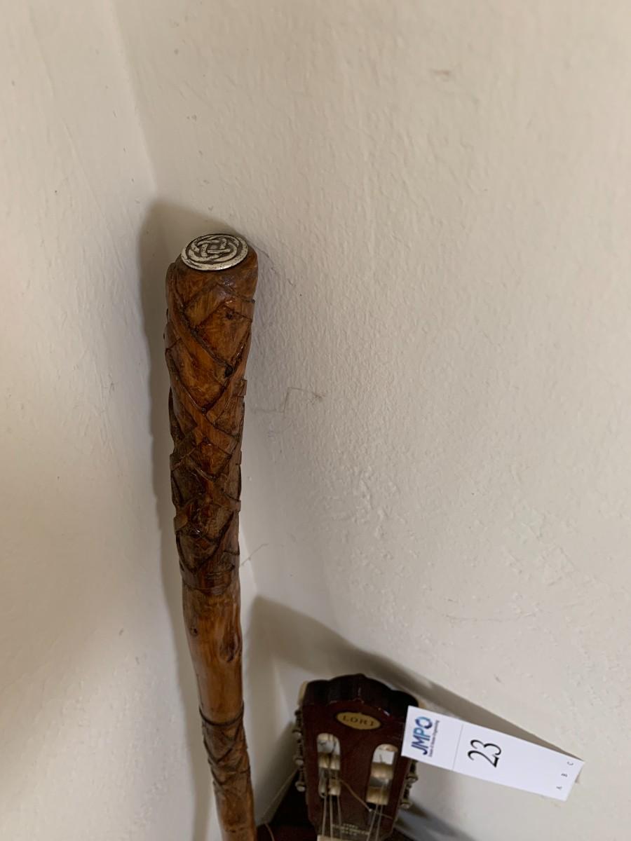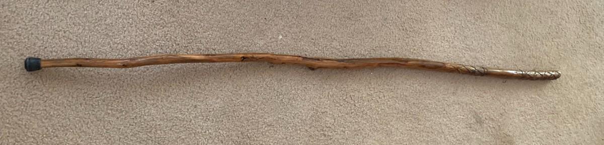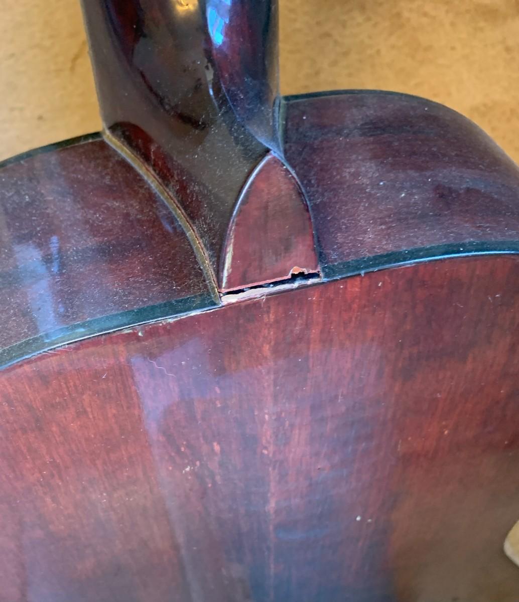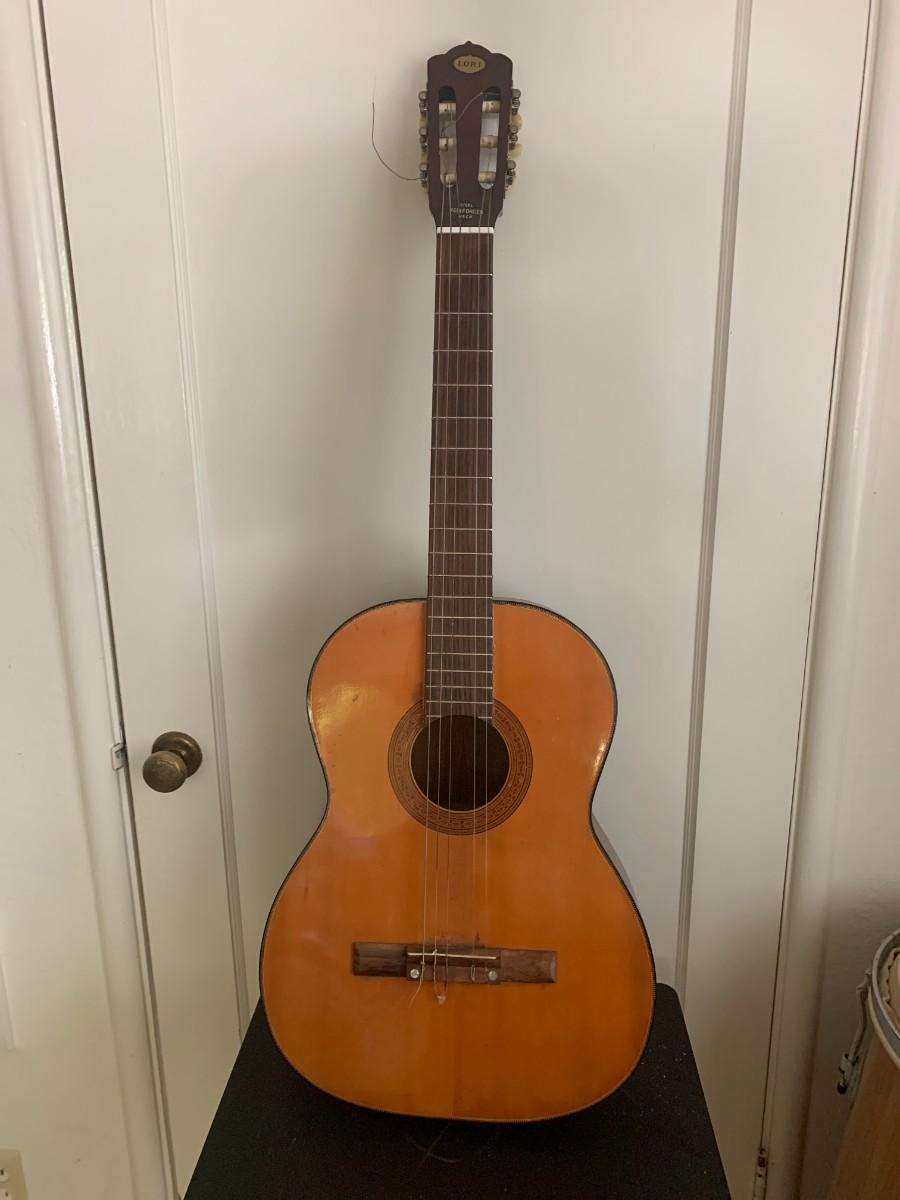 Lori acoustic guitar. Significant damage as shown. Walking stick with metal capped handle and rubber capped foot.