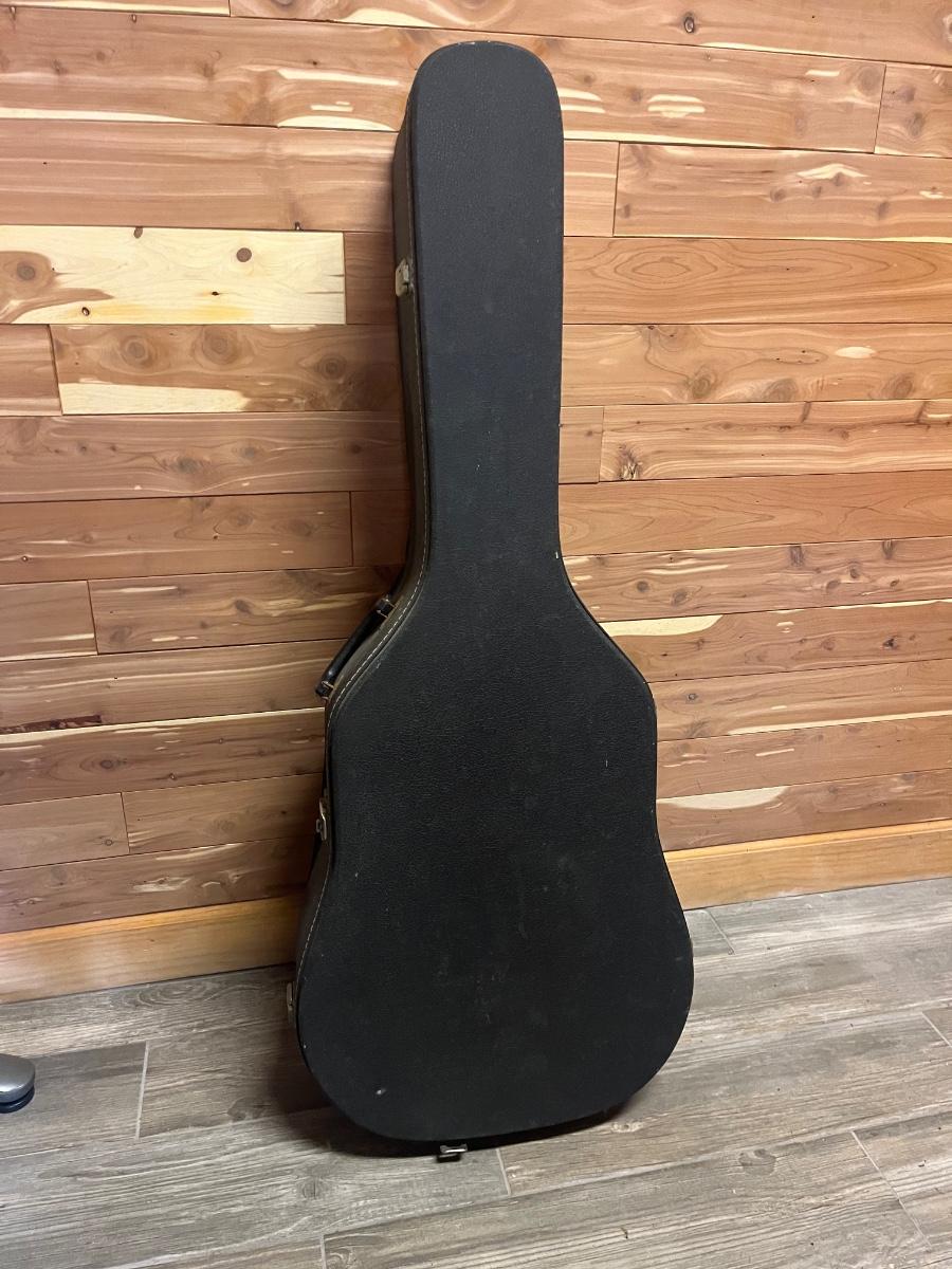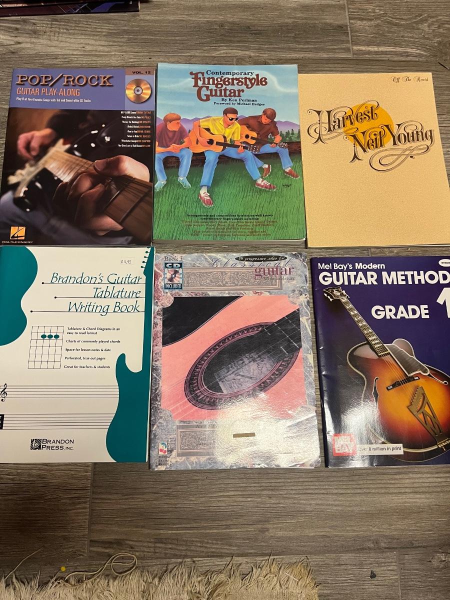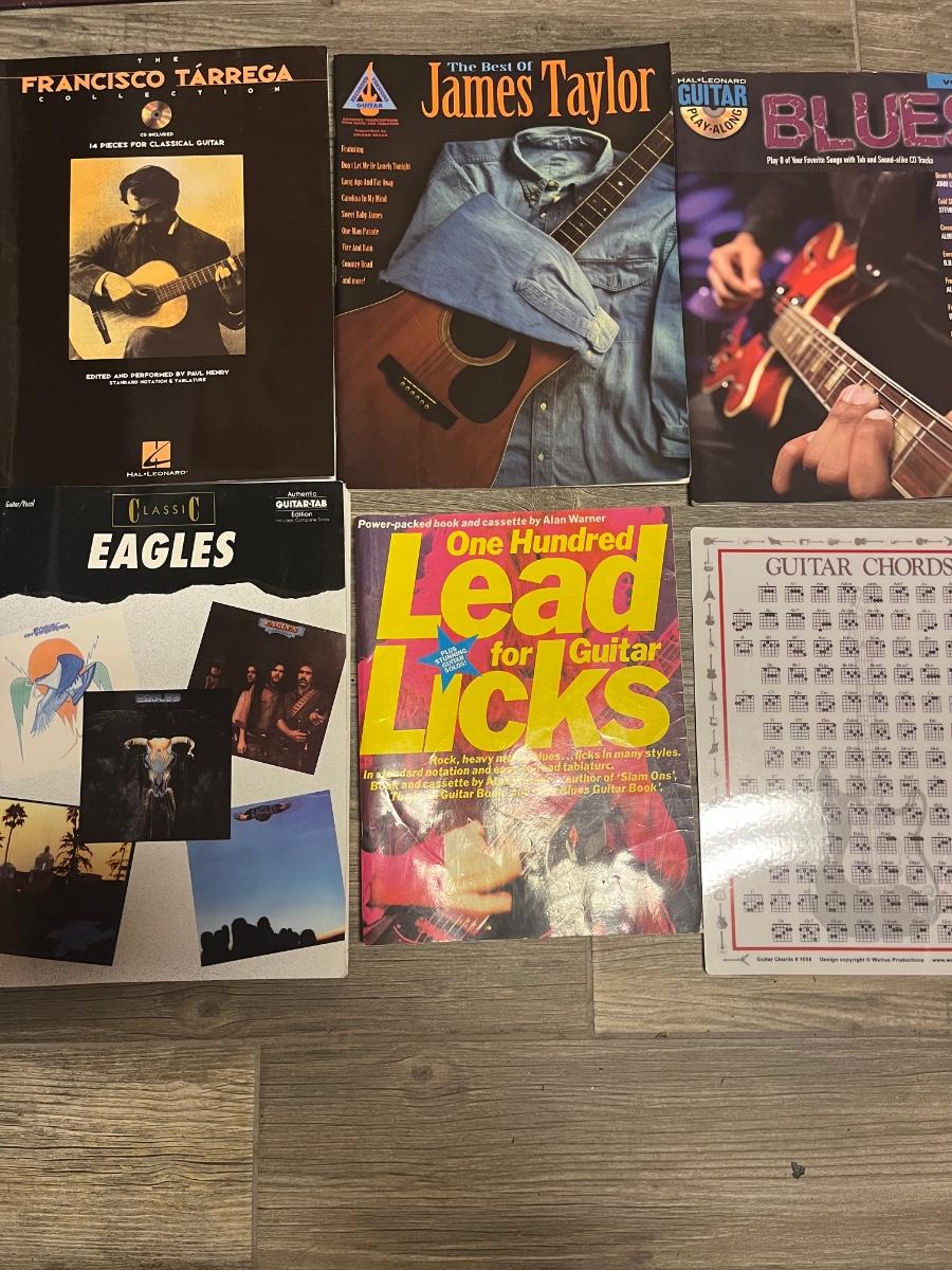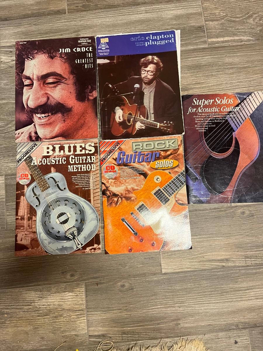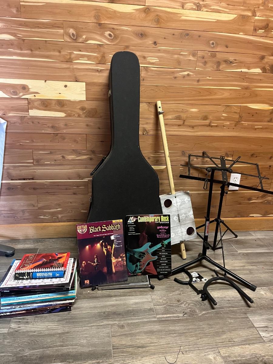 Lot includes unbranded guitar case, over twenty music books that include Jim Croce, James Taylor, Black Sabbath and more. Also includes two freestanding guitar stands, music stand, home-made string instrument and guitar picks. Case measures 6” x 17” x 46”.