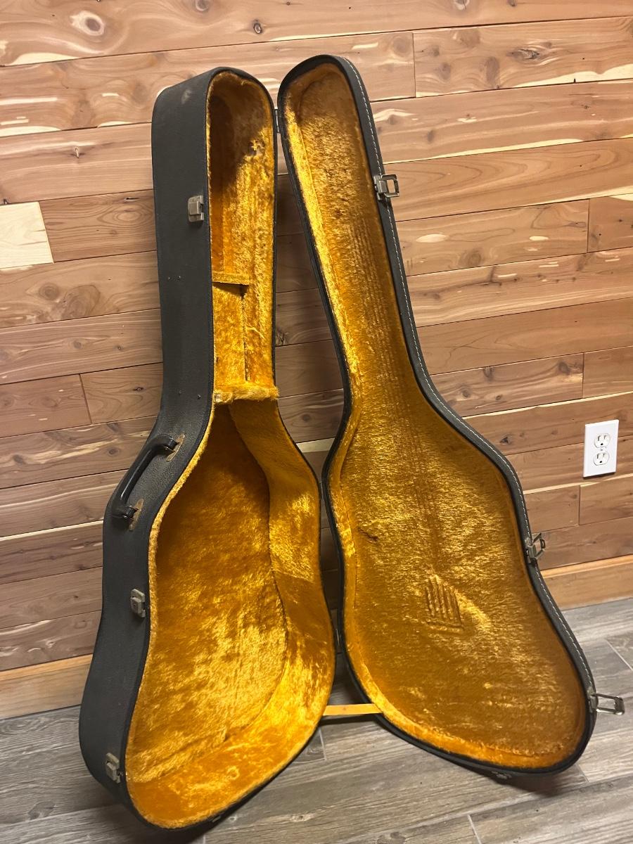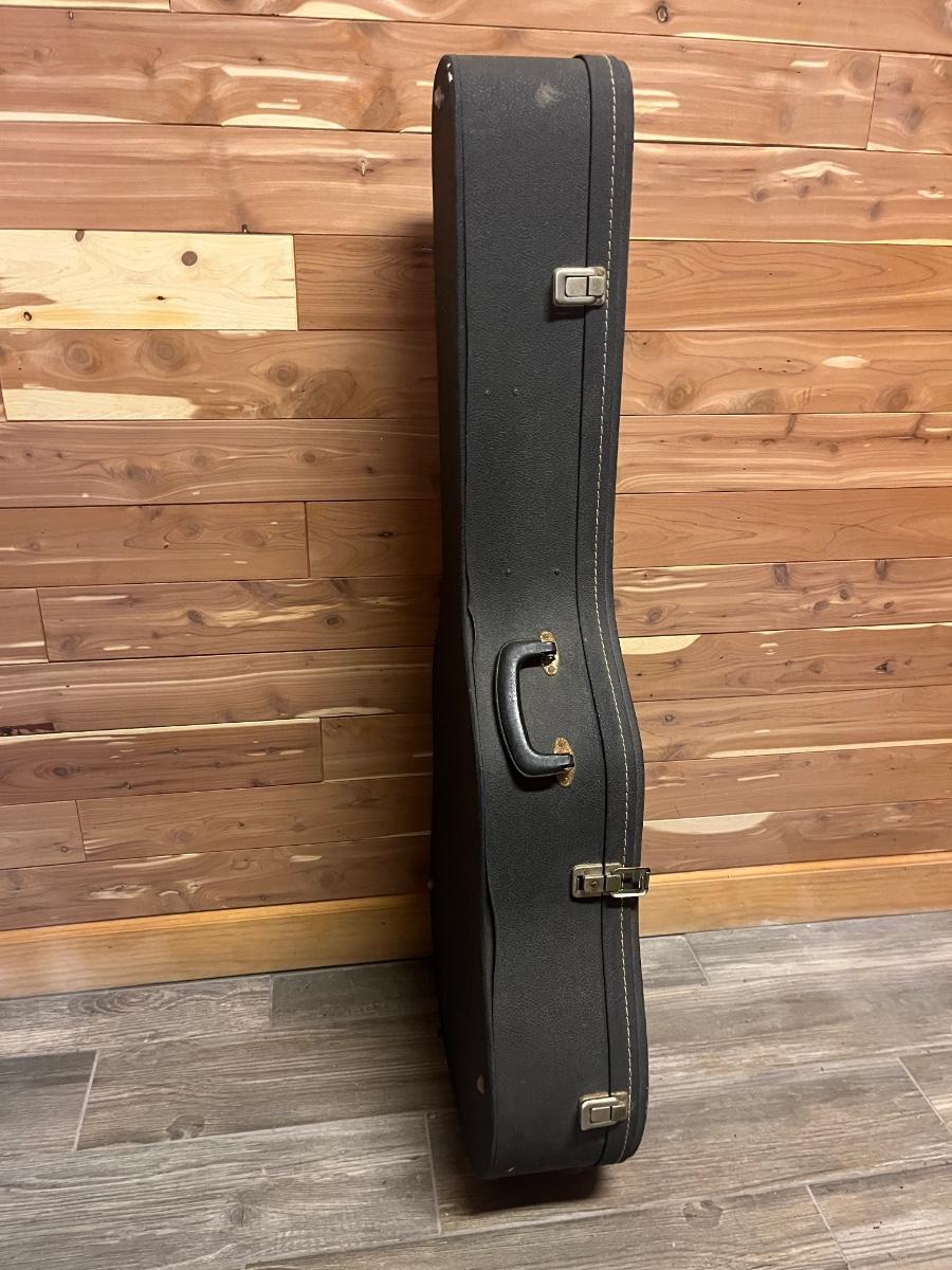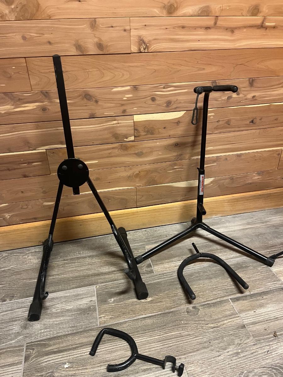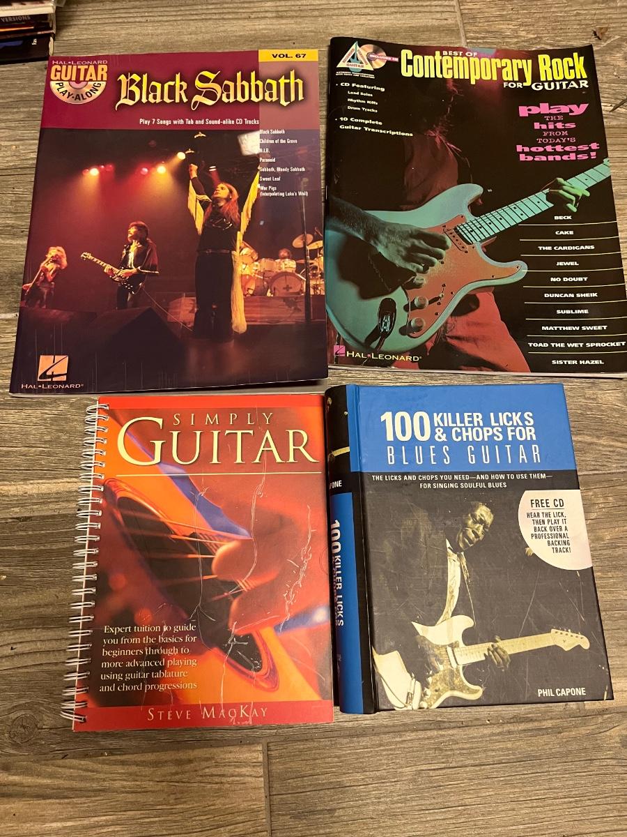 Lot includes unbranded guitar case, over twenty music books that include Jim Croce, James Taylor, Black Sabbath and more. Also includes two freestanding guitar stands, music stand, home-made string instrument and guitar picks. Case measures 6” x 17” x 46”.