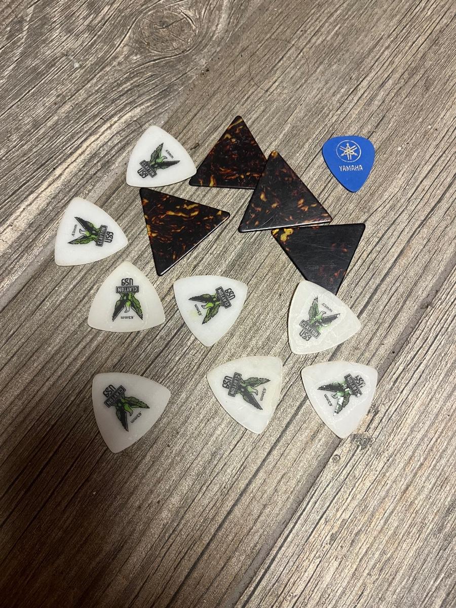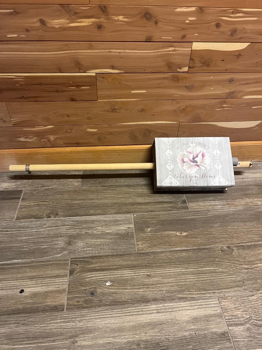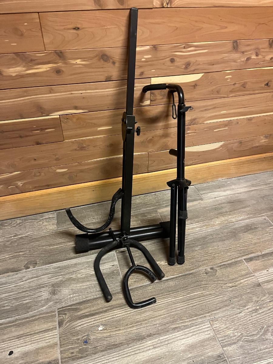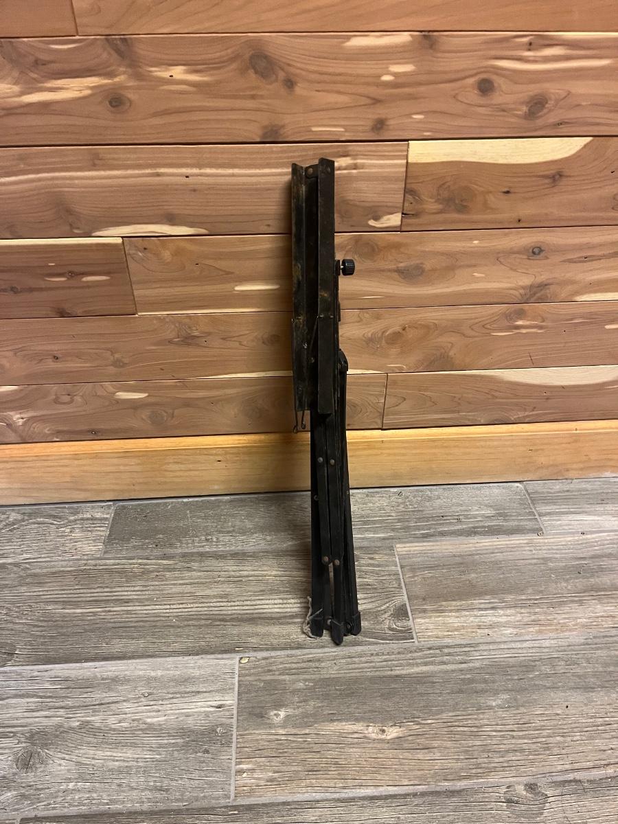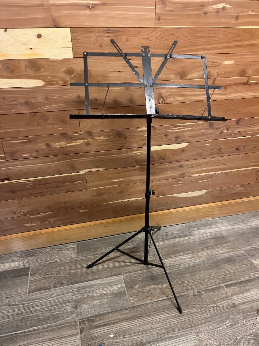 Lot includes unbranded guitar case, over twenty music books that include Jim Croce, James Taylor, Black Sabbath and more. Also includes two freestanding guitar stands, music stand, home-made string instrument and guitar picks. Case measures 6” x 17” x 46”.