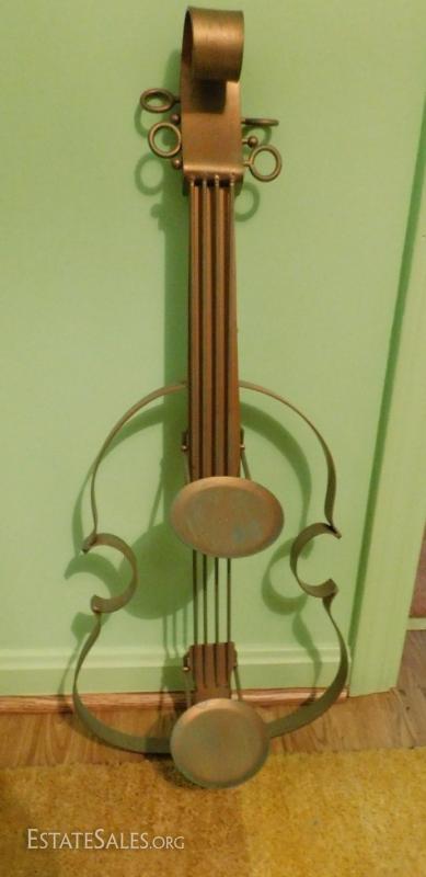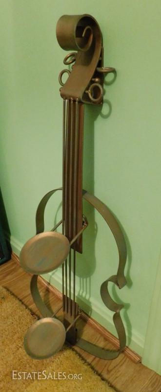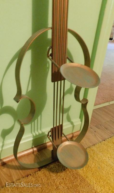 Large metal candle holder in shape of guitar or bass. Very heavy. Good condition.