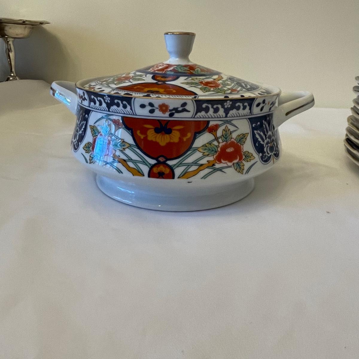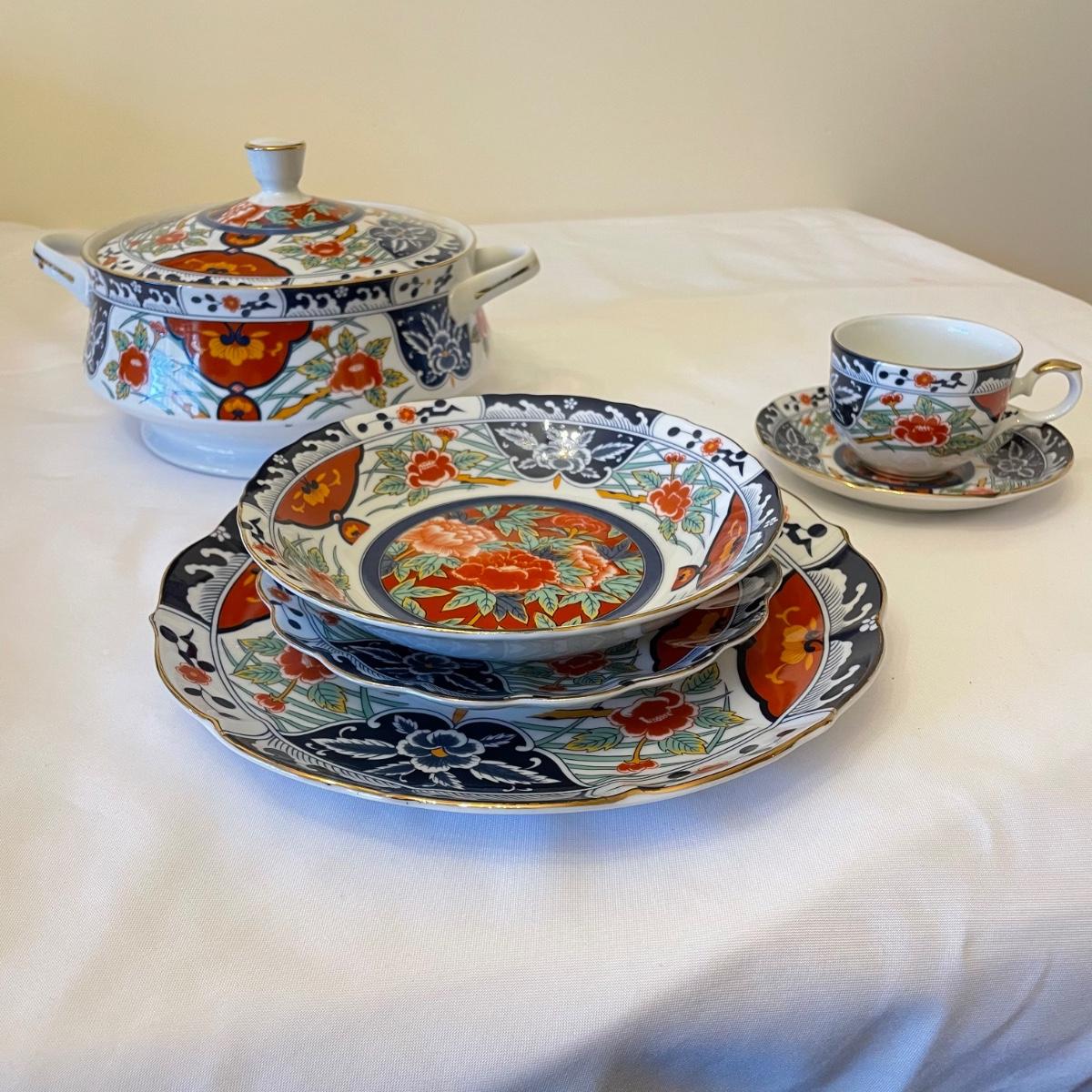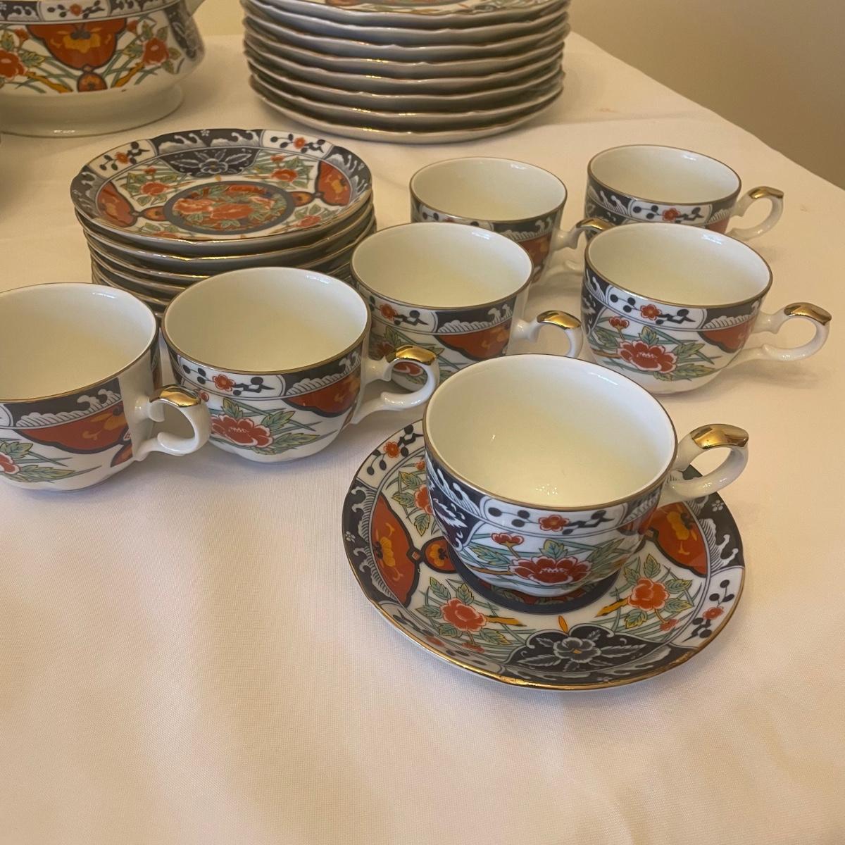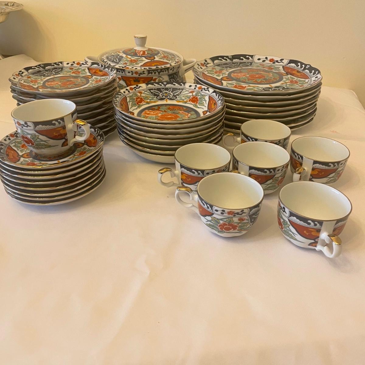 An eight person setting with a total of 40 items. 8 each of dinner plates (10” d), bread plates, soup bowls with 7 teacups and saucers and one large lidded serving bowl as well. Set is in very good condition with no chips, scratches or crazing. Gold rims are also in great condition.
