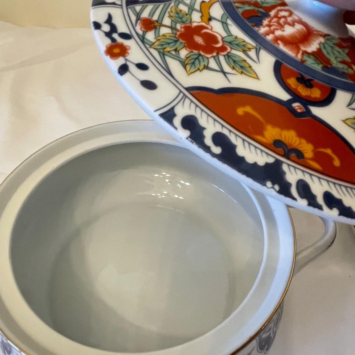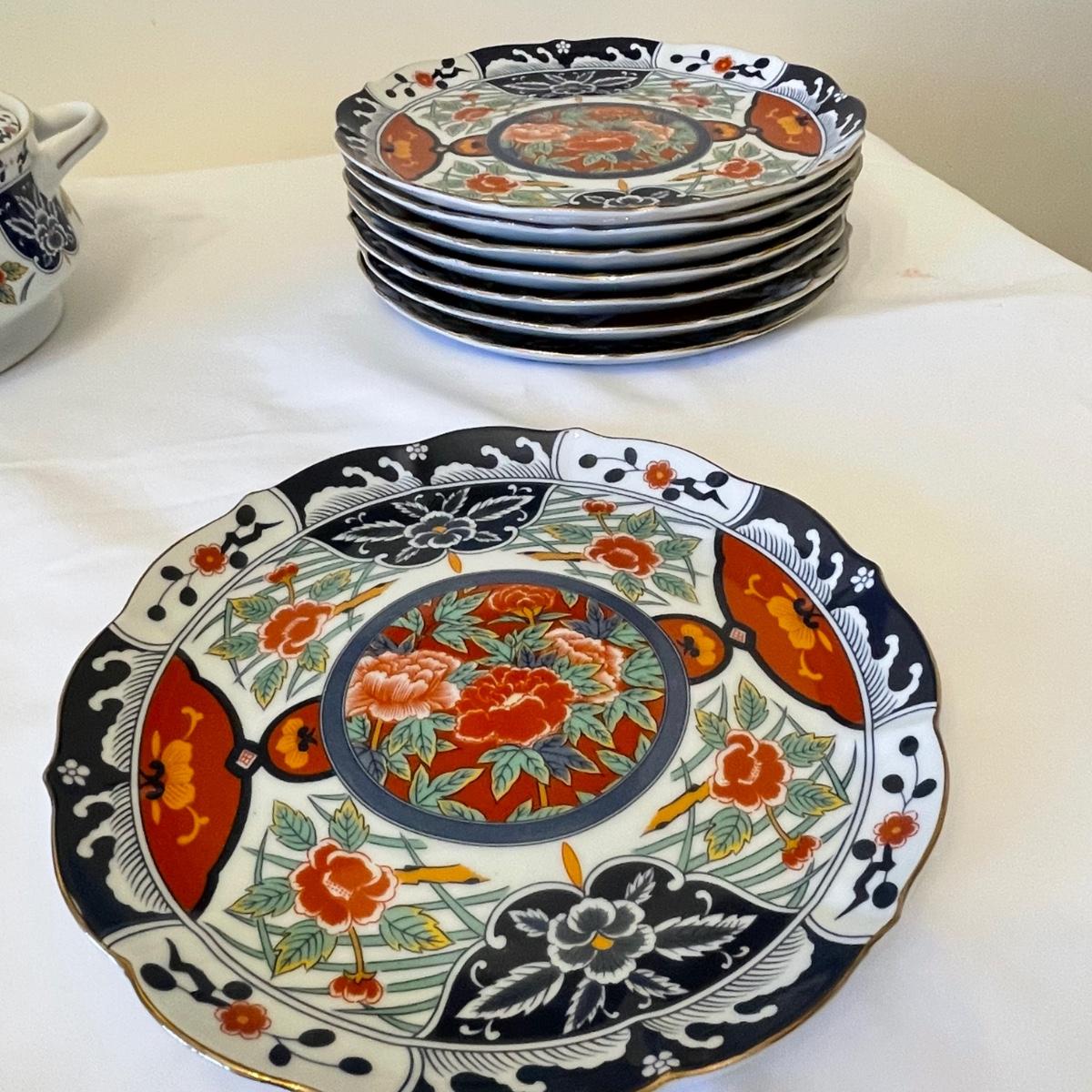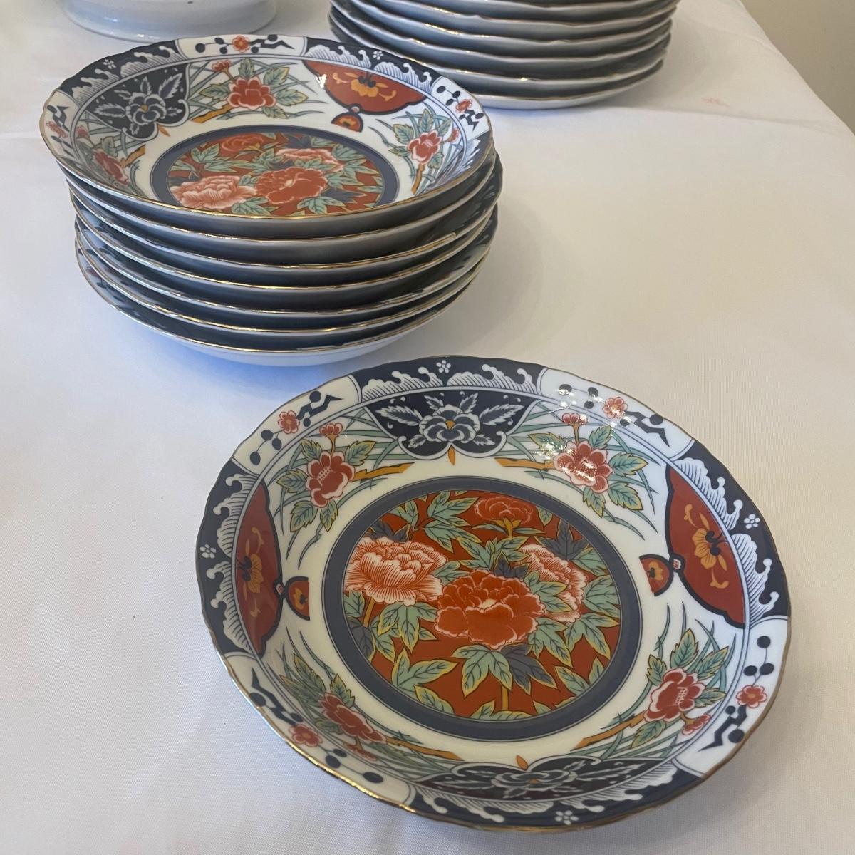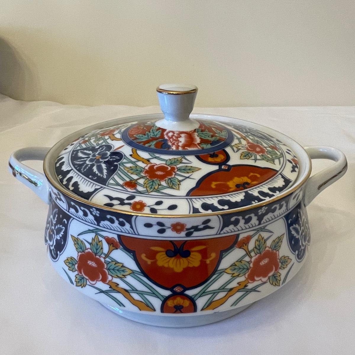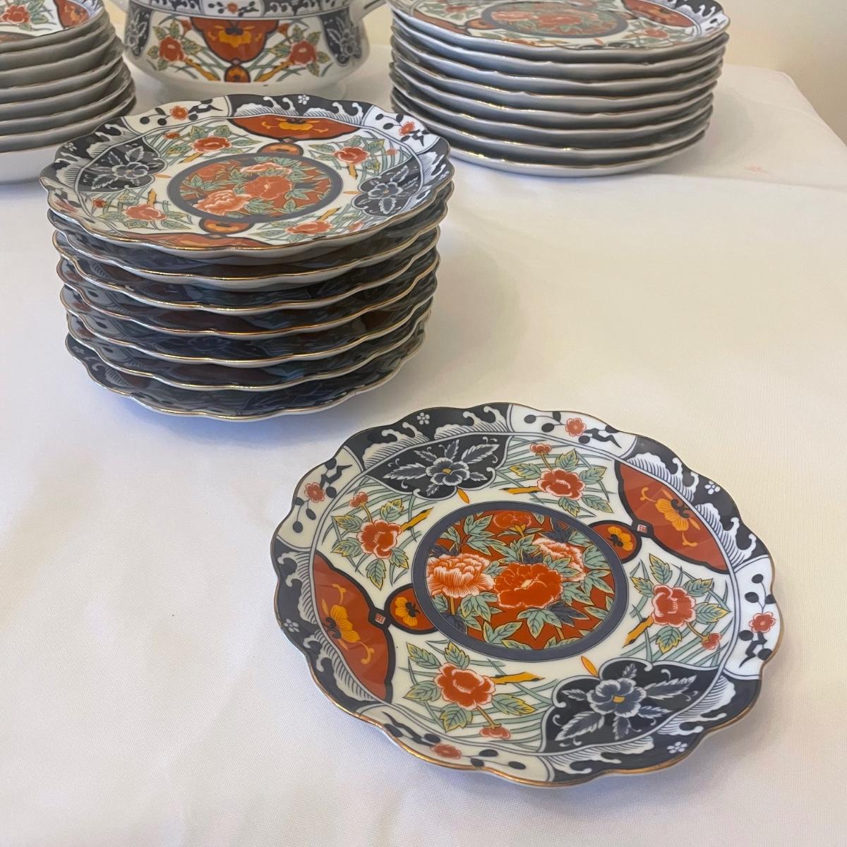 An eight person setting with a total of 40 items. 8 each of dinner plates (10” d), bread plates, soup bowls with 7 teacups and saucers and one large lidded serving bowl as well. Set is in very good condition with no chips, scratches or crazing. Gold rims are also in great condition.