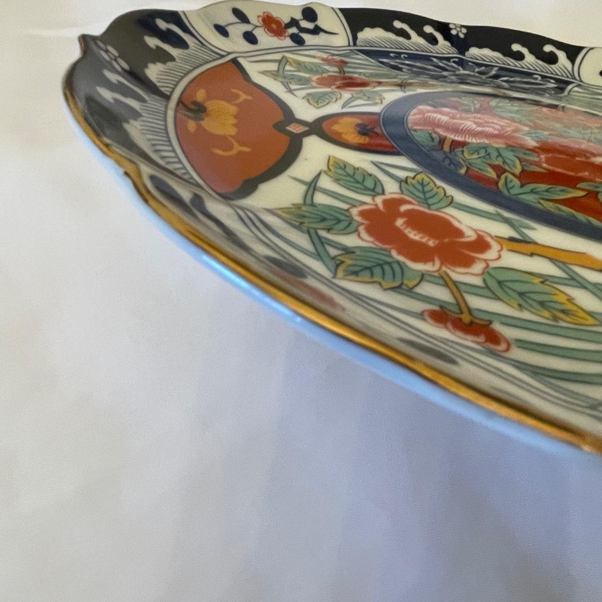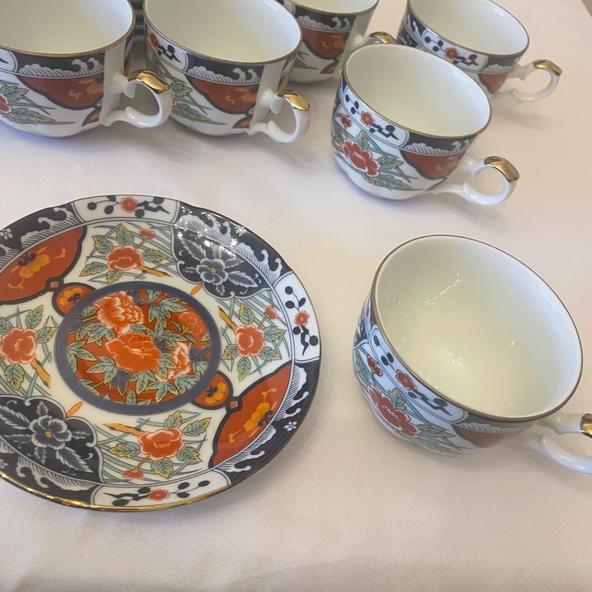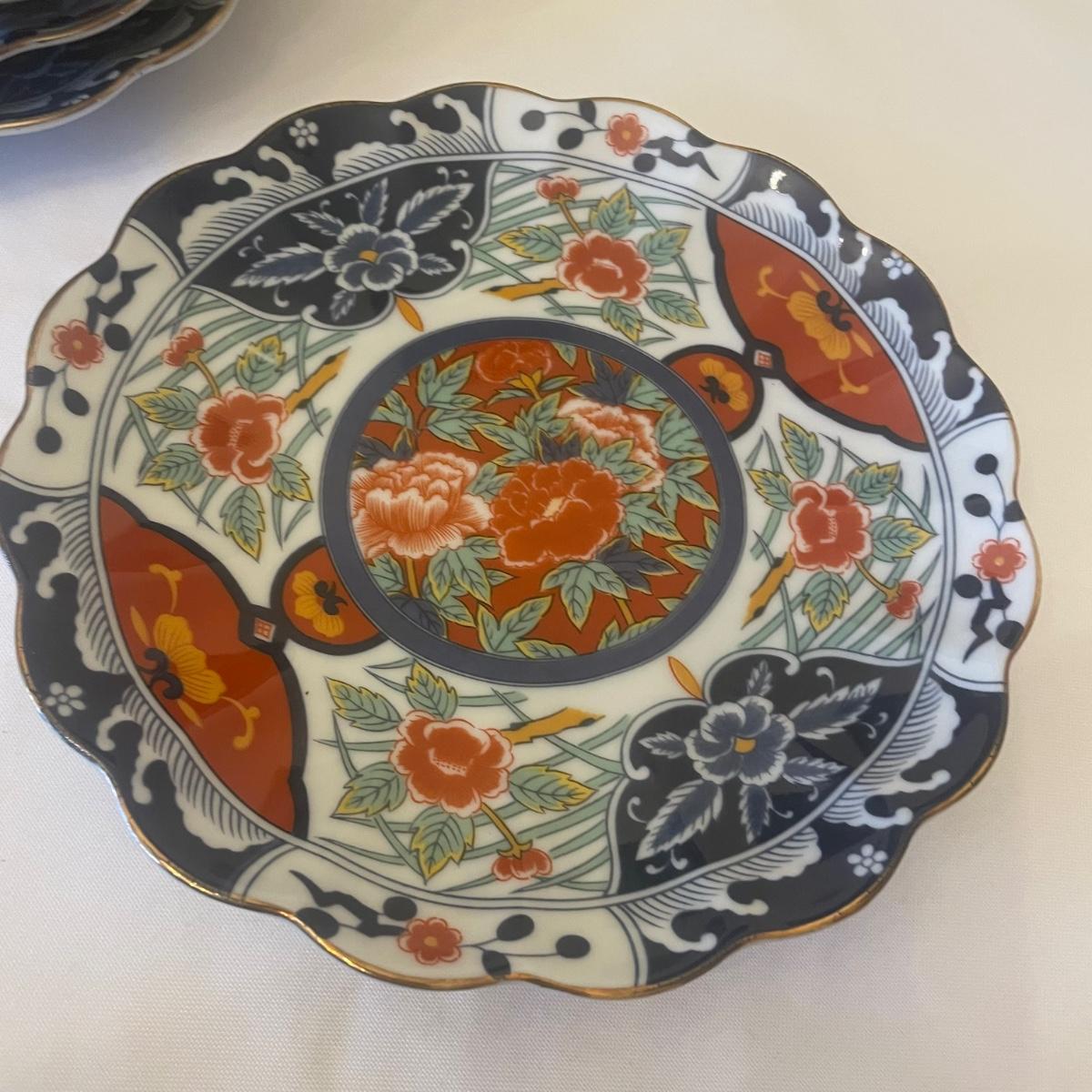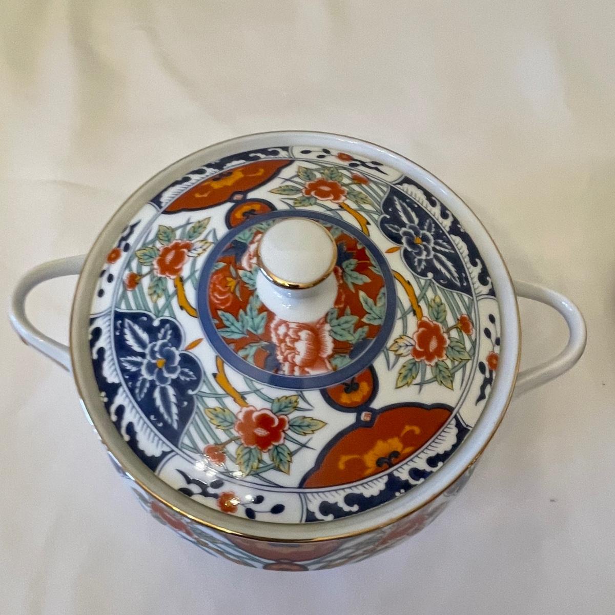 An eight person setting with a total of 40 items. 8 each of dinner plates (10” d), bread plates, soup bowls with 7 teacups and saucers and one large lidded serving bowl as well. Set is in very good condition with no chips, scratches or crazing. Gold rims are also in great condition.