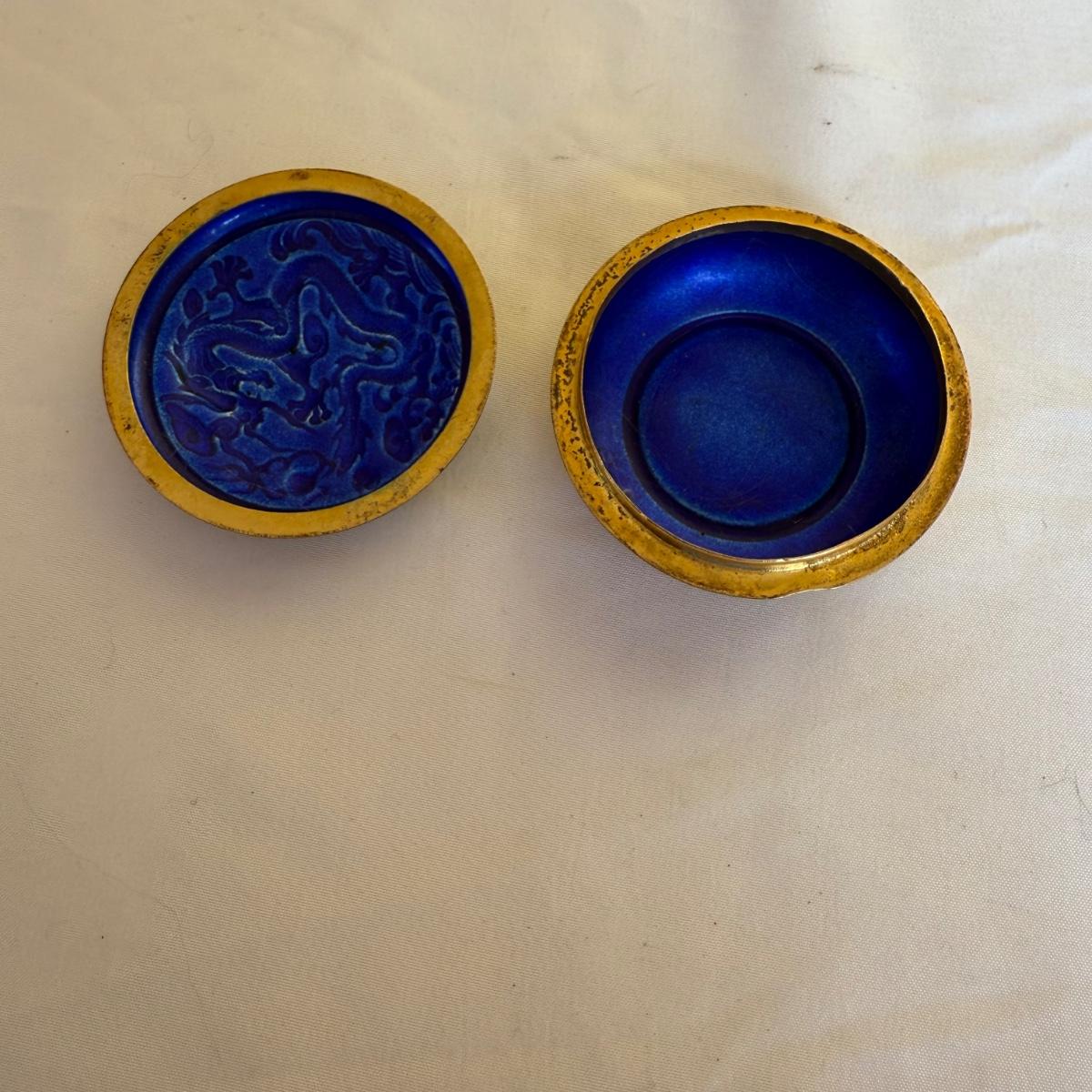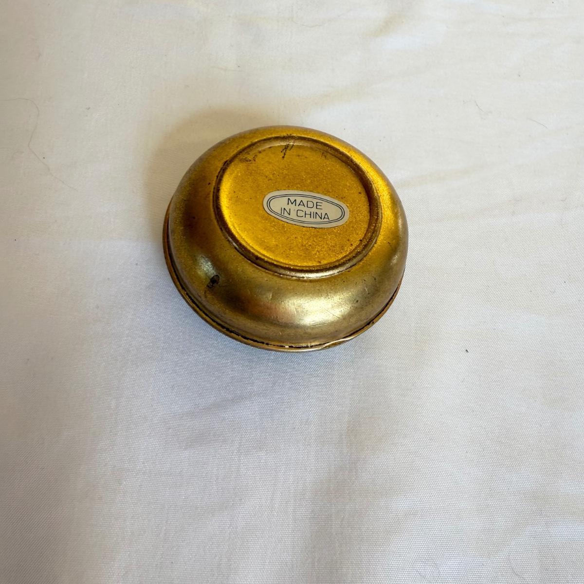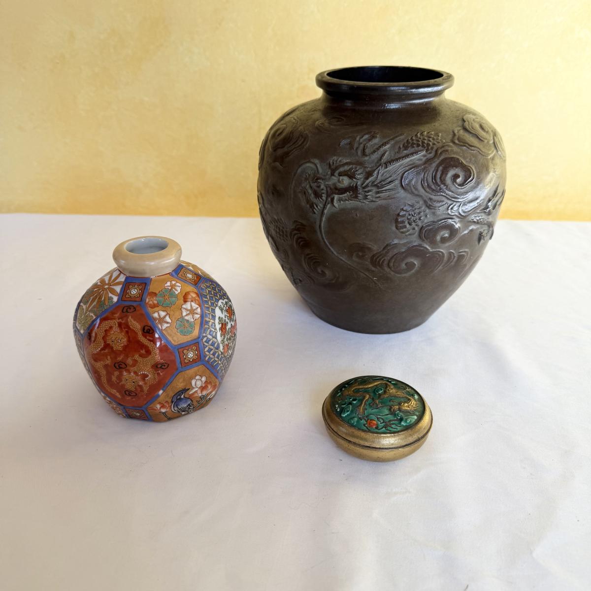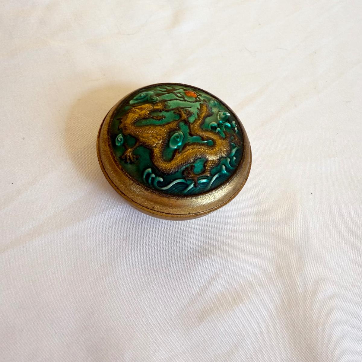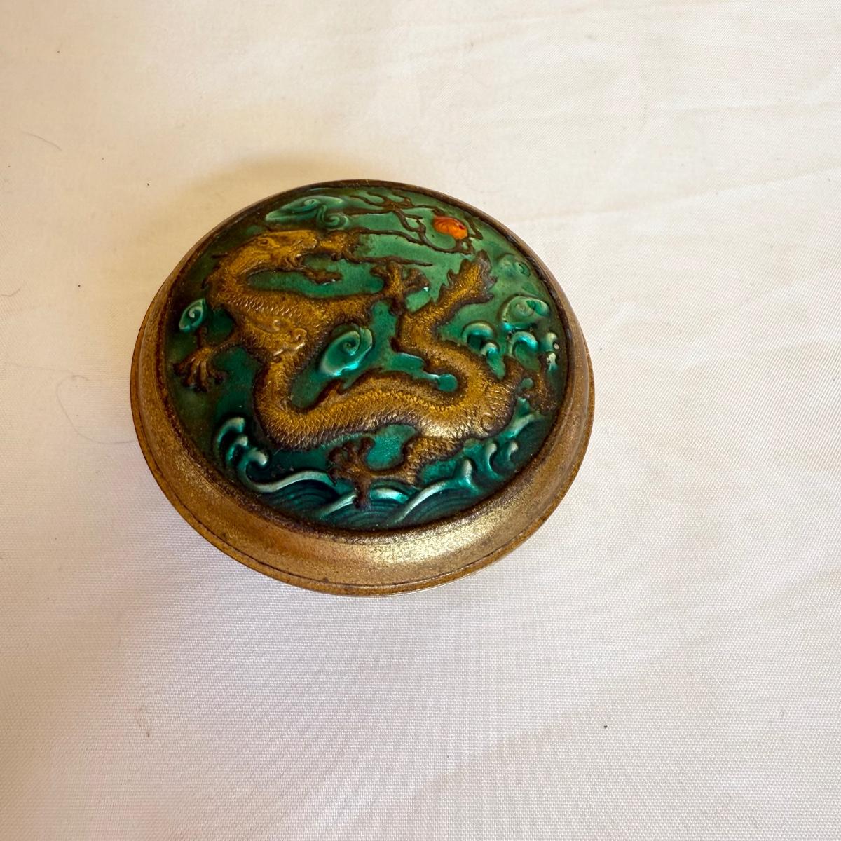 This lot contains a total of three dragon inspired items. The first is a small glass ornate Gump’s vase with dragons, flowers and birds. It measures 3”D at the base and stands 4”H. The next is another ornate dragon themed vase that appears to be made of metal. The base has a 4”D and the thickest part of the vase measures approximately 7”D and it stands 7”H. The last item is a small metal box with a dragon on the lid. It measures 2.5”D x 1”H. Shipping available.