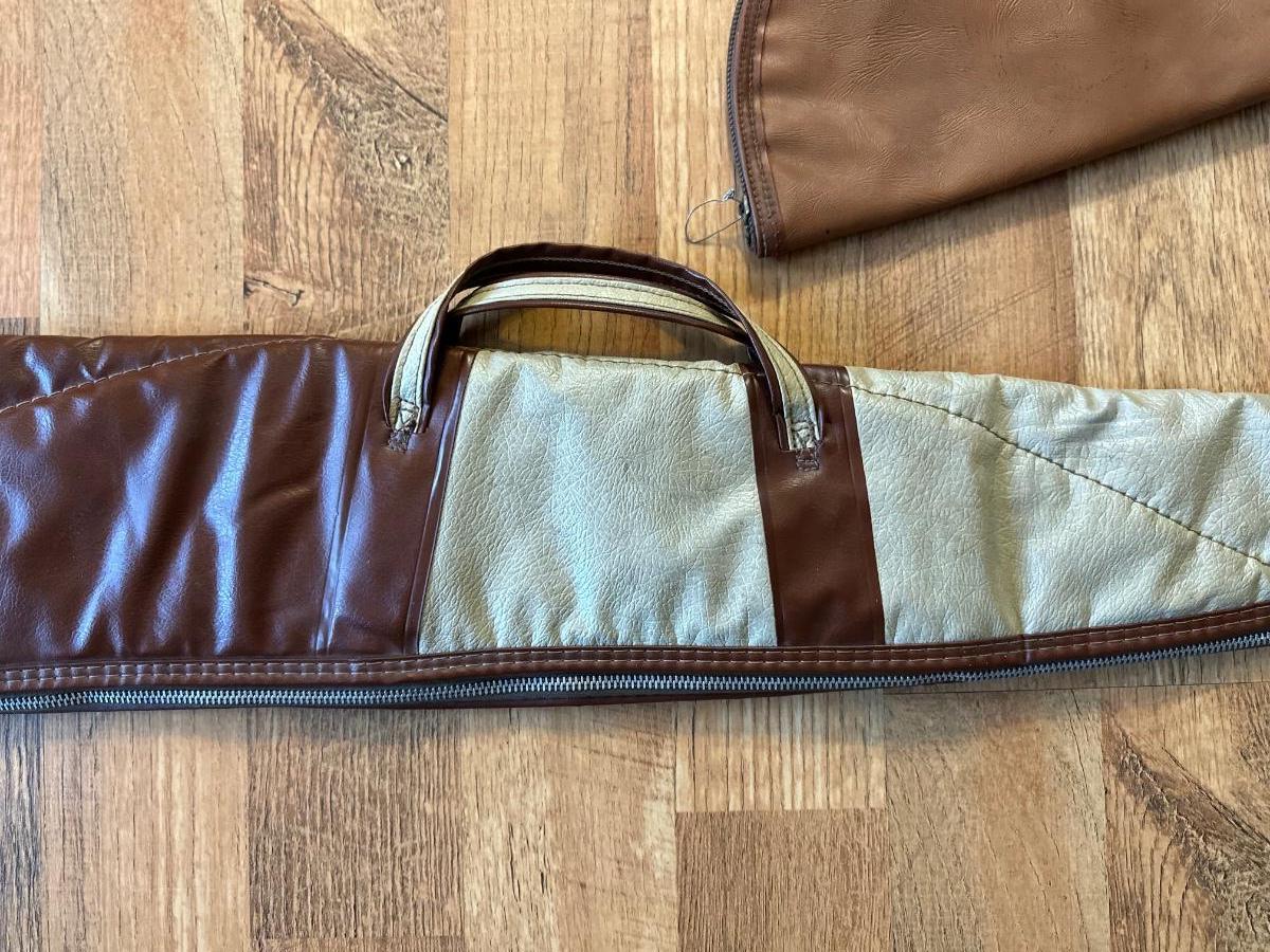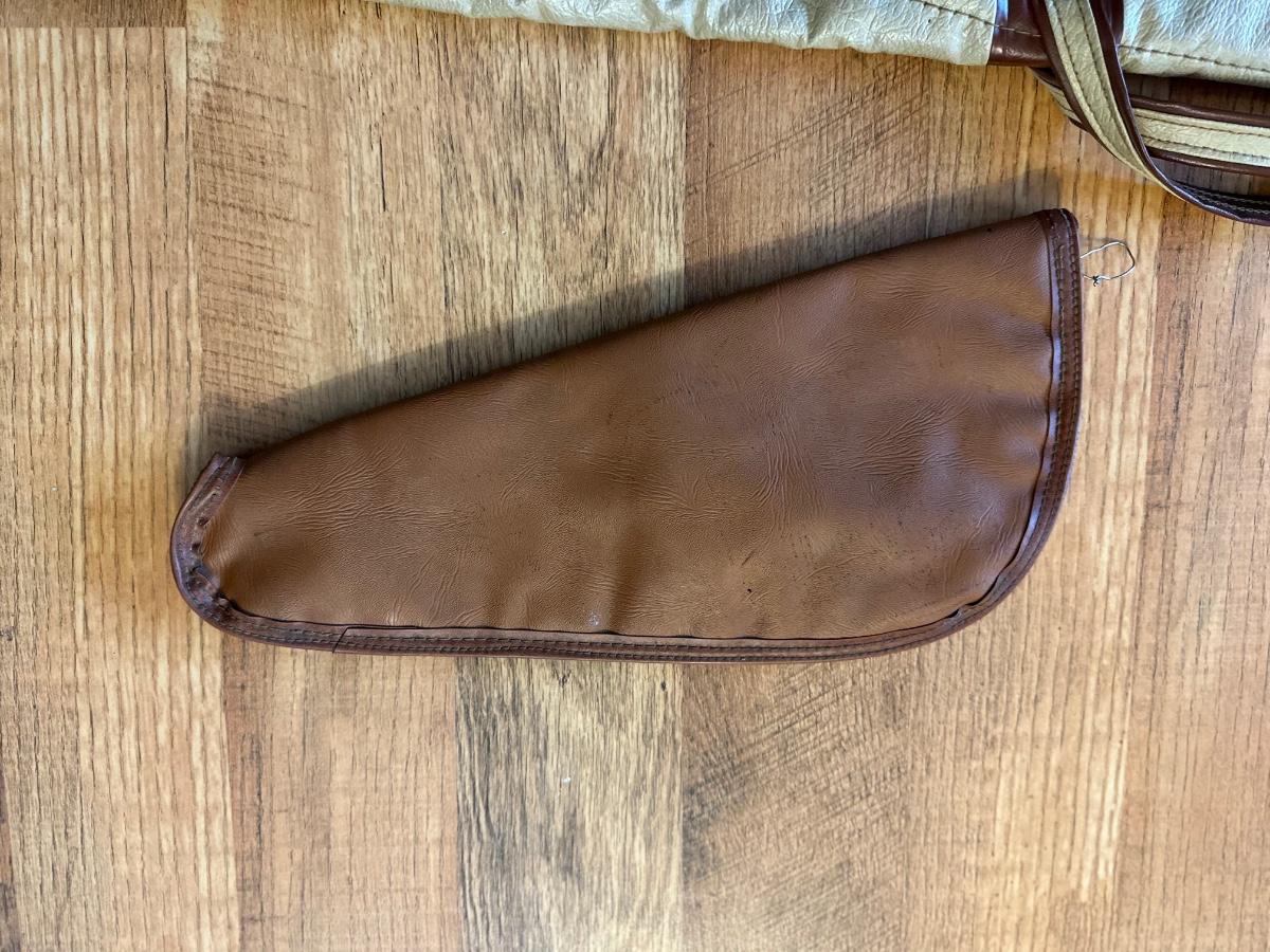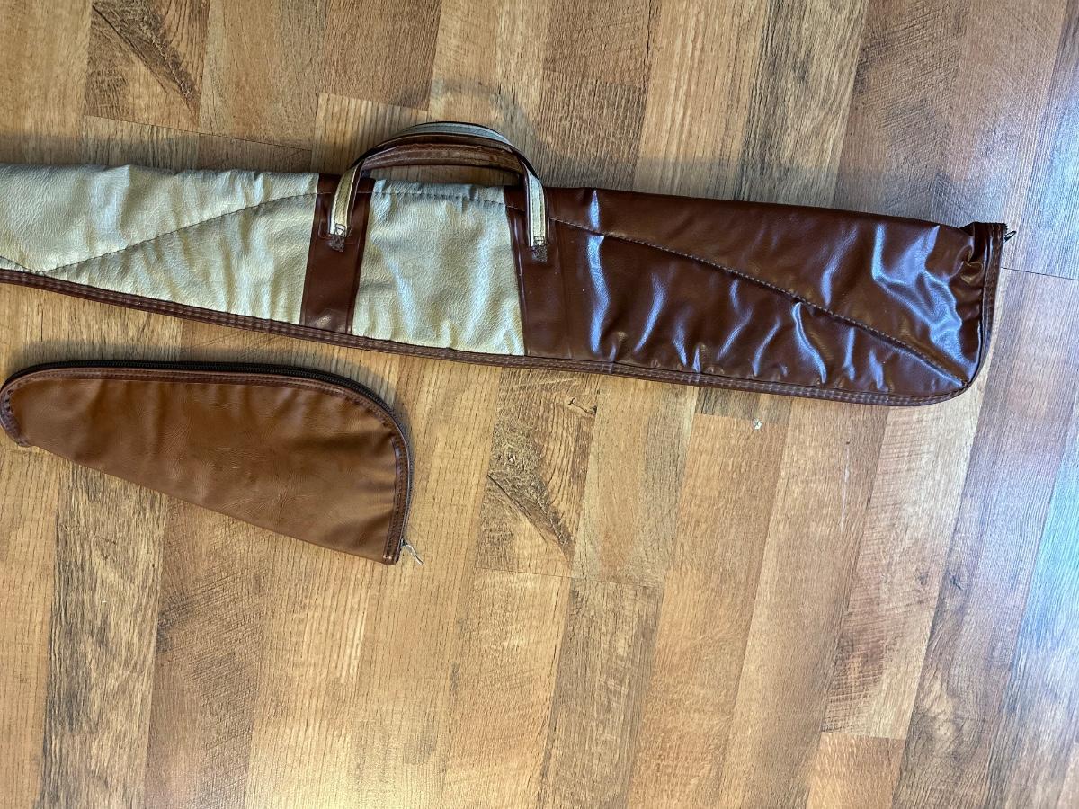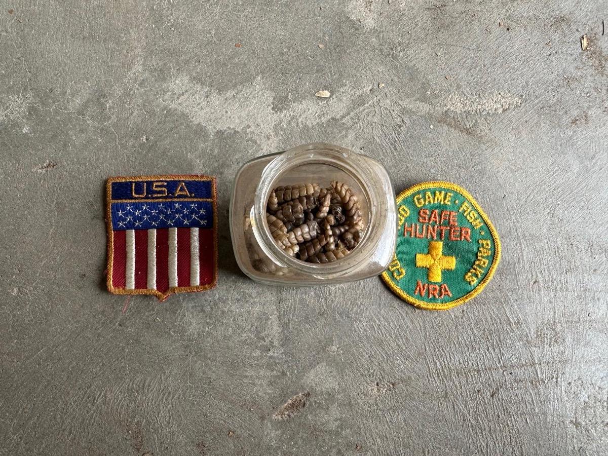 Brown and Cream colored rifle case and Brown colored pistol case. Small jar of rattlesnake rattlers and 2 patches.