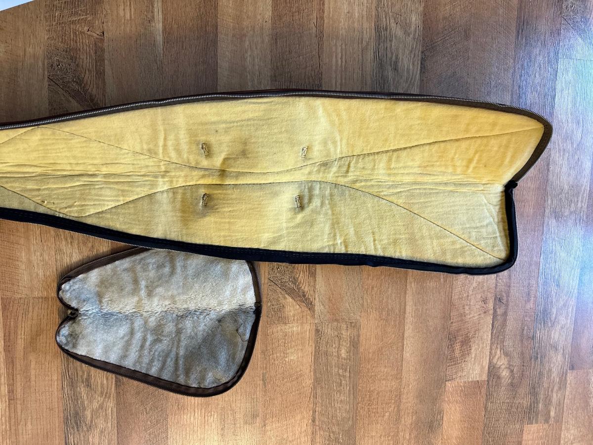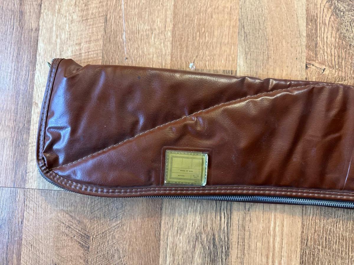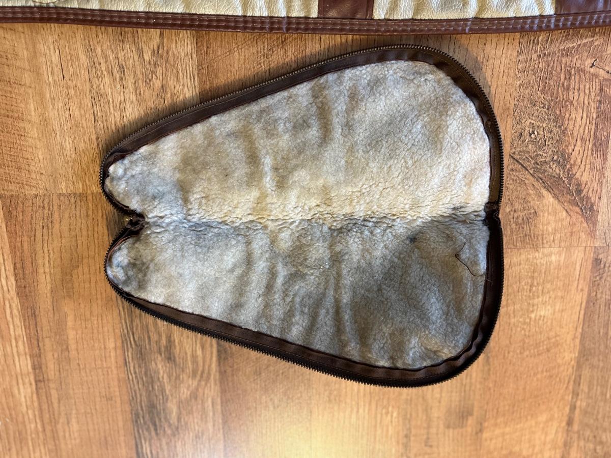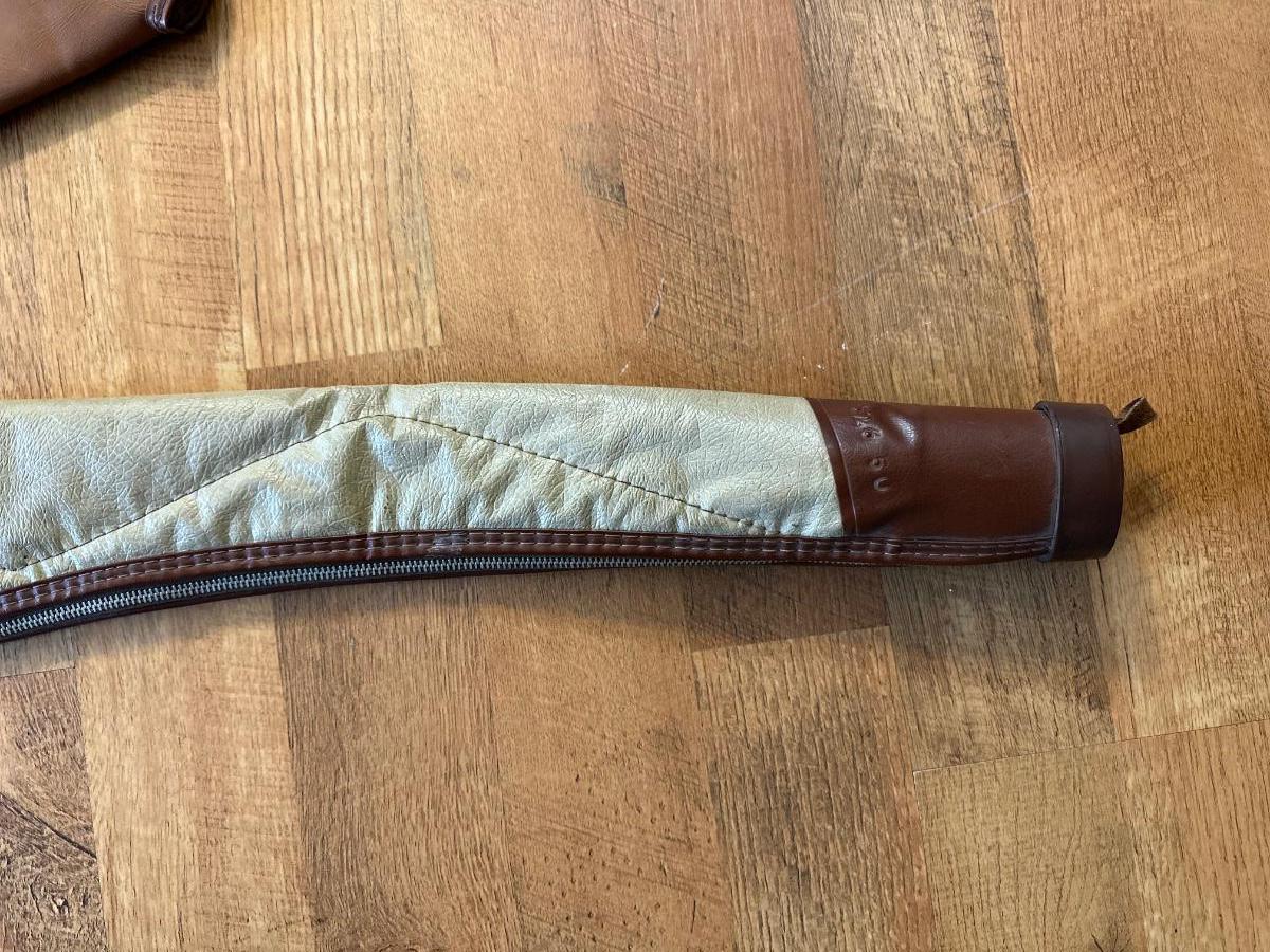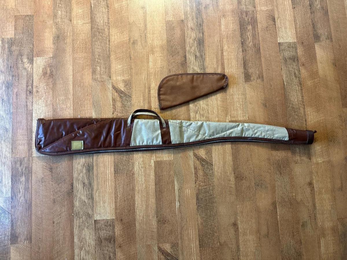 Brown and Cream colored rifle case and Brown colored pistol case. Small jar of rattlesnake rattlers and 2 patches.