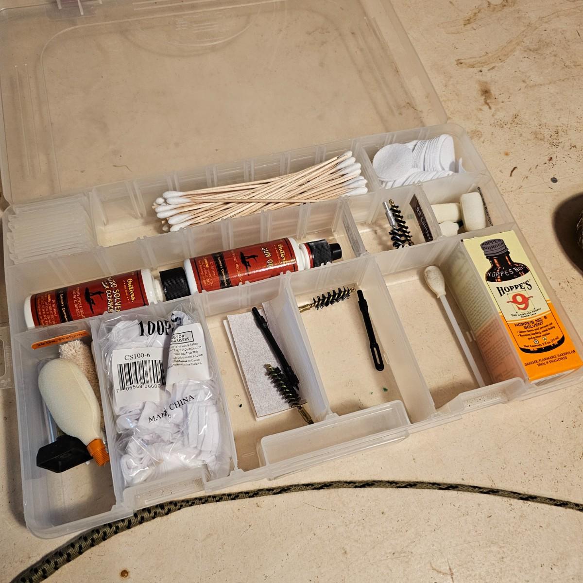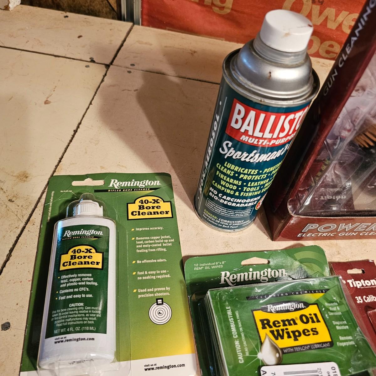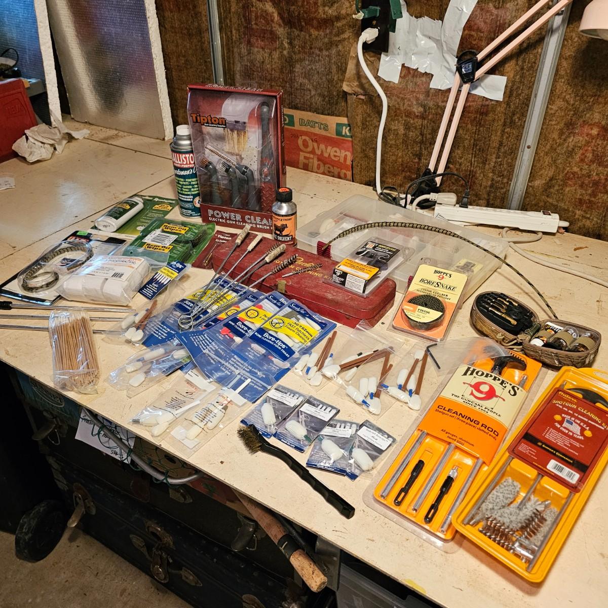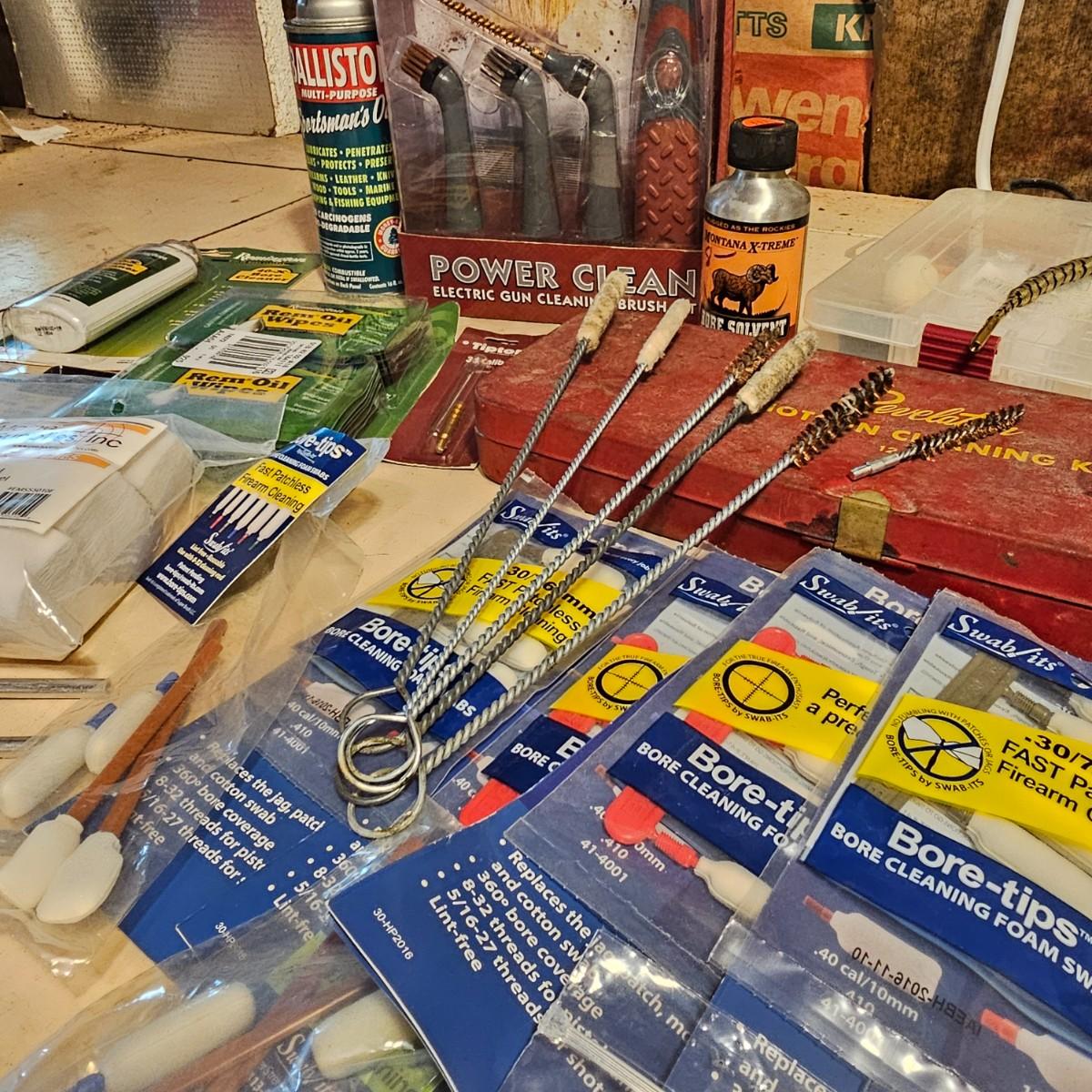 Cleaning supplies, solvents, scrubber, bore snakes and more. Several pre-packaged kits for .22, shotgun and other calibers. One Power Clean battery-operated set. (Untested). Bore tips, pads, patches. Some items used, some newer. See photos for details. Local pickup only.