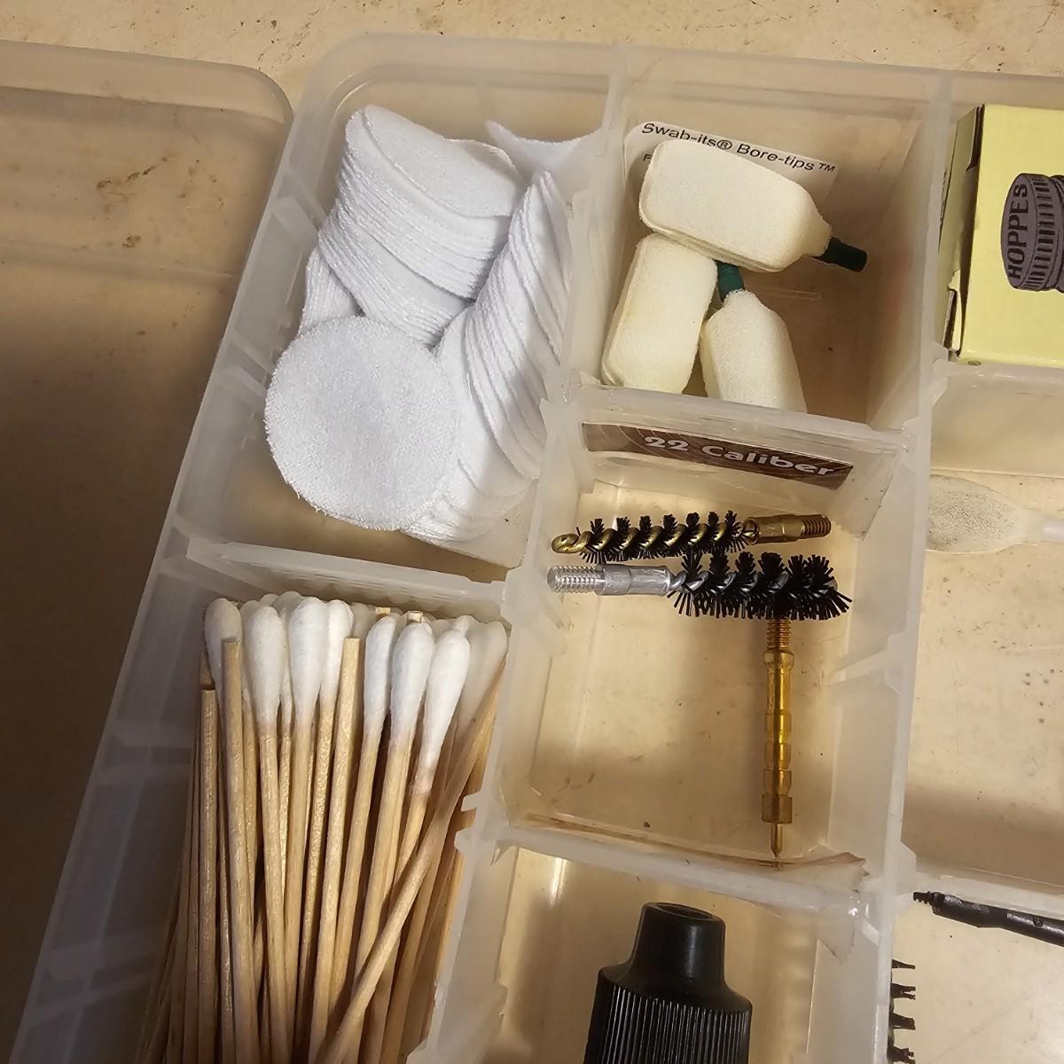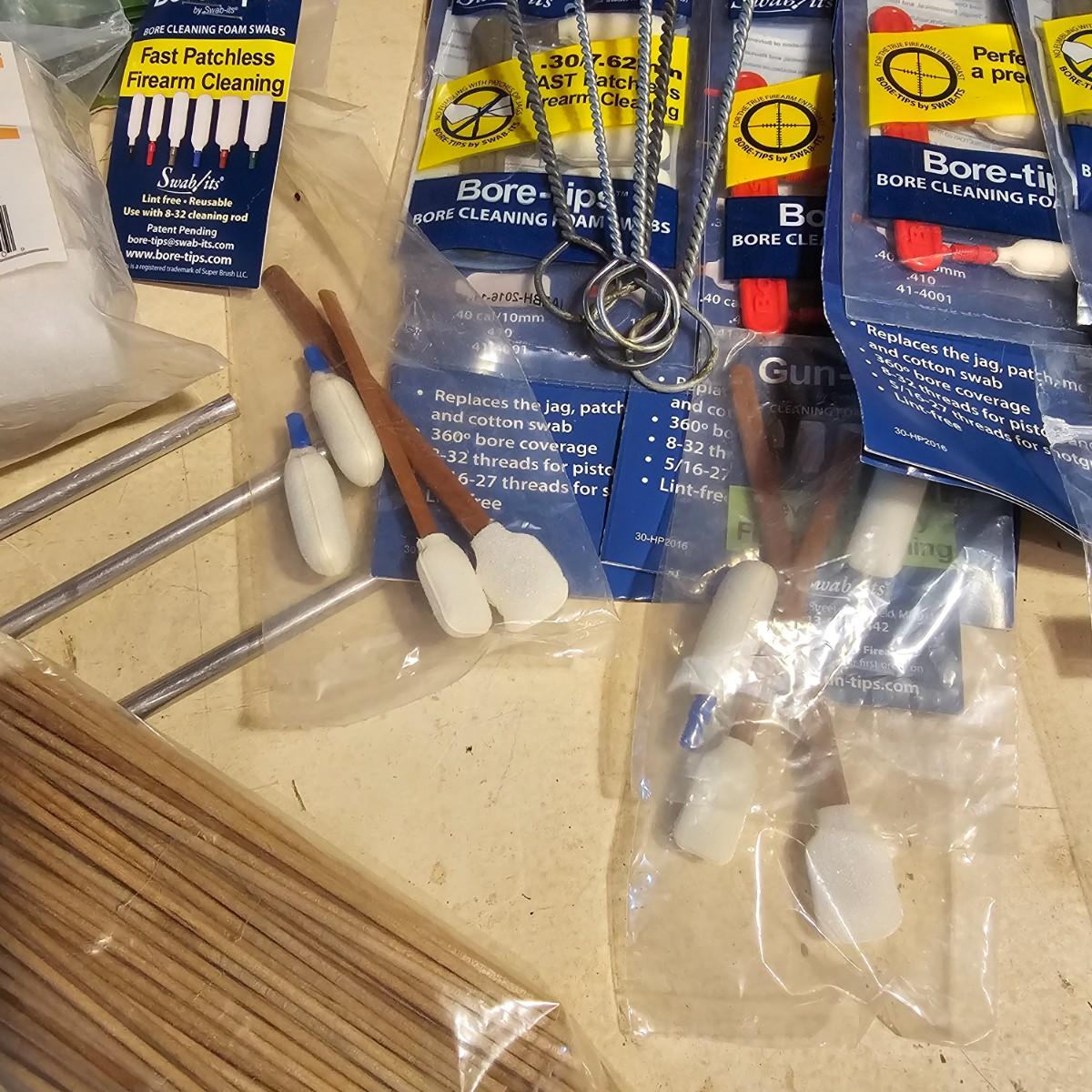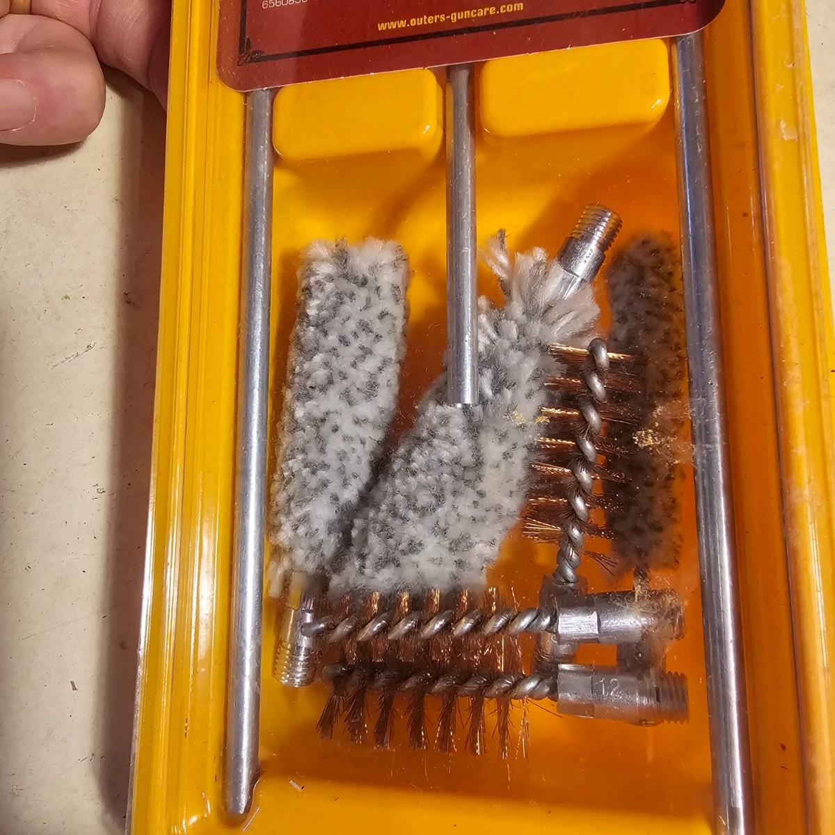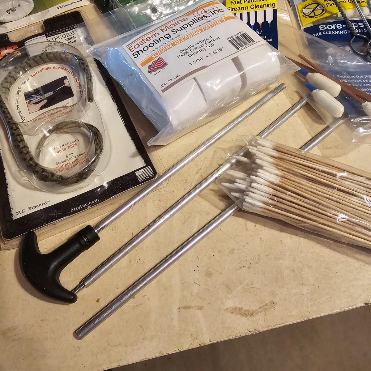 Cleaning supplies, solvents, scrubber, bore snakes and more. Several pre-packaged kits for .22, shotgun and other calibers. One Power Clean battery-operated set. (Untested). Bore tips, pads, patches. Some items used, some newer. See photos for details. Local pickup only.