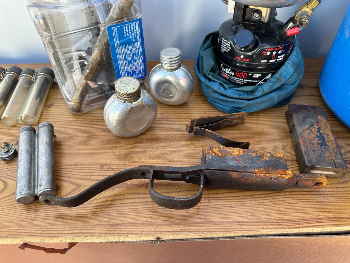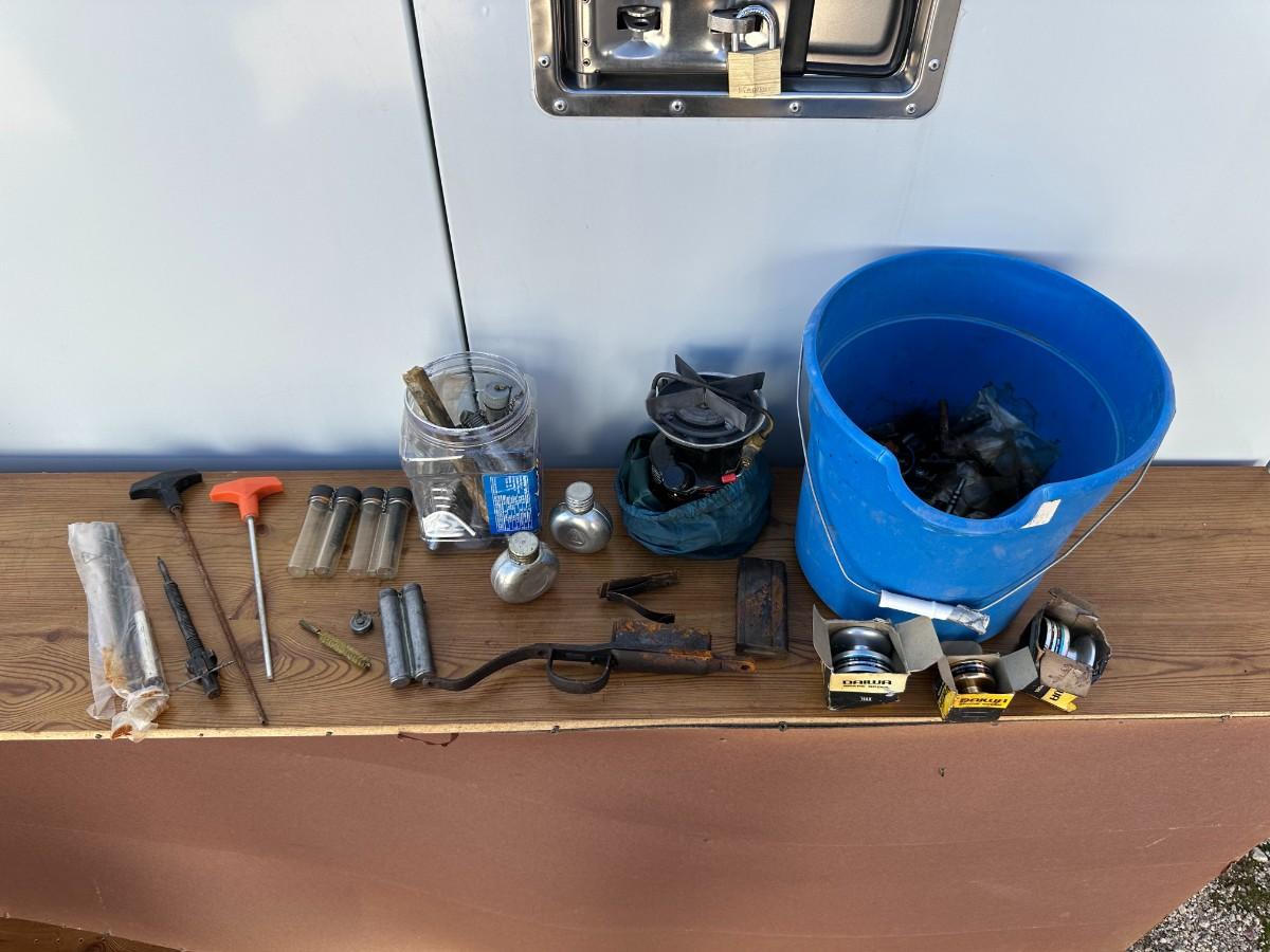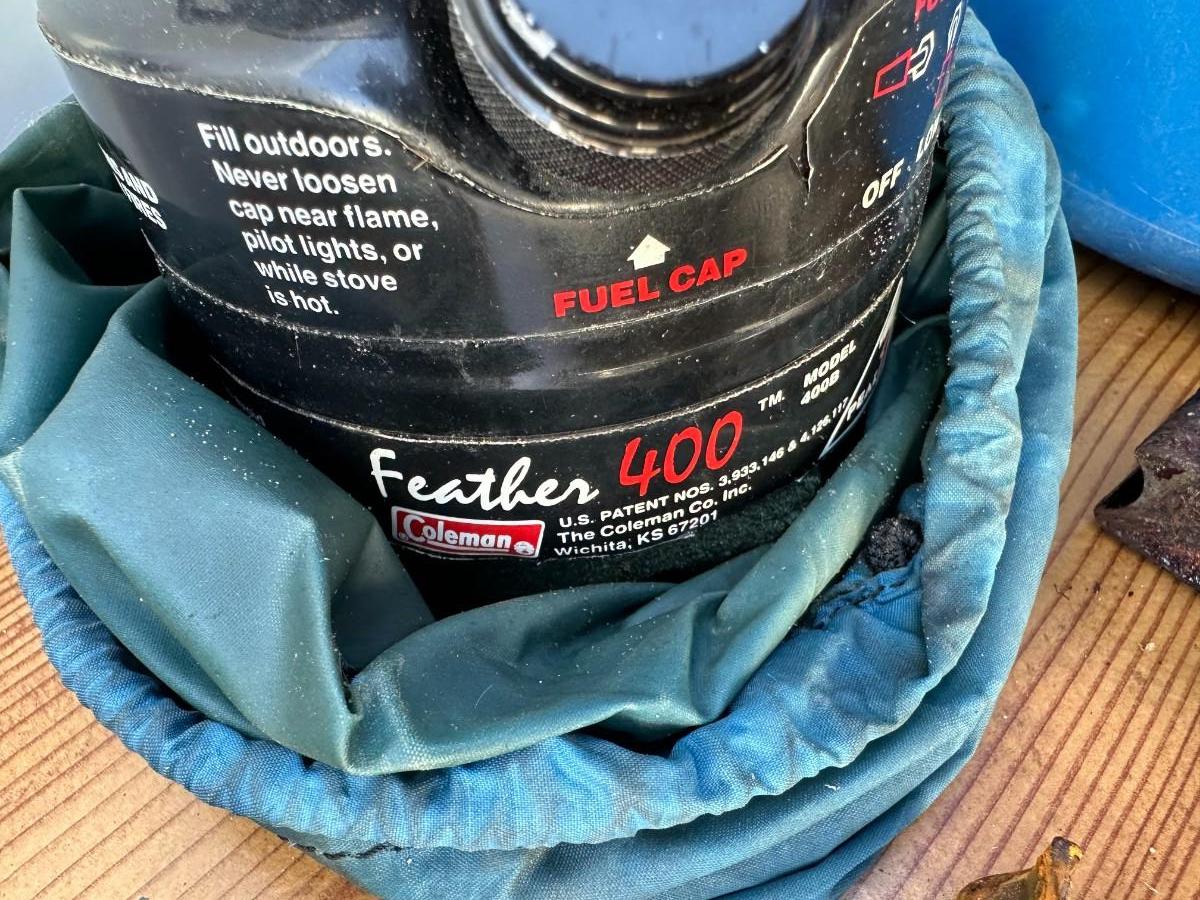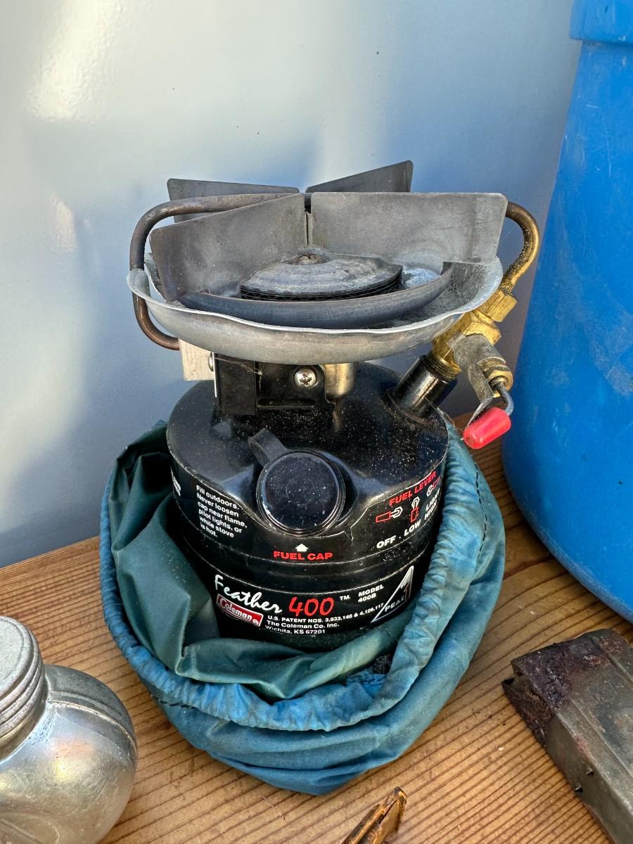 GUN CLEANING, SPARE FISHING REELS, COLEMAN FEATHER 400 SINGLE BURNER CAMP STOVE AND MORE