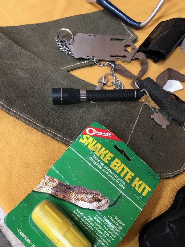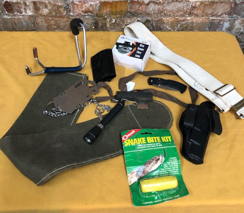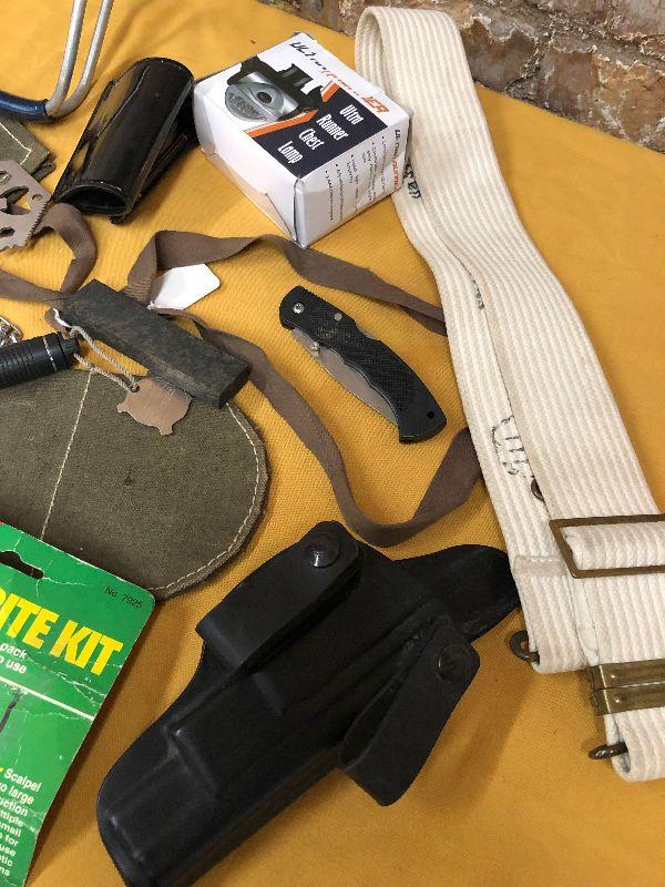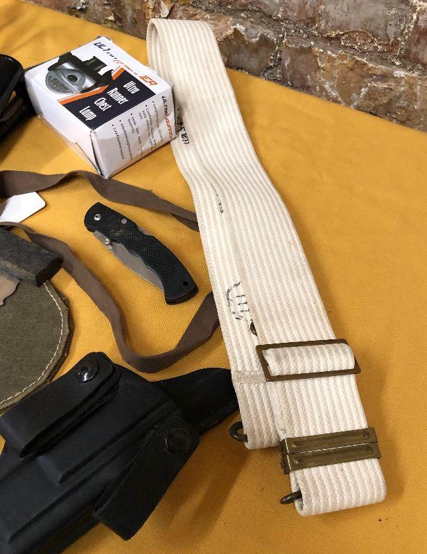 All that is shown in this lot including a gun holster..white military web belt..wrist slingshot...tactical knife..flashlight...