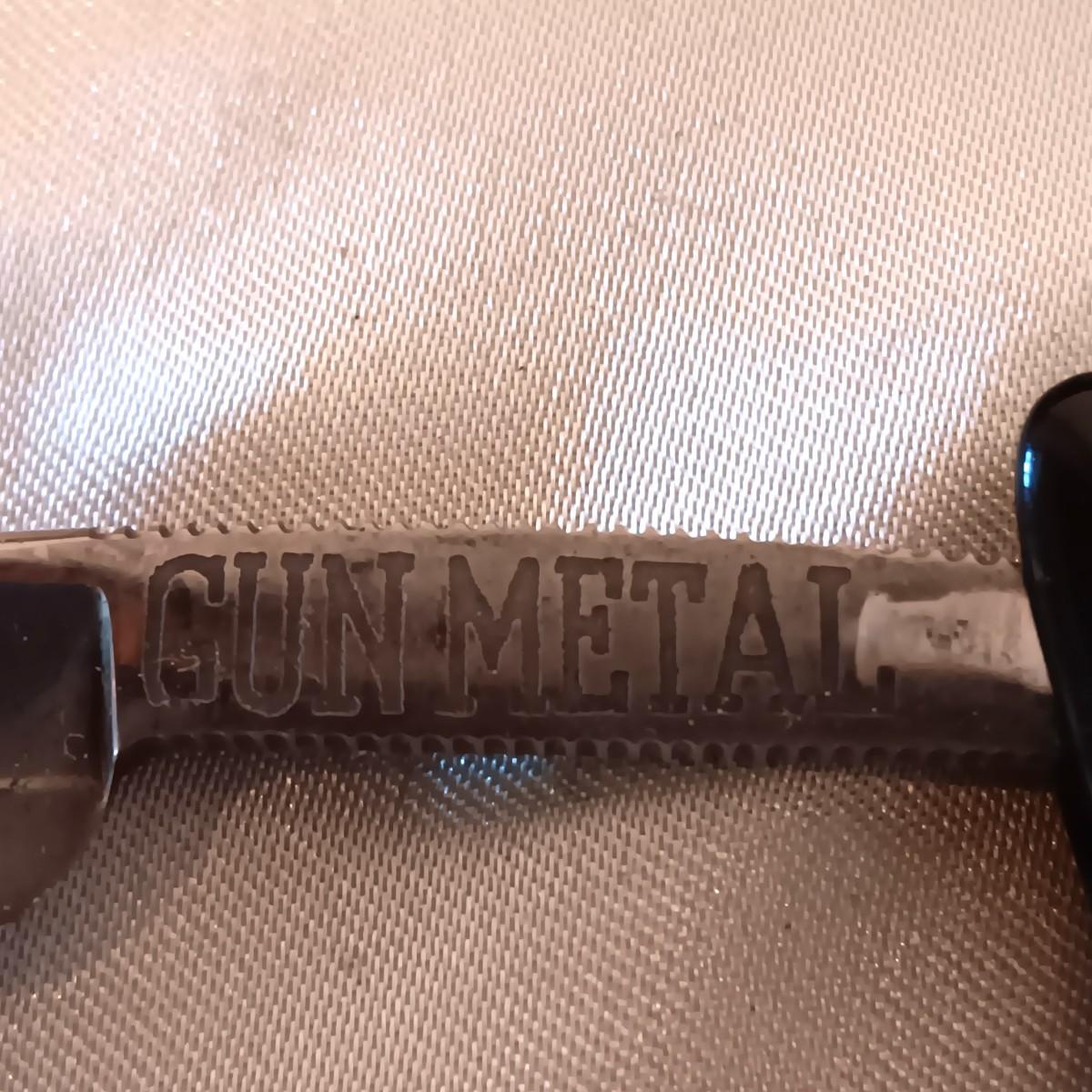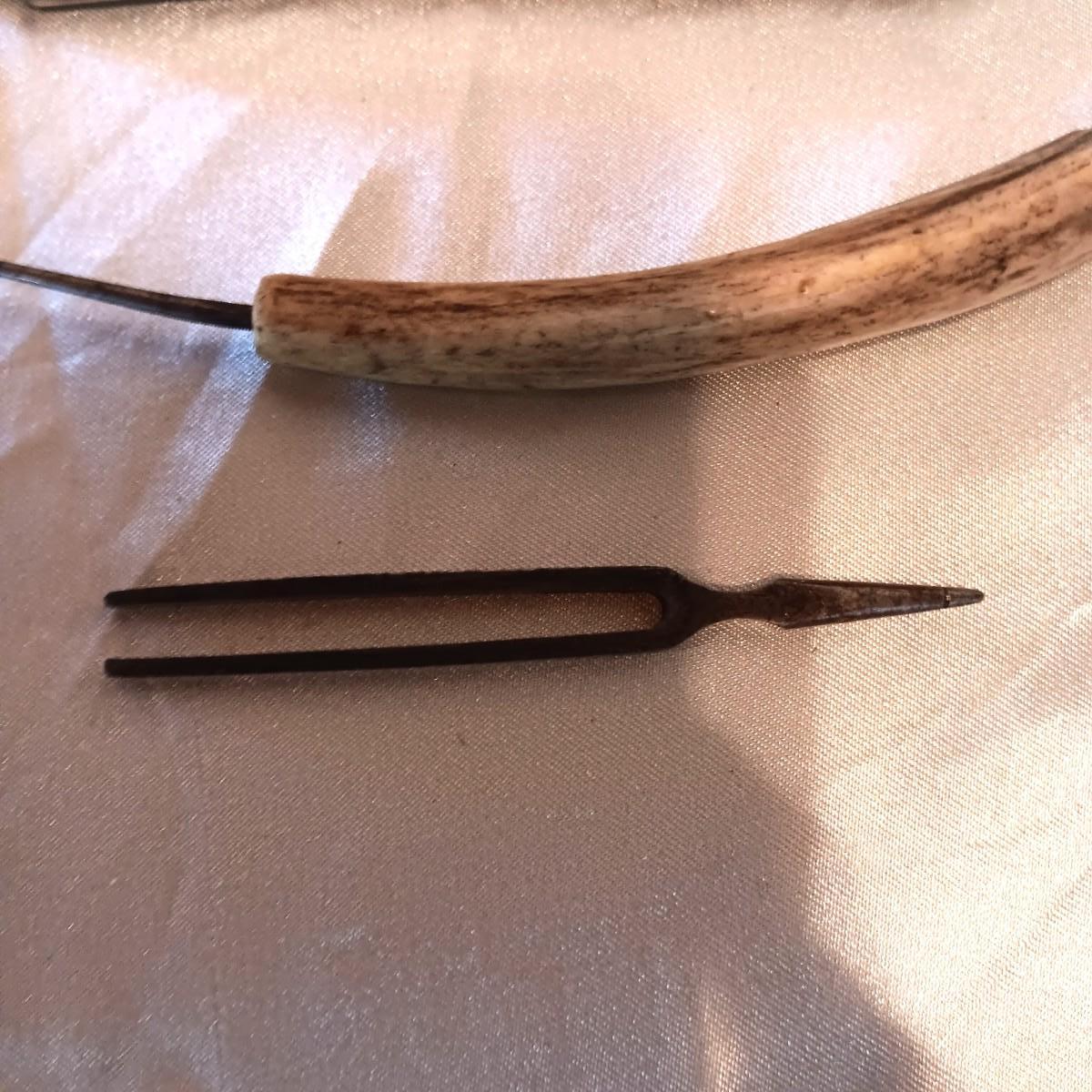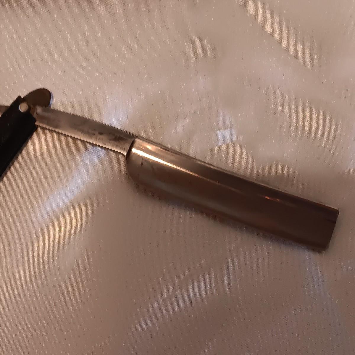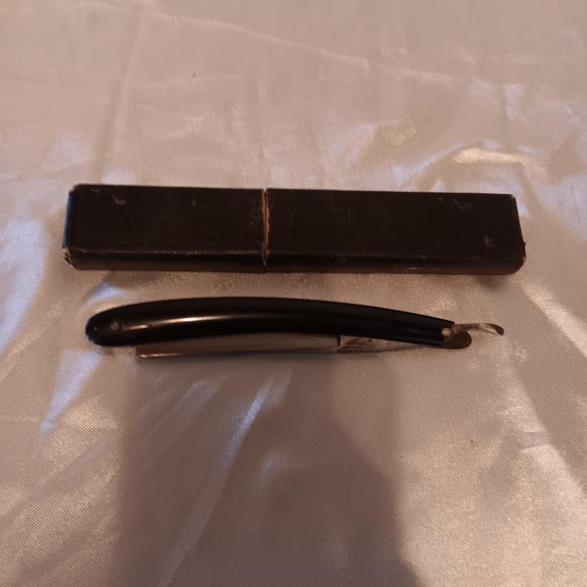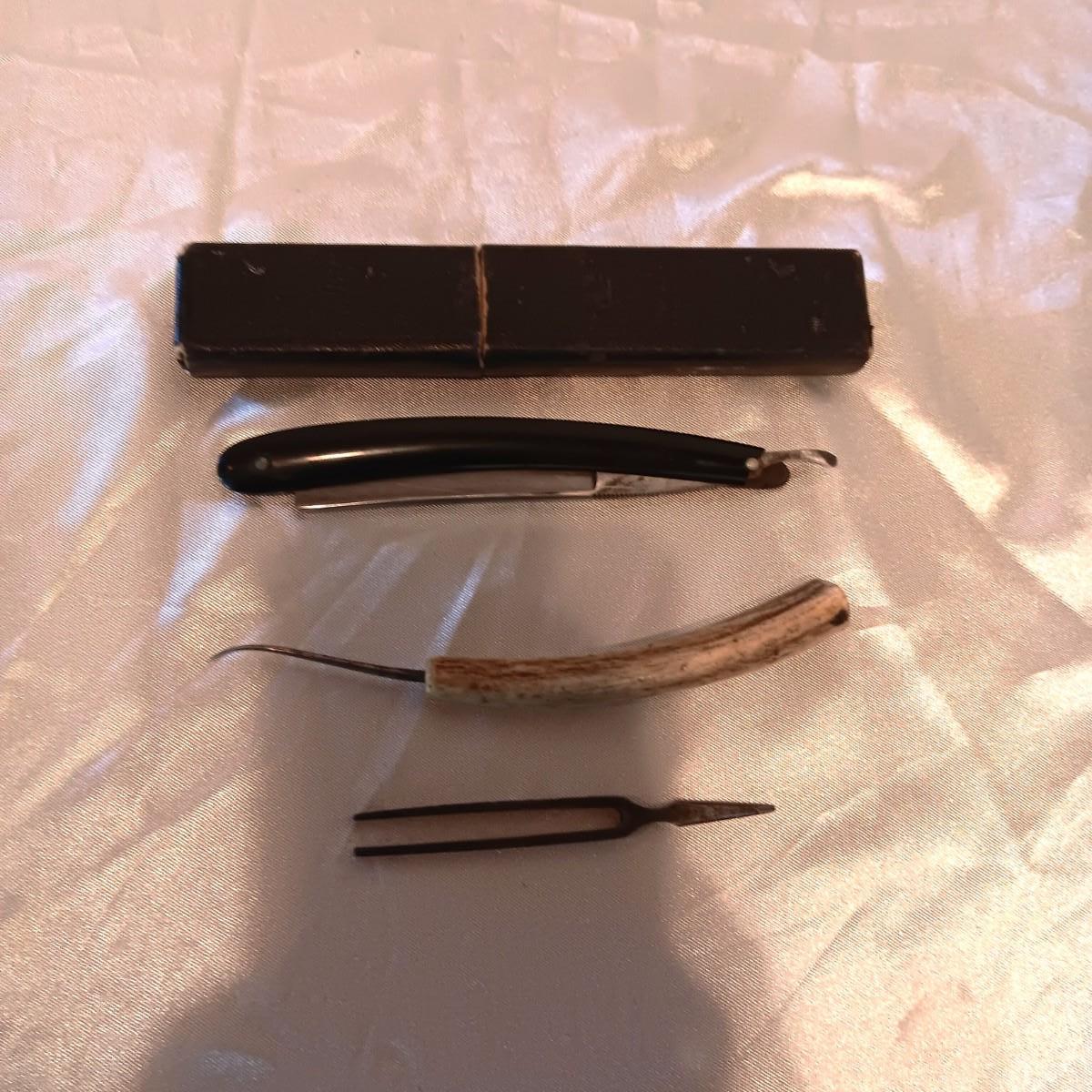 GUN METAL STRAIGHT EDGE RAZOR, ANTLER HANDLED PICK AND ?