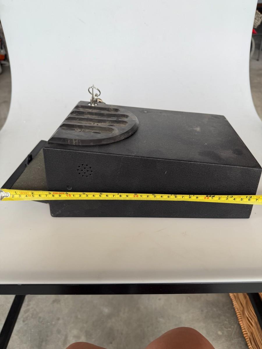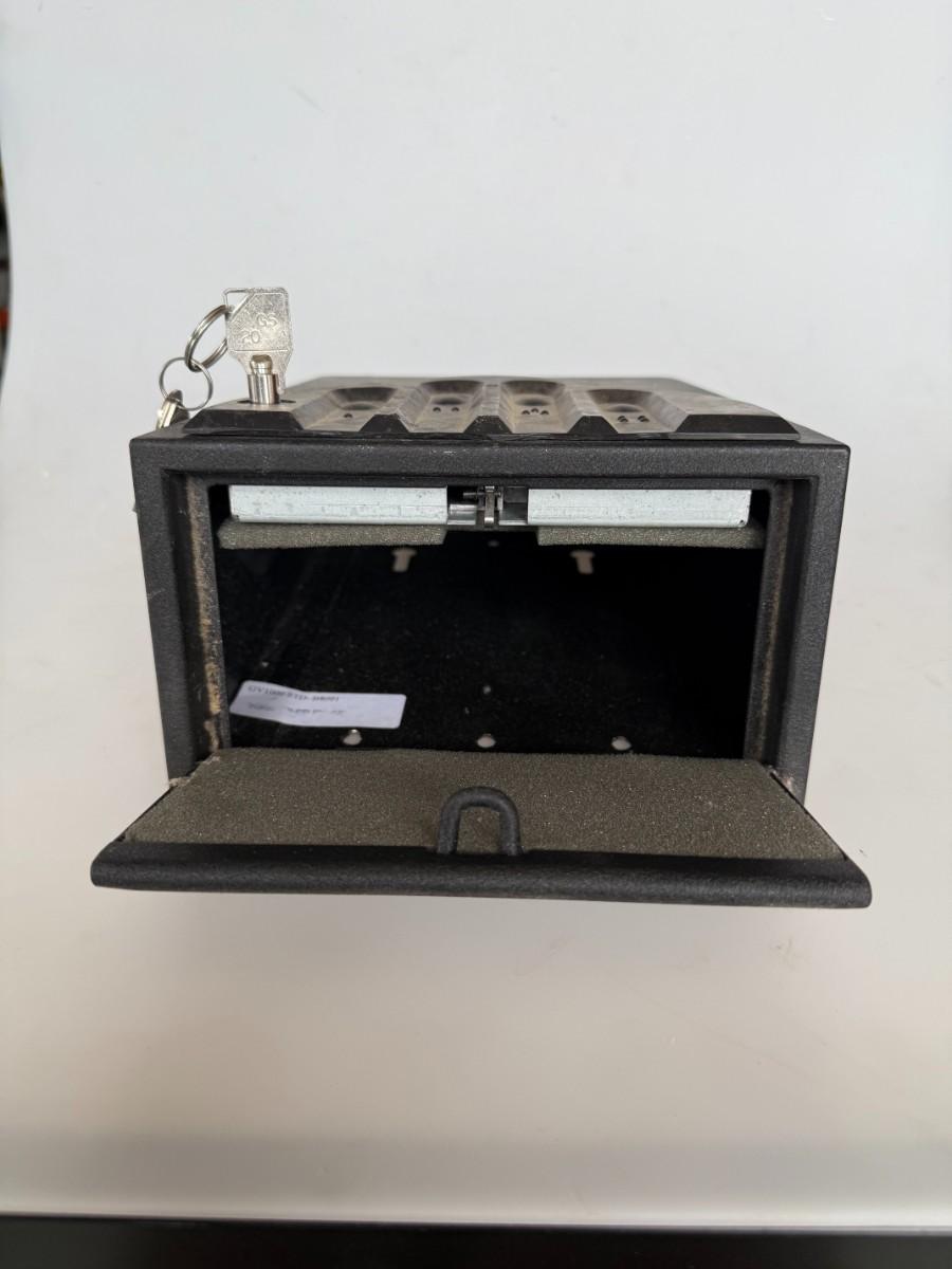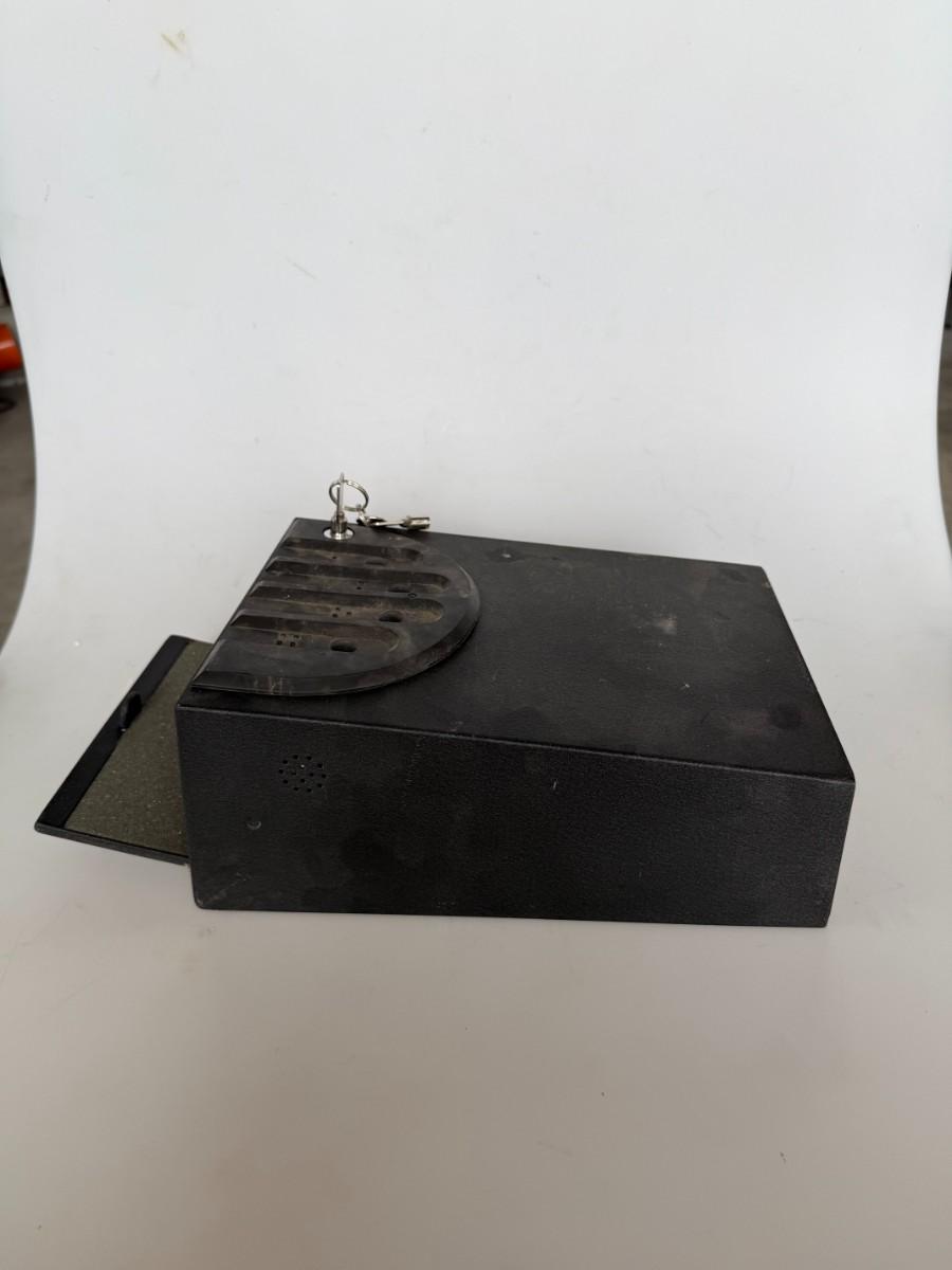 Compact black locking cash or storage box with key included. Great for securing petty cash, keys, or small valuables.
