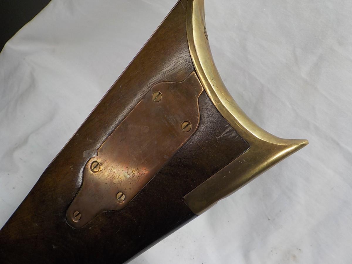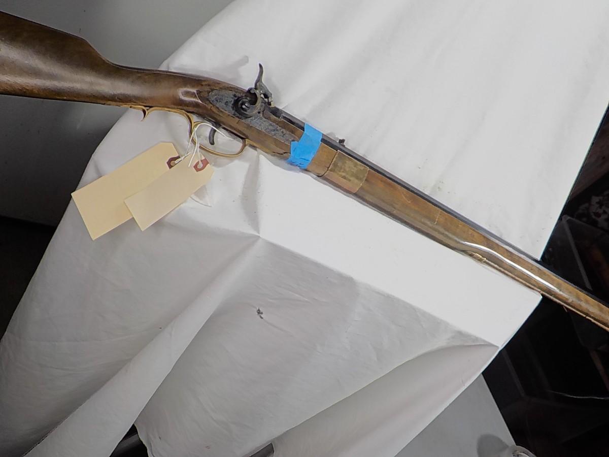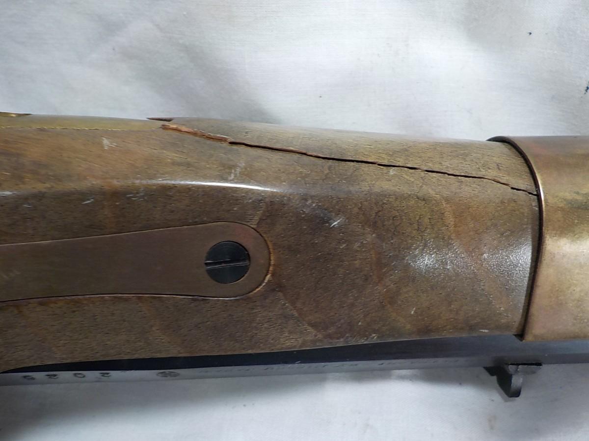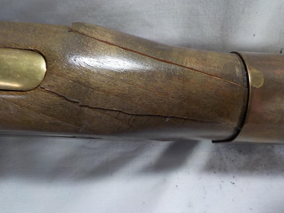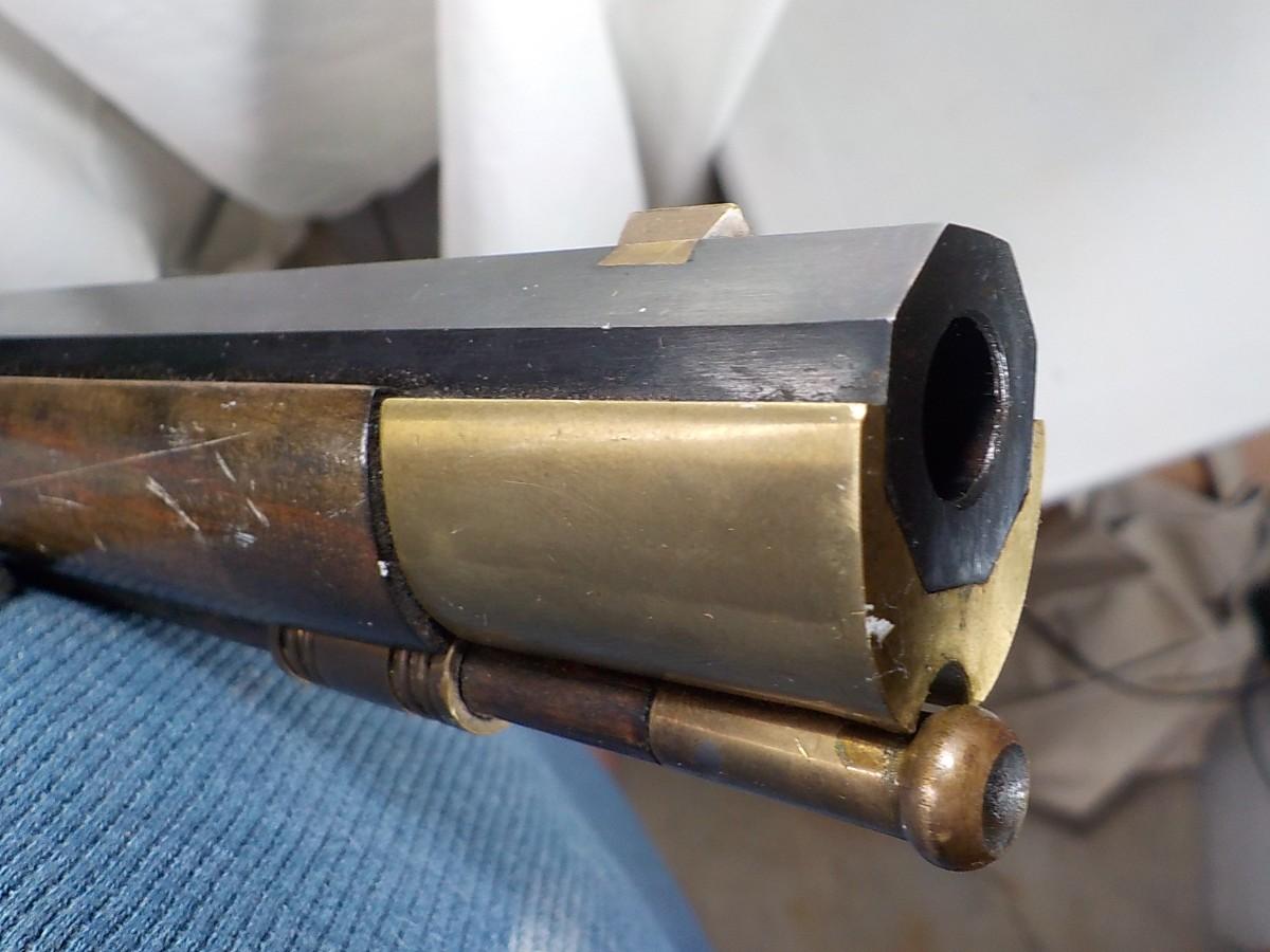 33 in long octagon barrel,hard wood , brass accents,, top of barrel shows proof stamp, does have stock crack pls view looks repairable.