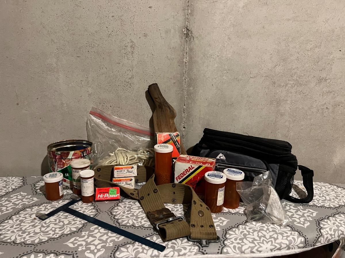 GUN STOCK, SHOT GUN SHELLS, STRAP, MINI COOLER, AND MORE.