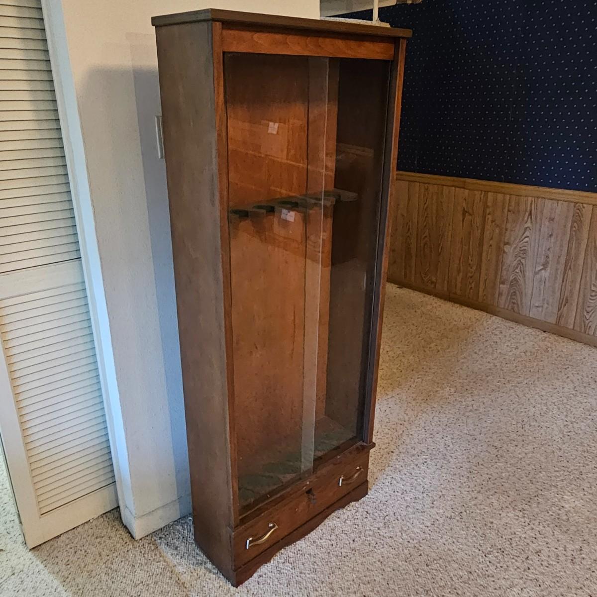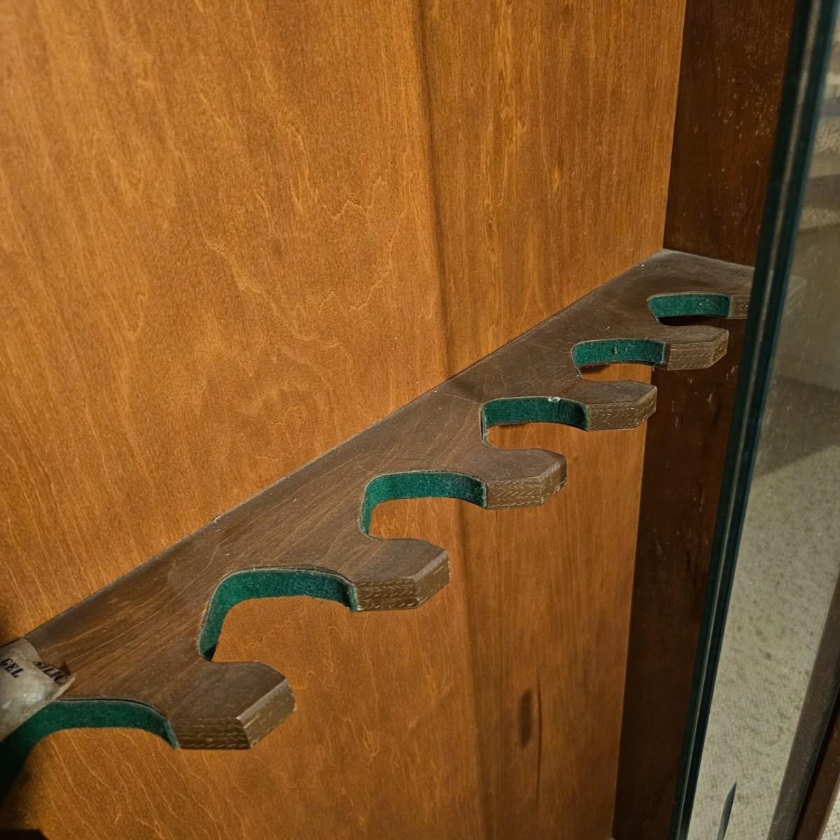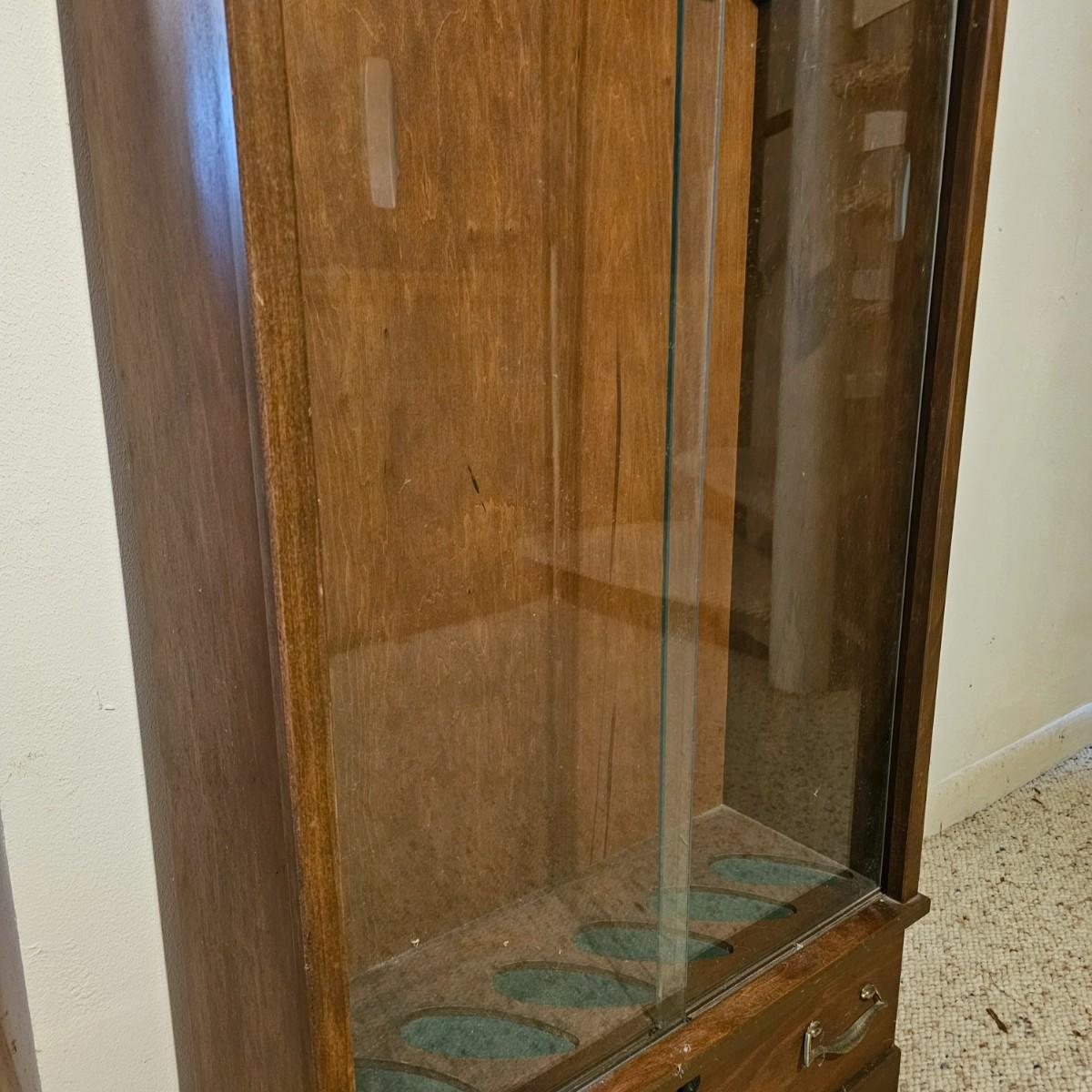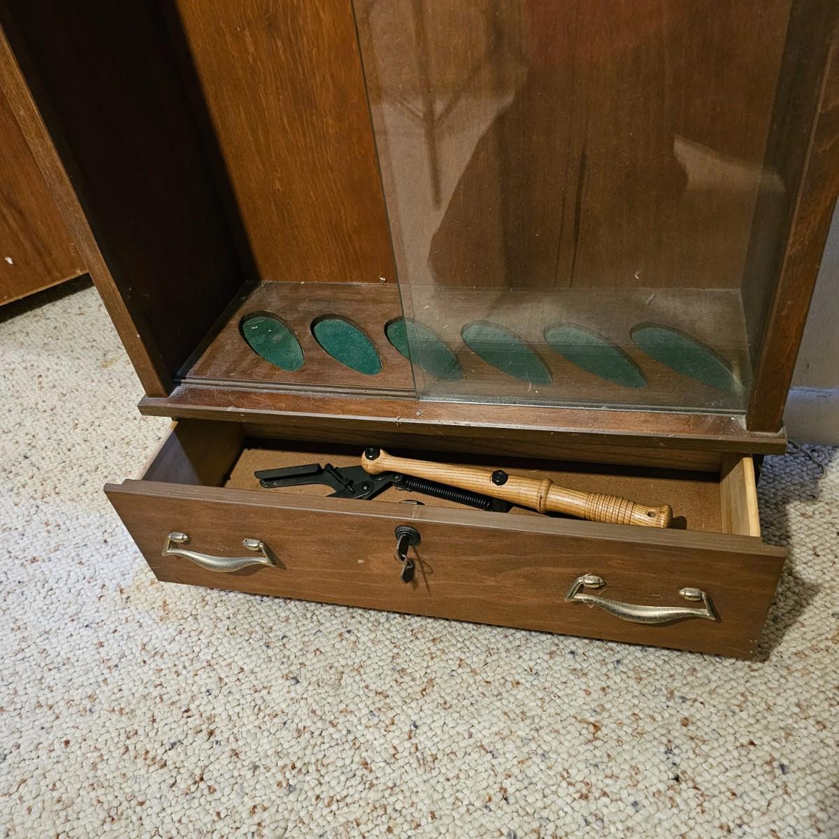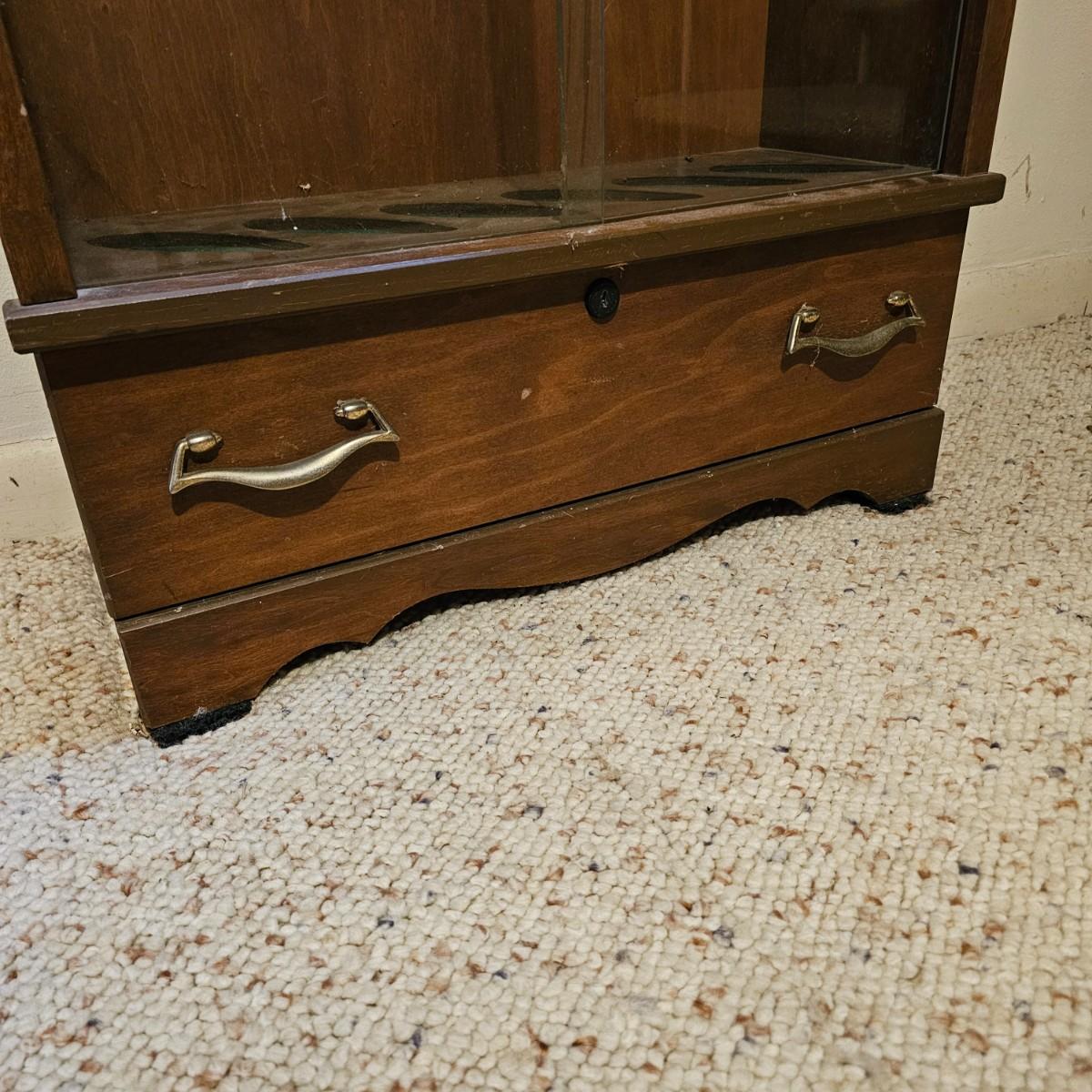 Six long gun capacity storage cabinet with two sliding glass doors and lockable drawer on bottom. Cabinet has pre formed slots for rifles and shotguns up to 51" length. Cabinet measures 24.75" x 9.75" x 62"H, is solid wood with masonite back. Felt pads in stock pockets on bottom and in rails near top. Includes one hand throw clay pigeon launcher and keys for drawer. See photos for details. Local pickup only.