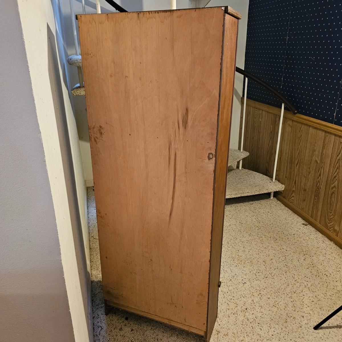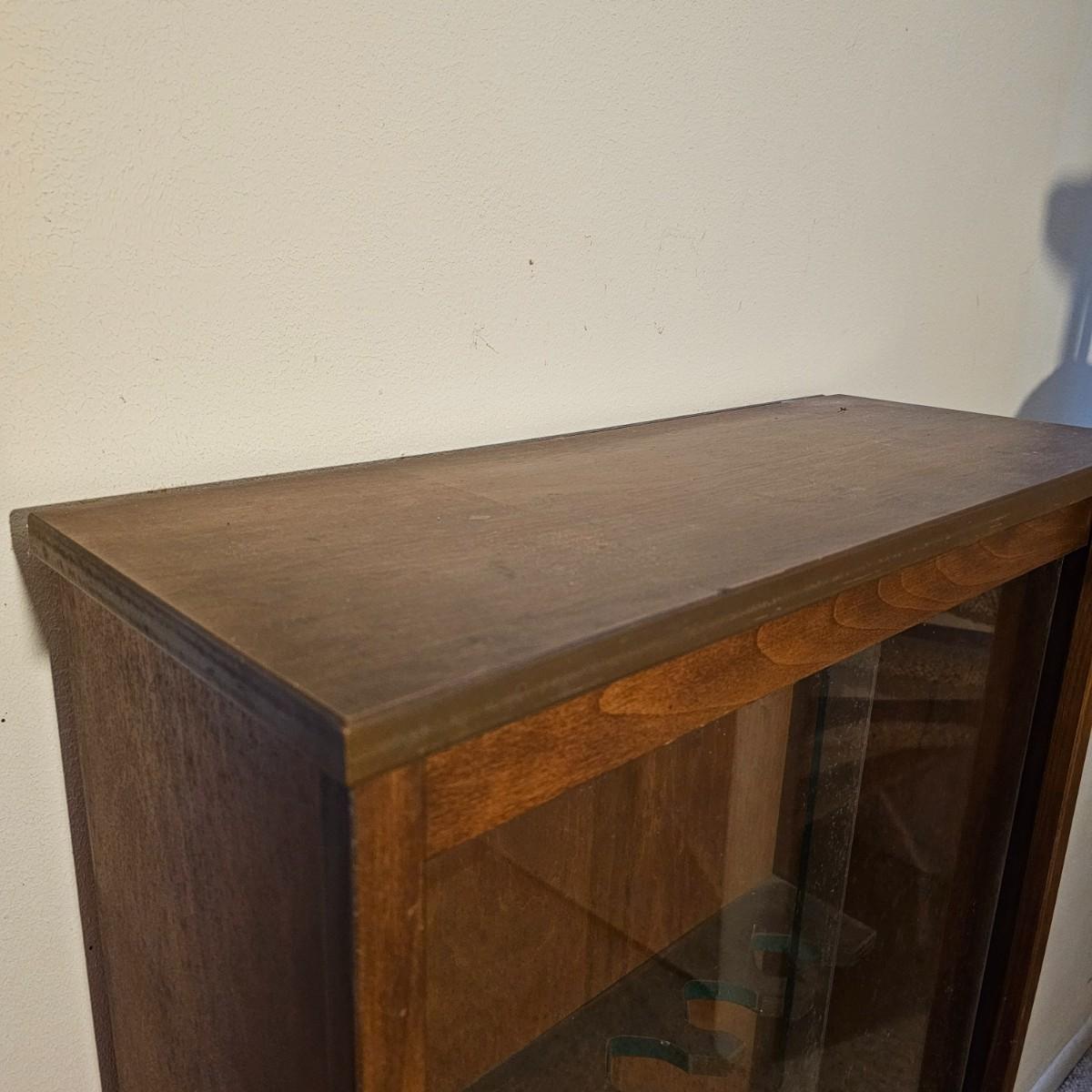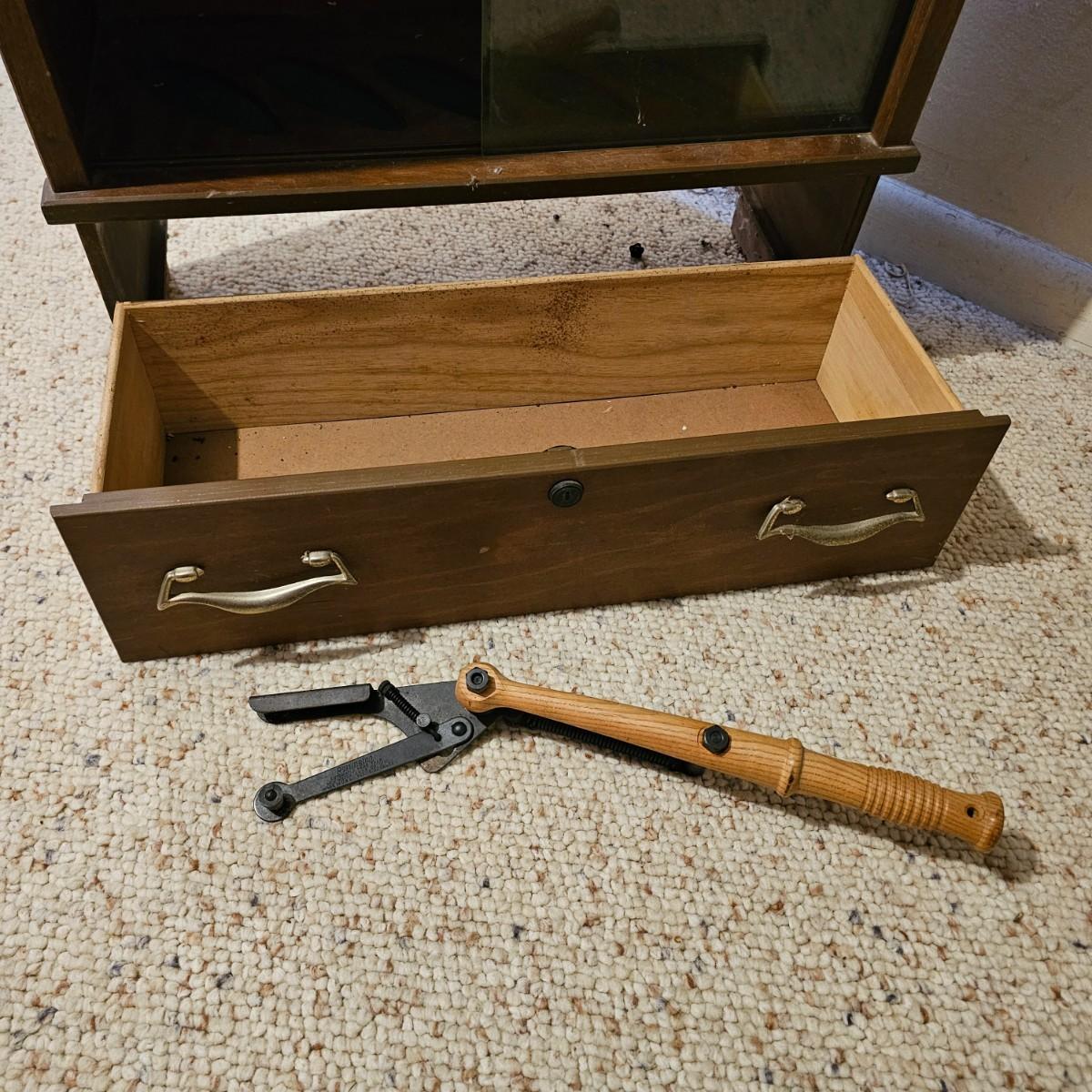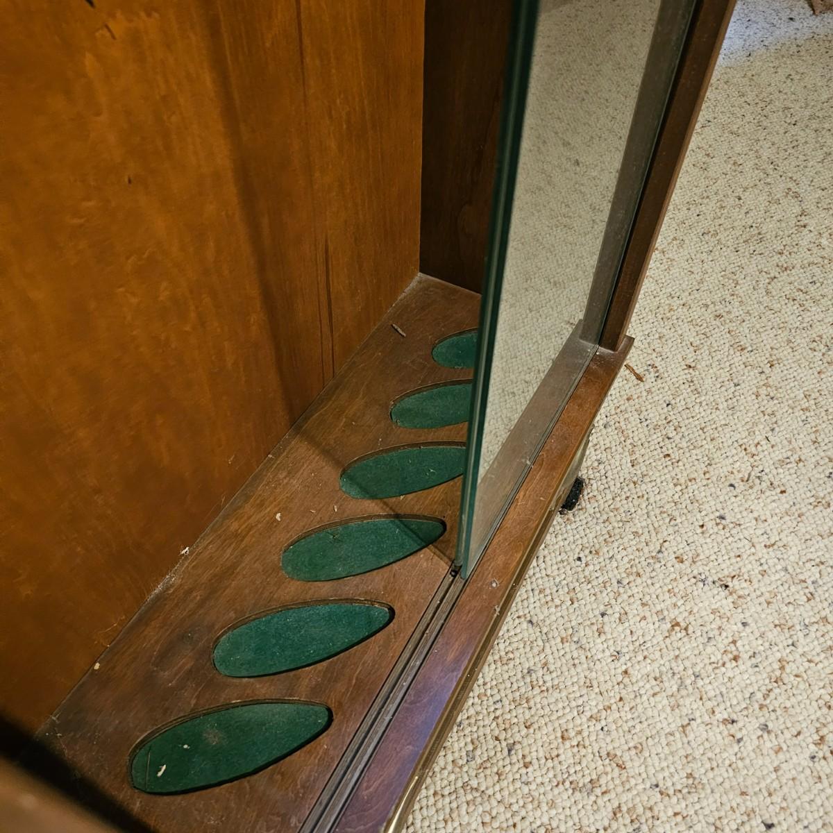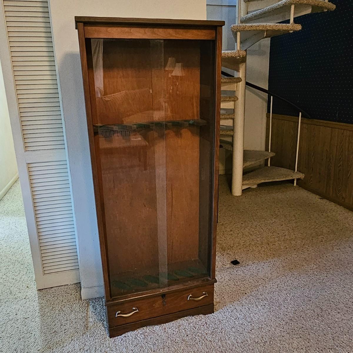Six long gun capacity storage cabinet with two sliding glass doors and lockable drawer on bottom. Cabinet has pre formed slots for rifles and shotguns up to 51" length. Cabinet measures 24.75" x 9.75" x 62"H, is solid wood with masonite back. Felt pads in stock pockets on bottom and in rails near top. Includes one hand throw clay pigeon launcher and keys for drawer. See photos for details. Local pickup only.