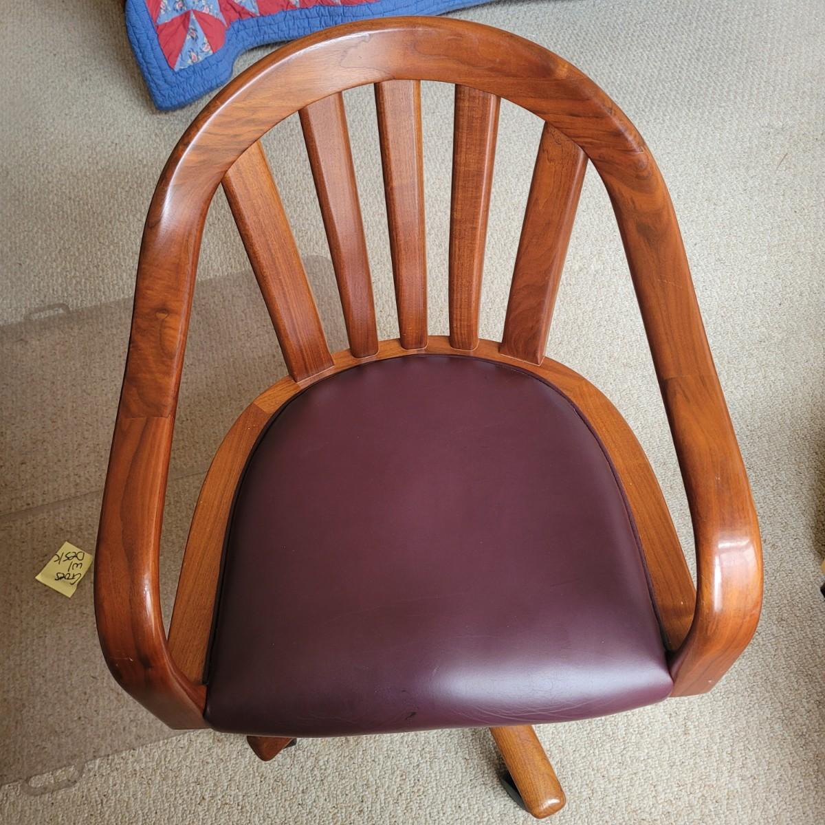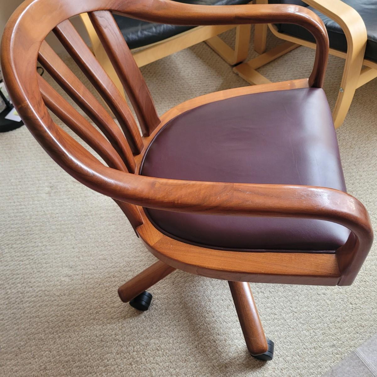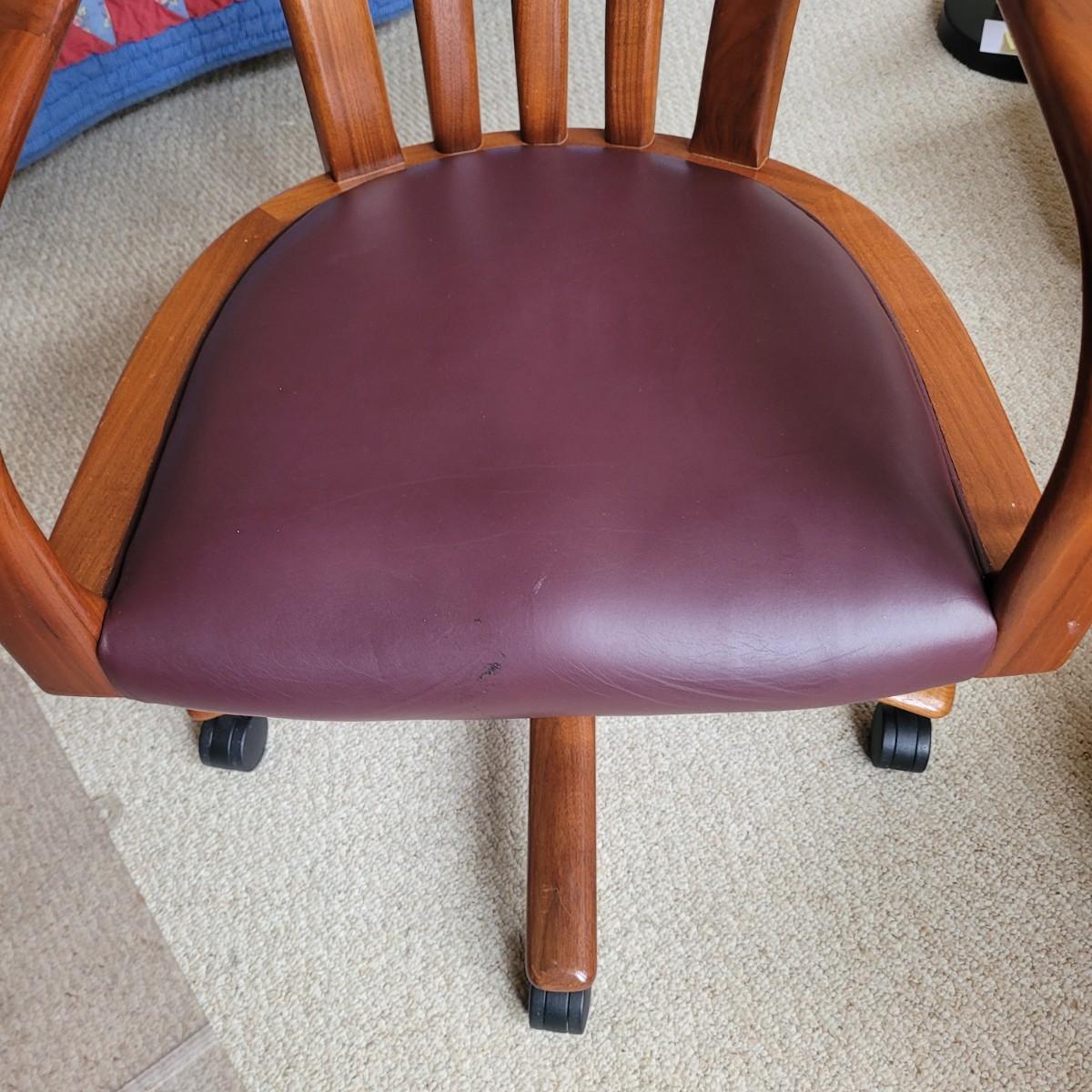 This lot includes on Gunlocke brand wooden and leather office chair. The frame of the chair is made from wood and steel. The seat is urethane and upholstered with what appears to be bonded maroon colored leather. The wooden arms are solid and curved. The bottom of the chair features five legs, each with its own roller wheel. The chair measures 22.5" x 20" x 32"H with a seat height of 19".