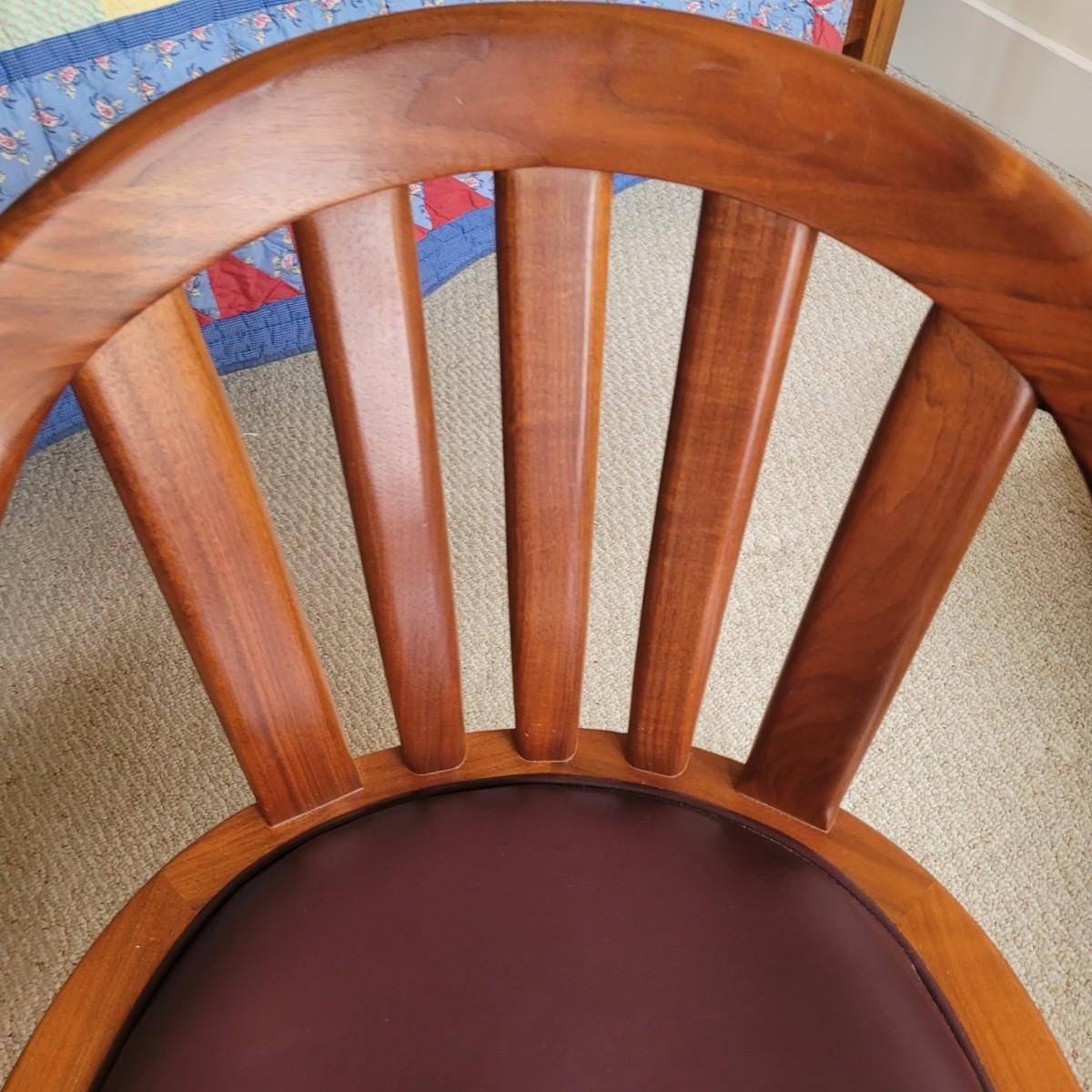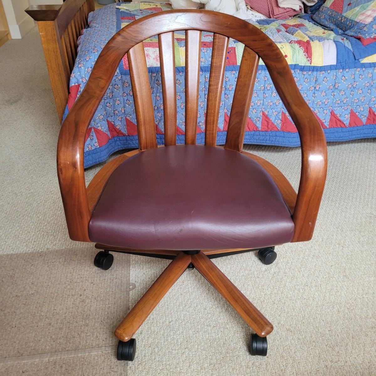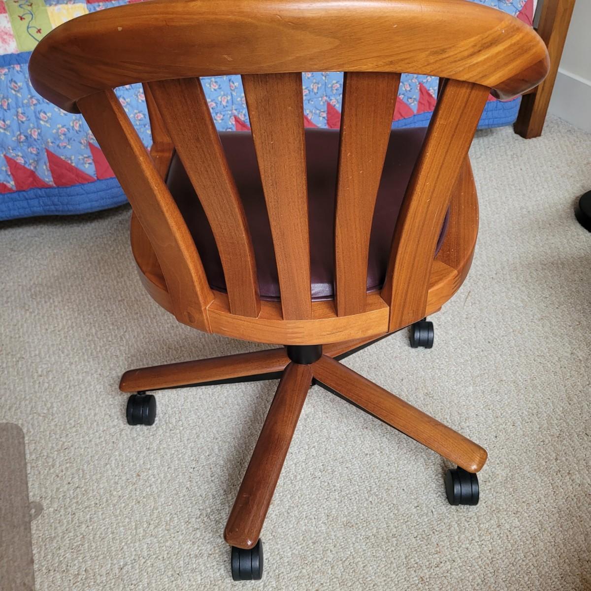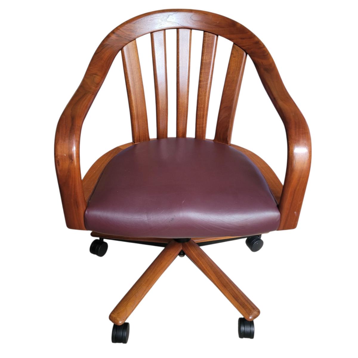 This lot includes on Gunlocke brand wooden and leather office chair. The frame of the chair is made from wood and steel. The seat is urethane and upholstered with what appears to be bonded maroon colored leather. The wooden arms are solid and curved. The bottom of the chair features five legs, each with its own roller wheel. The chair measures 22.5" x 20" x 32"H with a seat height of 19".