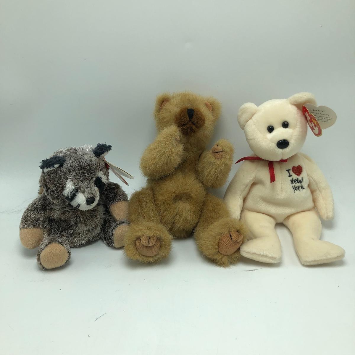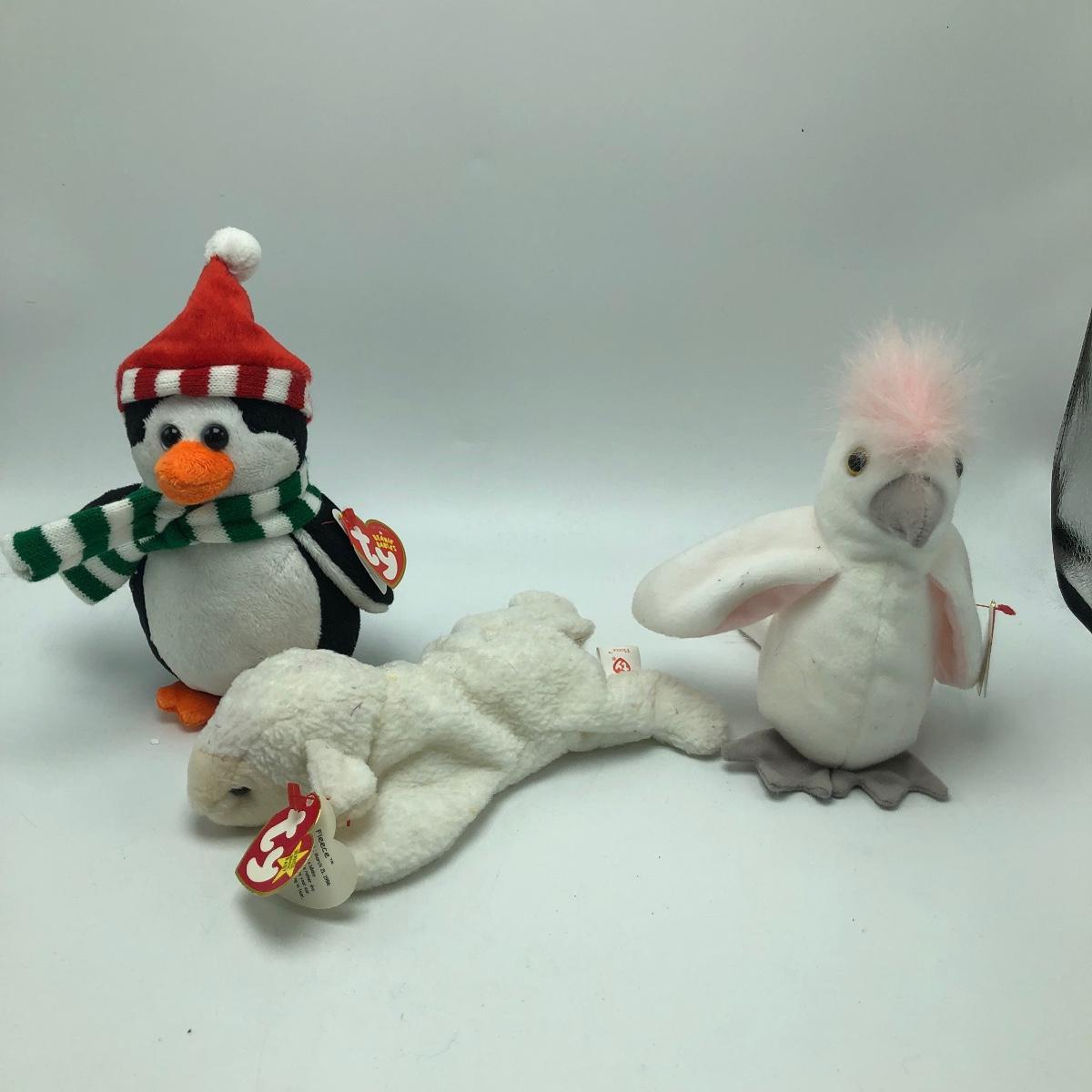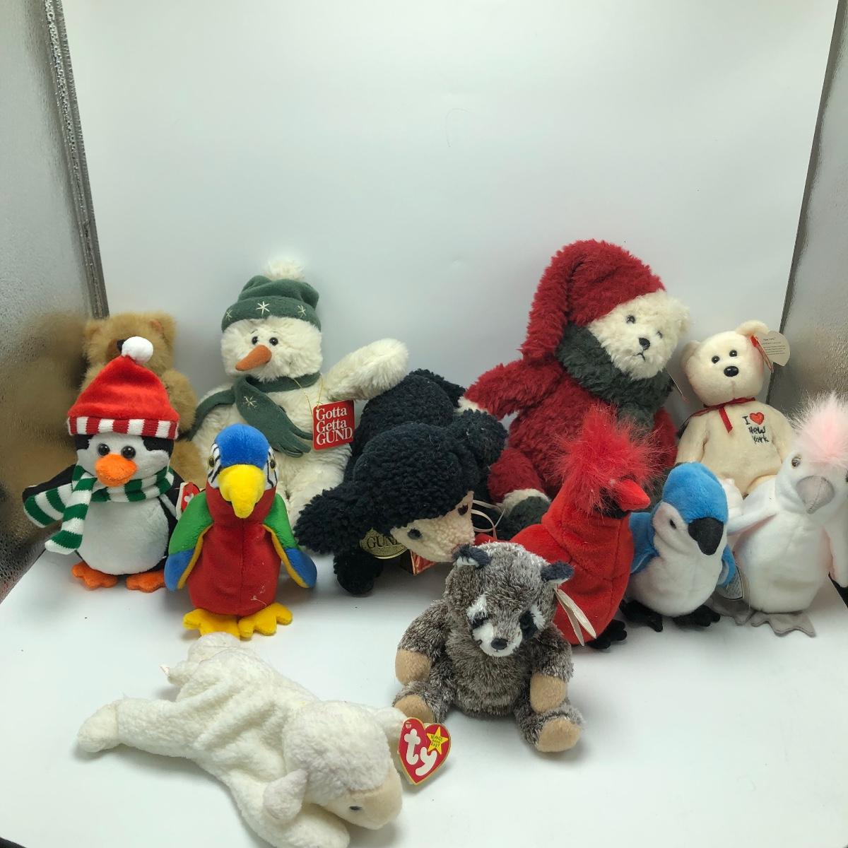 Lot includes three Gund stuffed animals, as well as four bird Ty Beanie babies, three bear Ty Beanie babies, a penguin and a sheep Ty Beanie baby.