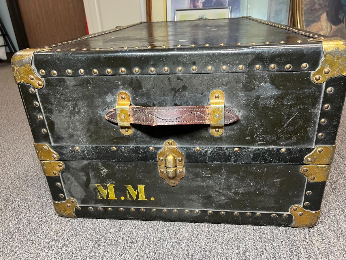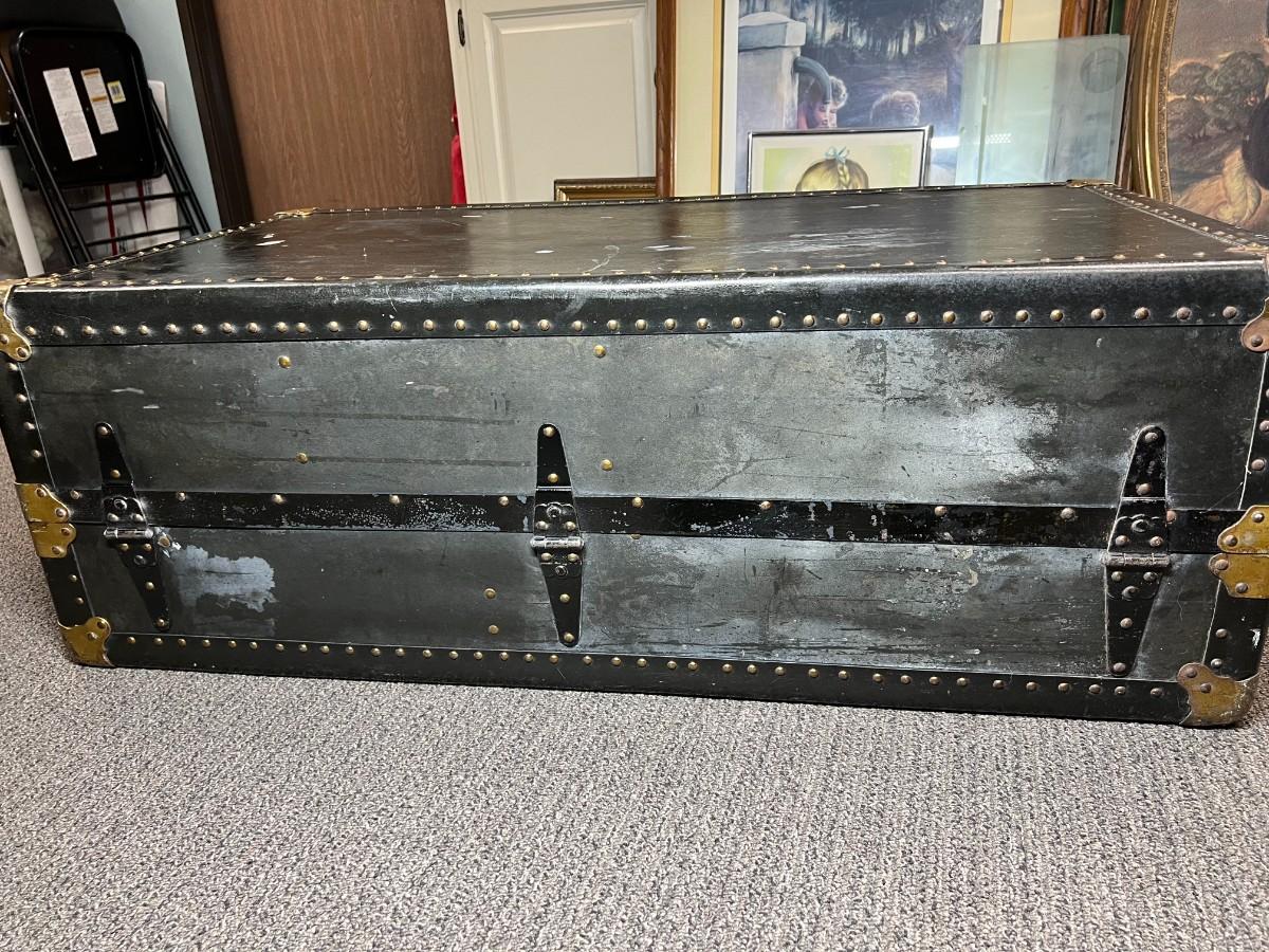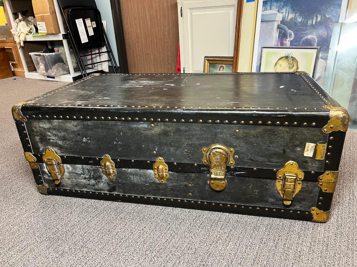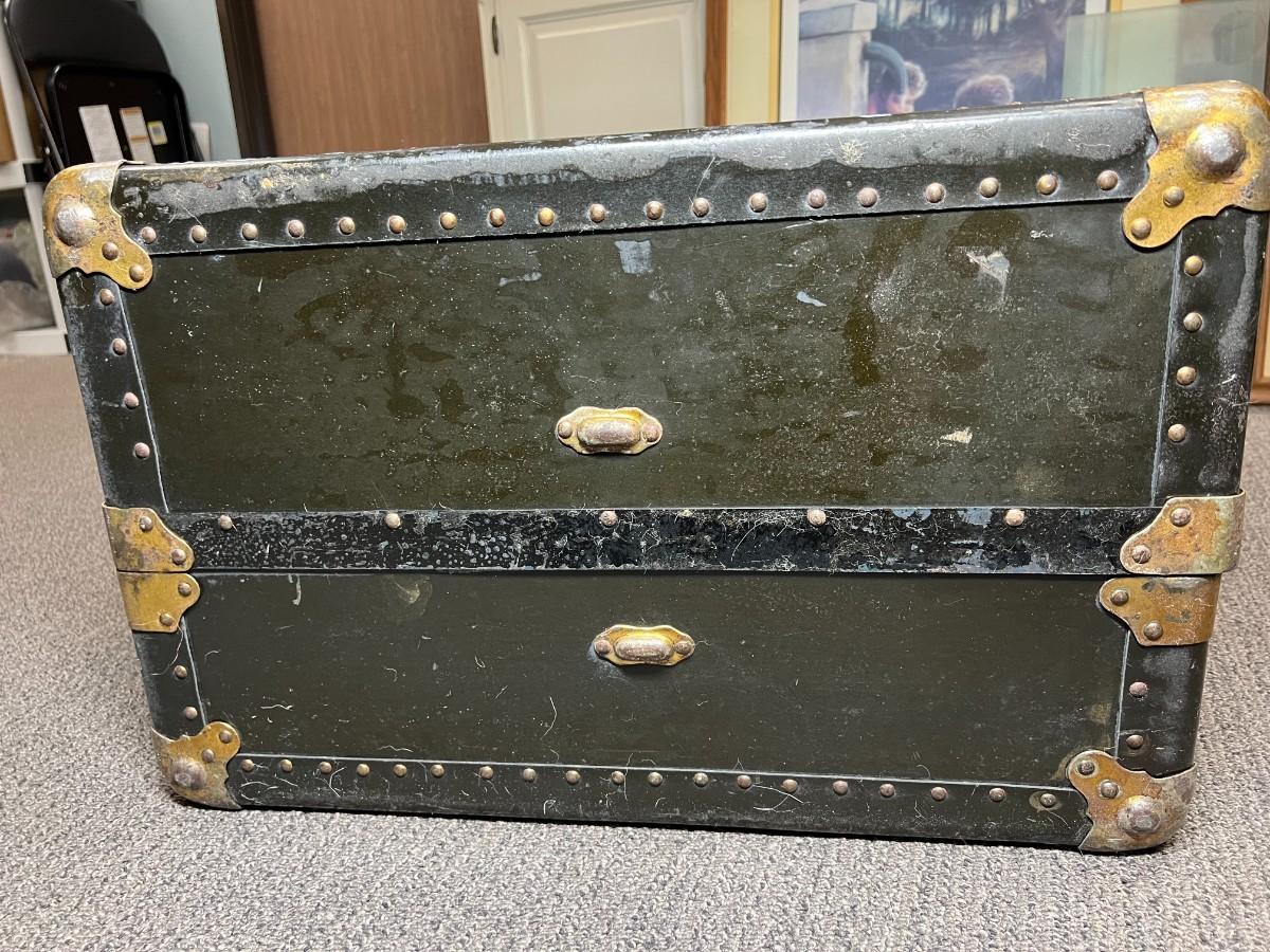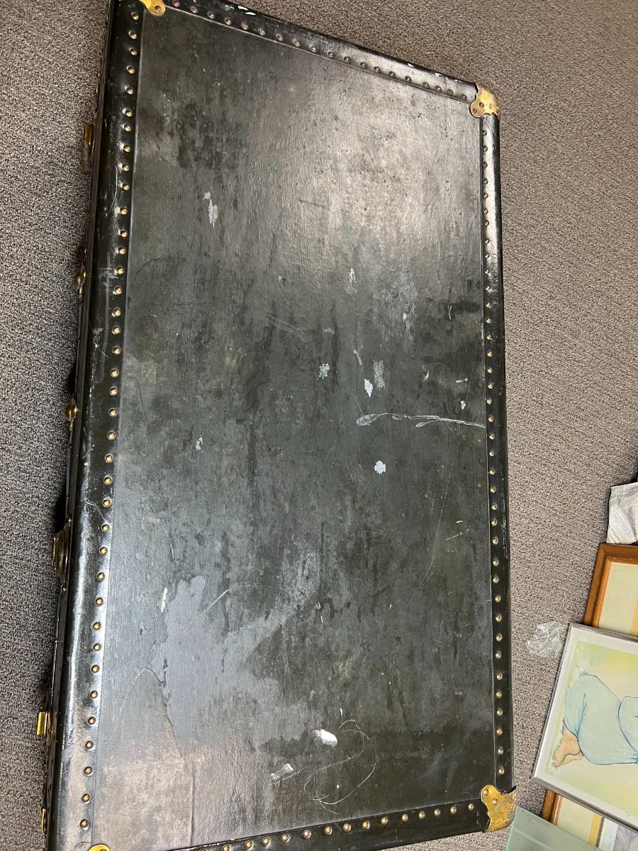 There is vintage wear to the trunk, but there is no significant damage and is in overall fair collectible condition. The trunk is locked without a key and cannot be opened, check pictures for more details and for sizing.