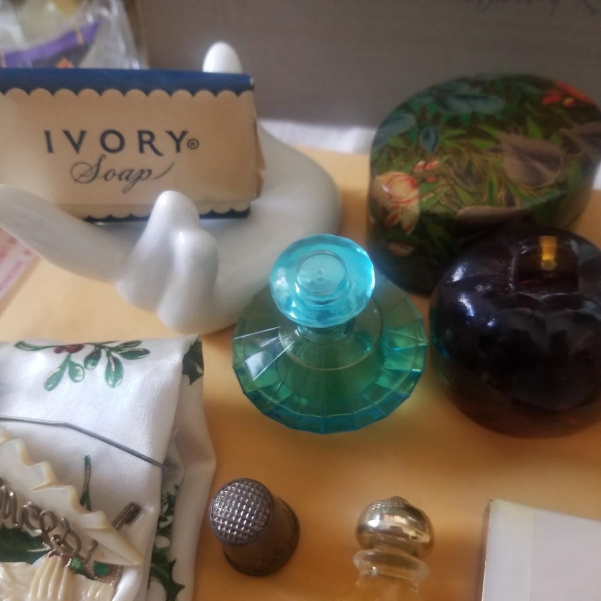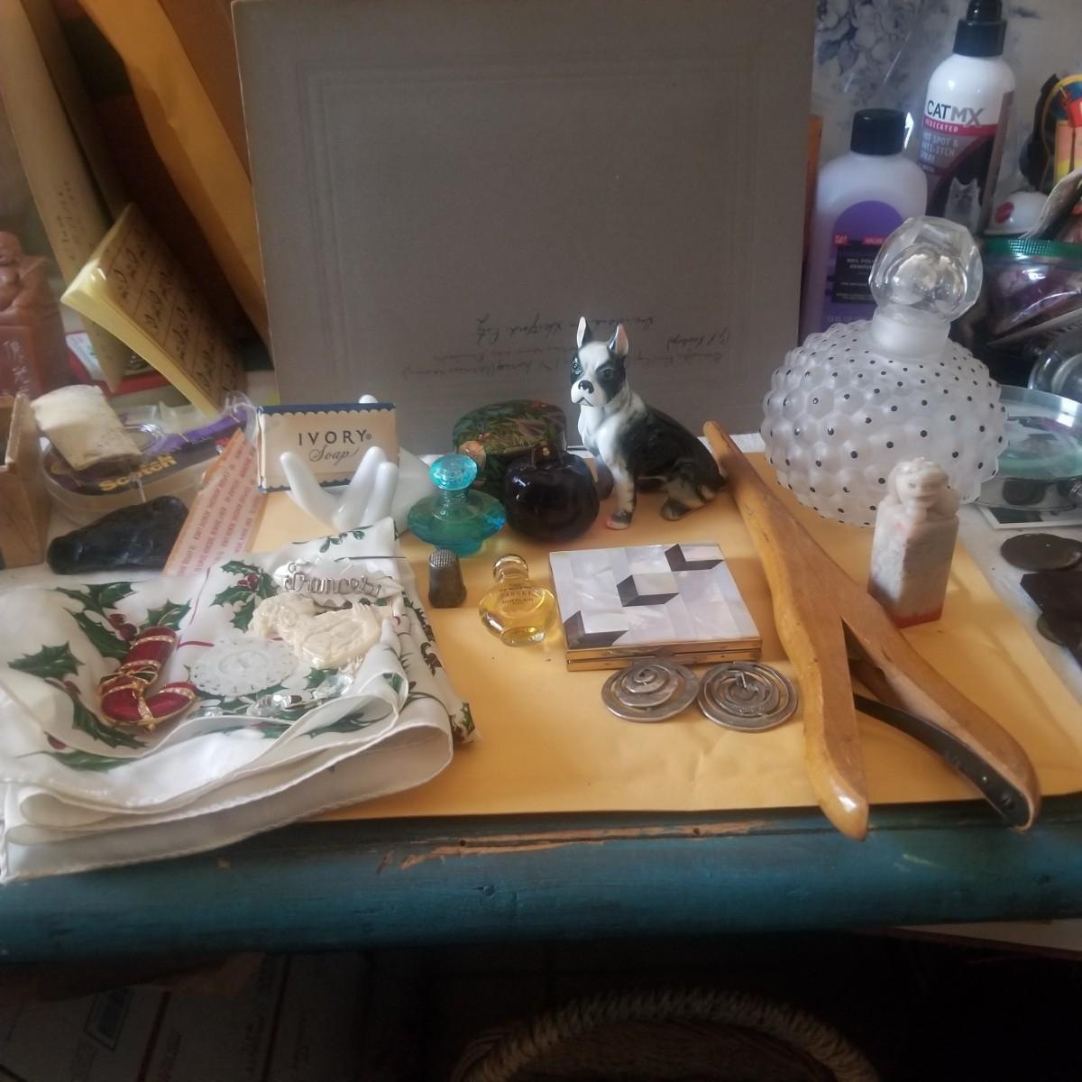 Fun girly girly lot perfume bottle LaLique bottom top is Orrefors Silk scarf mop.pendant glove streatcher porcelin boxer silver earings ring holder etc