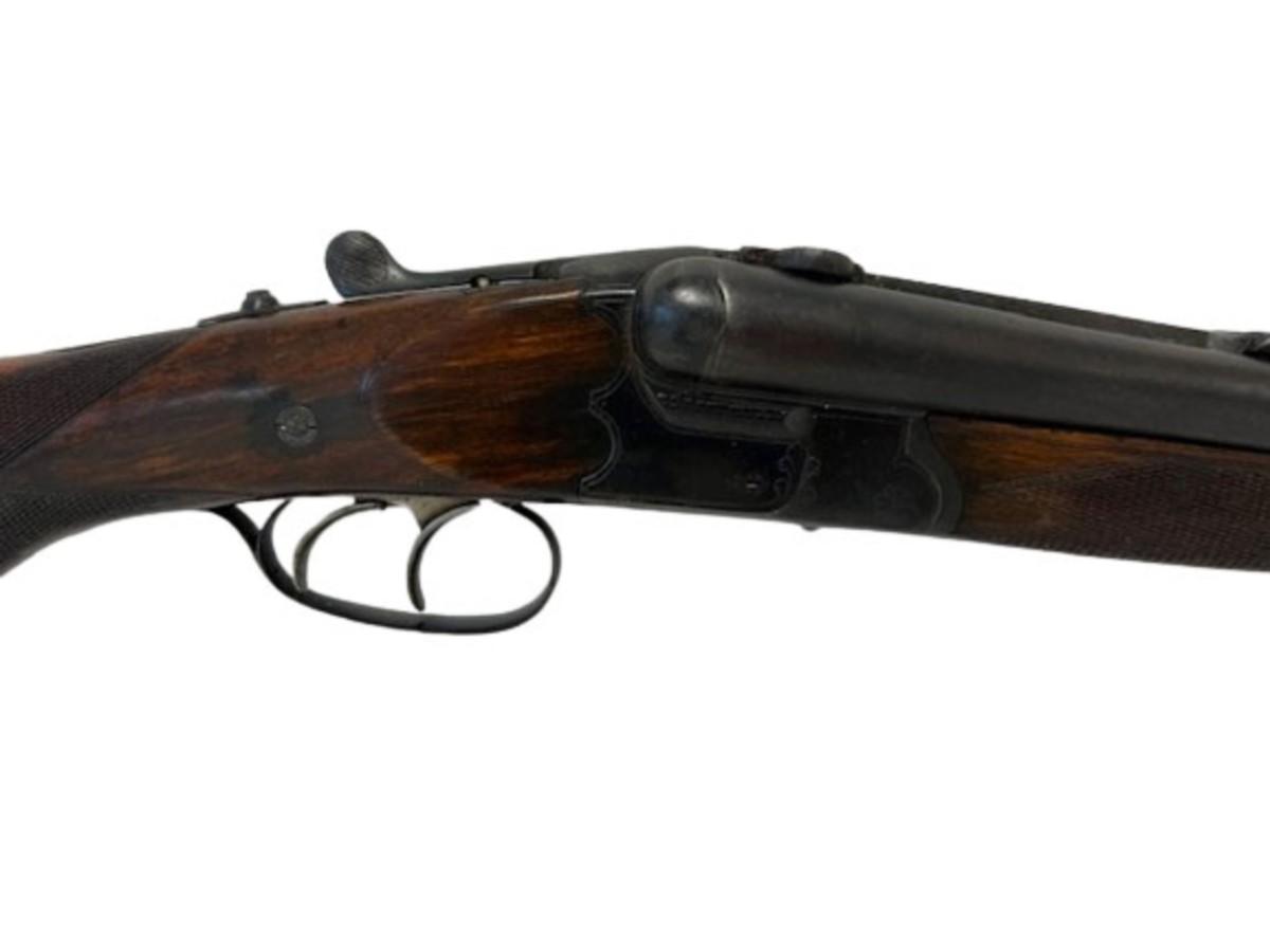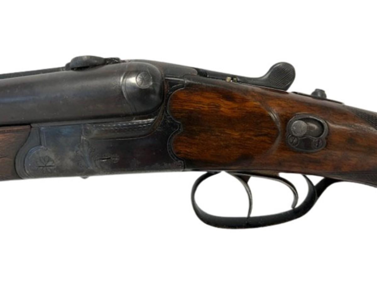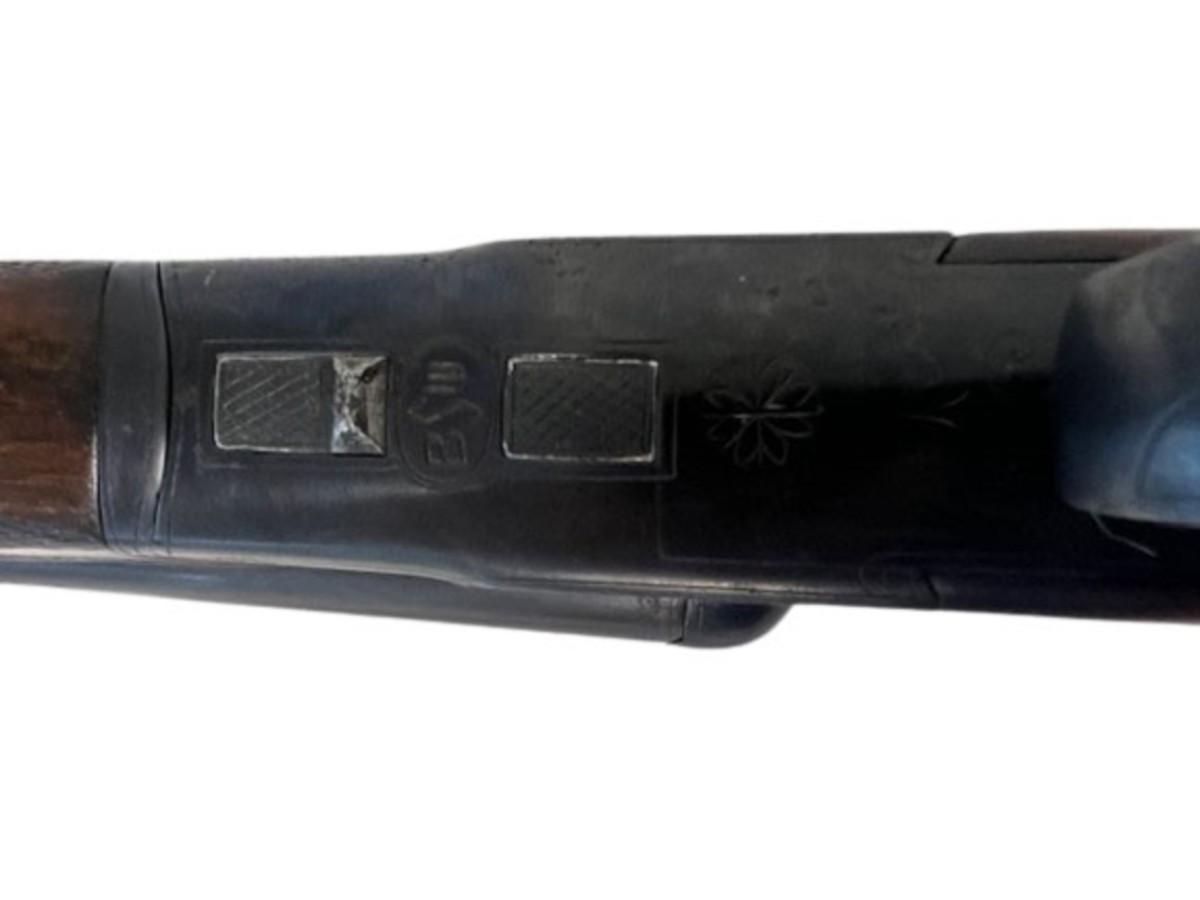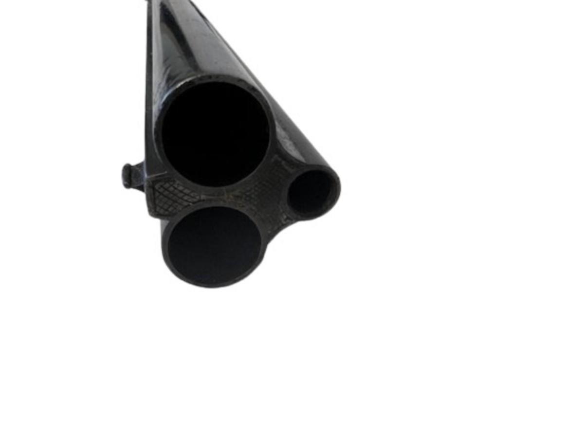 This is a 3-barrel gun. It has two side-by-side stamped 15-gauge shotgun barrels, and a 7.8mm rifle barrel. Barrels are made by Krupp. Barrel composition is laufstahl (fluid steel). Has matching numbers. Serial number 46052. Not tested. [KA]
