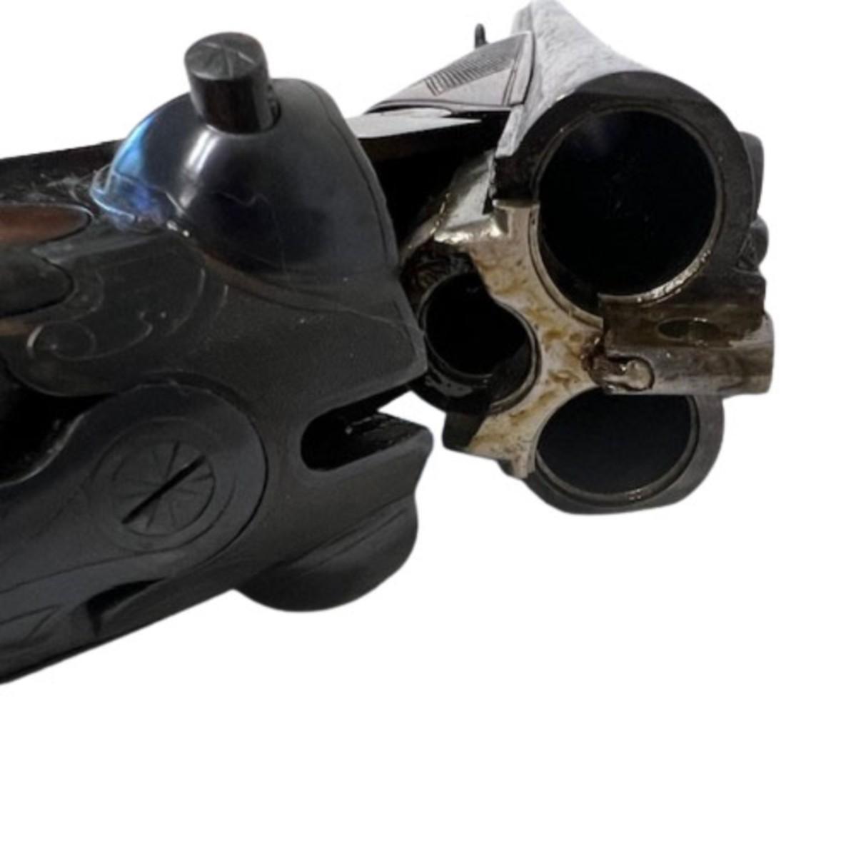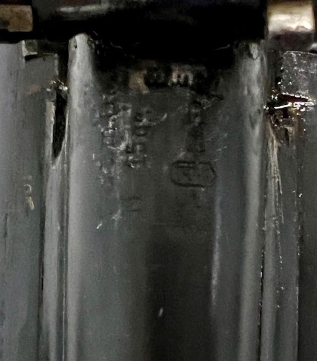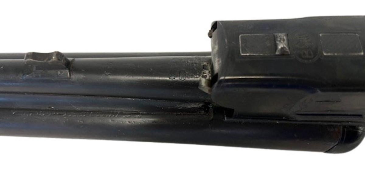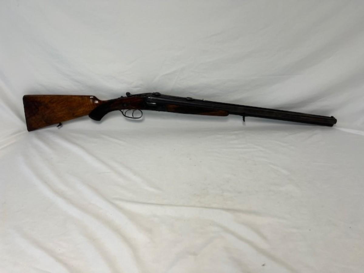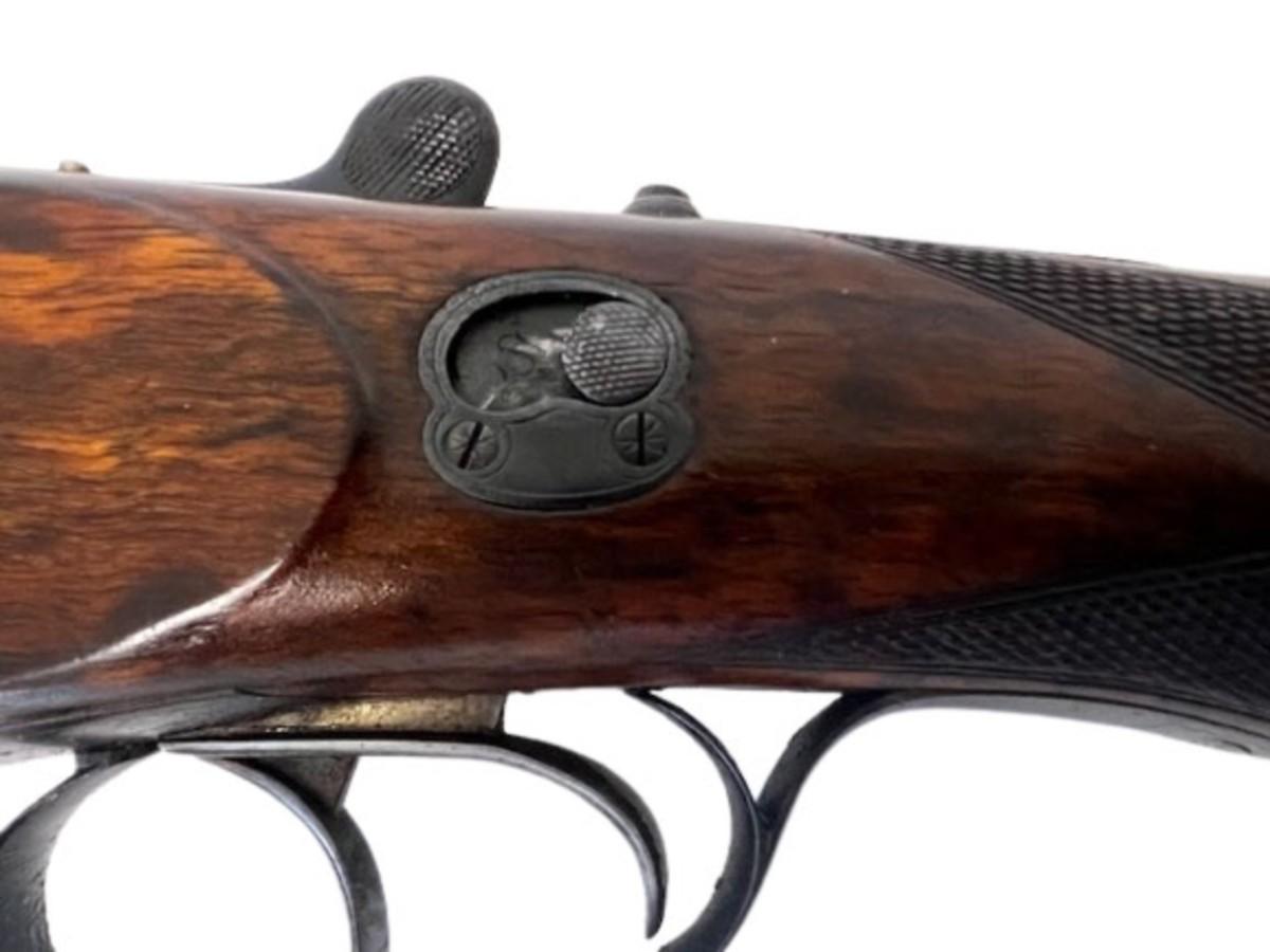 This is a 3-barrel gun. It has two side-by-side stamped 15-gauge shotgun barrels, and a 7.8mm rifle barrel. Barrels are made by Krupp. Barrel composition is laufstahl (fluid steel). Has matching numbers. Serial number 46052. Not tested. [KA]