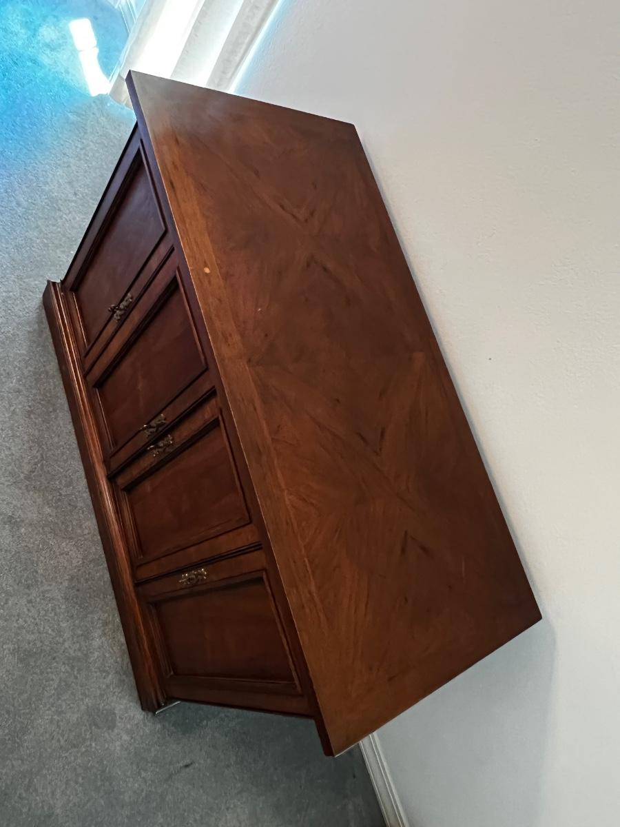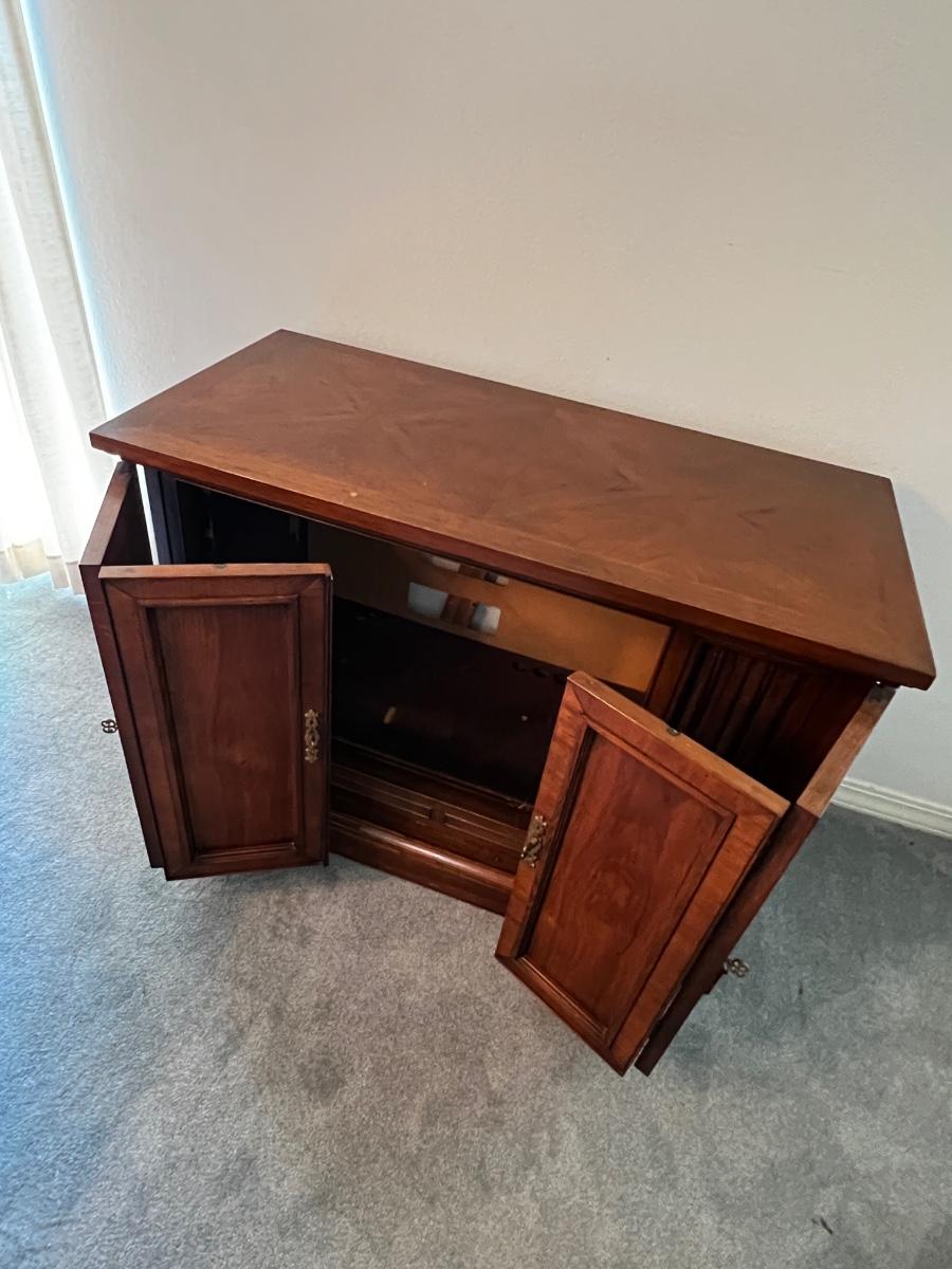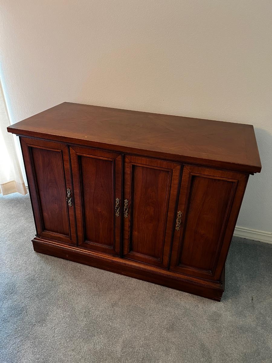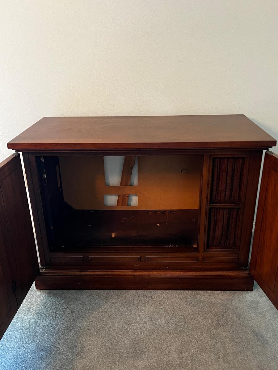 Has been gutted out. Has wheels. 30.75” H x 43” W x 20.75” D.