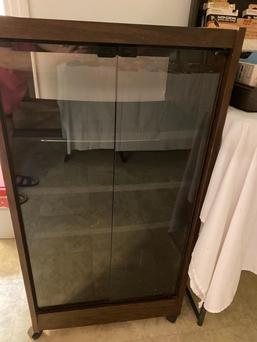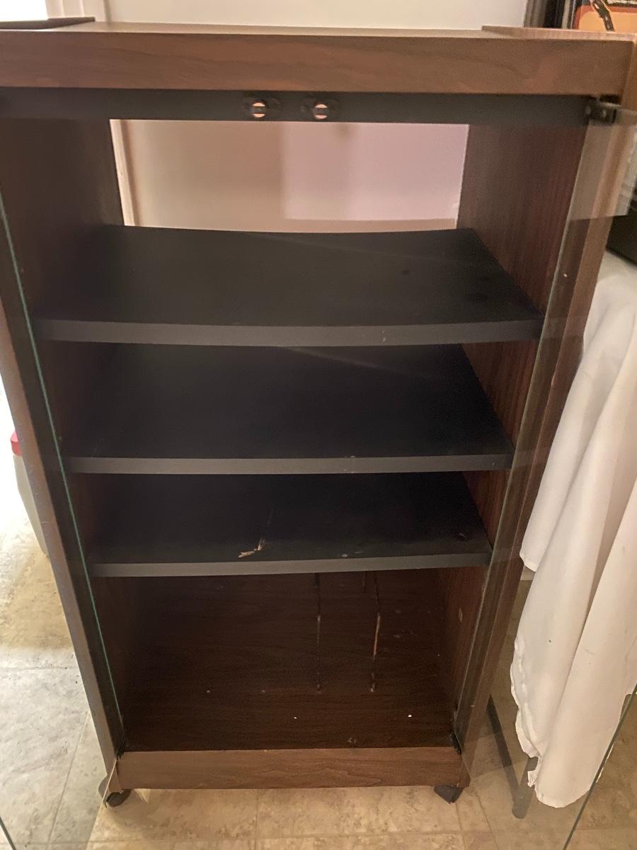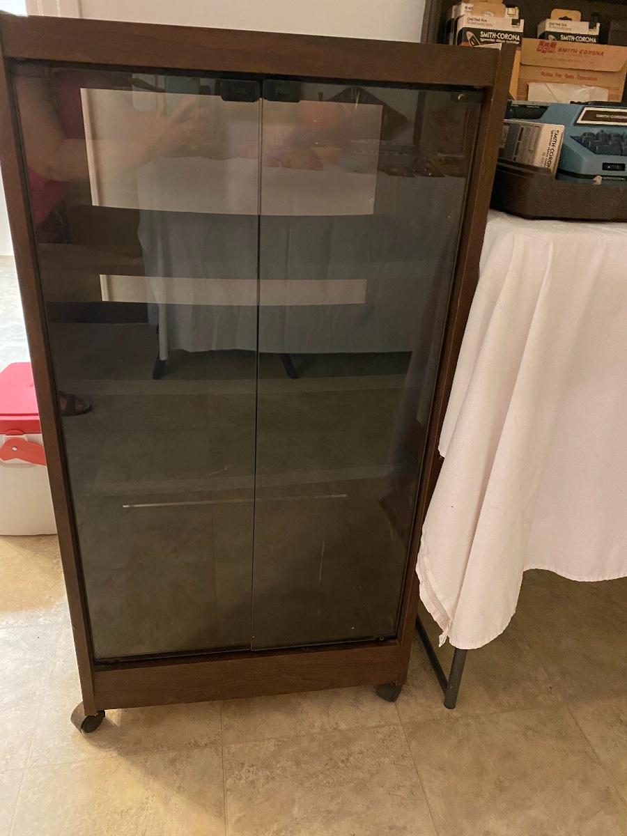 Gusdorf stereo cabinet with glass doors, shelves, on wheels