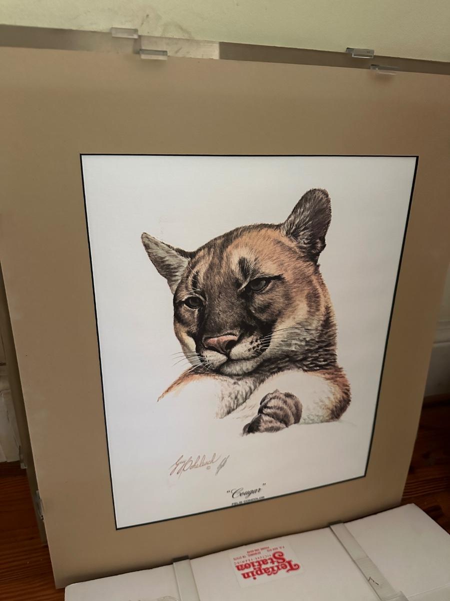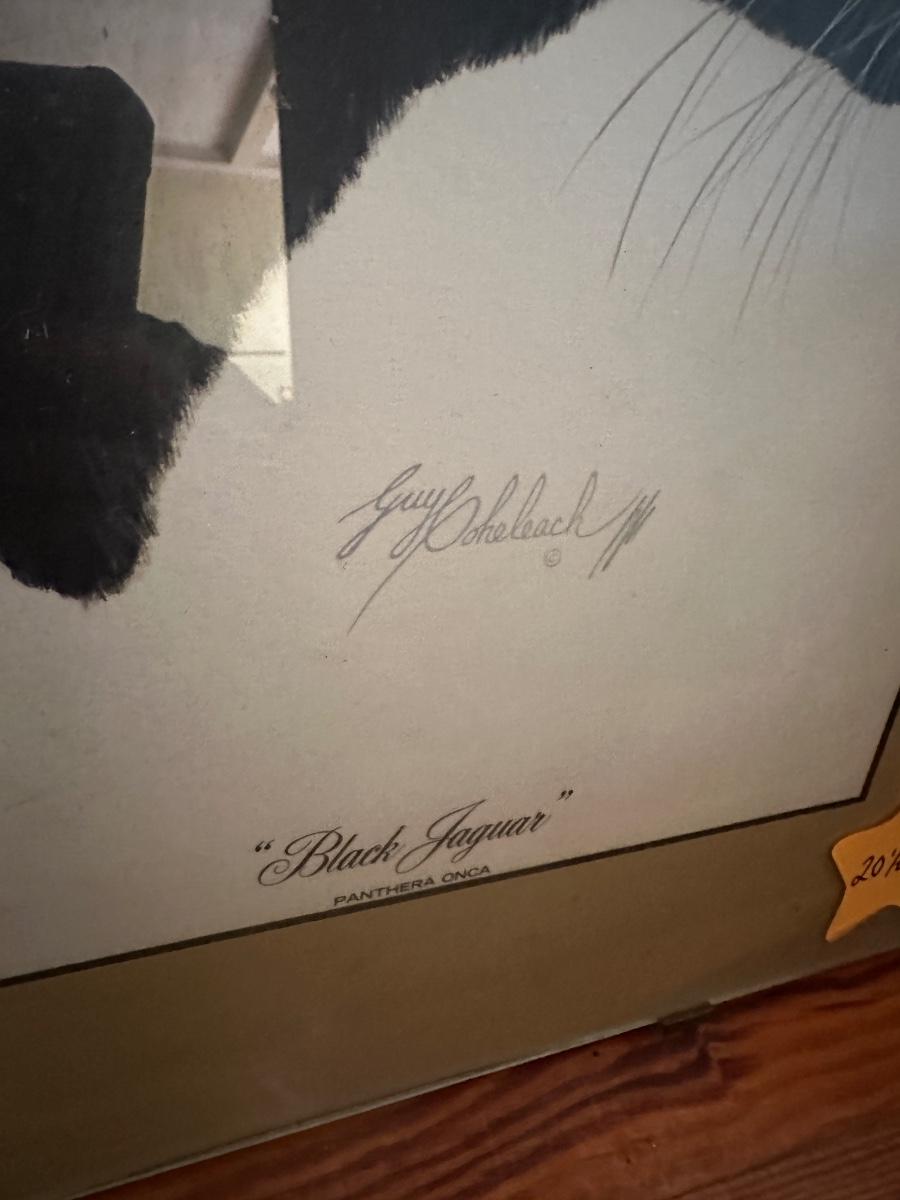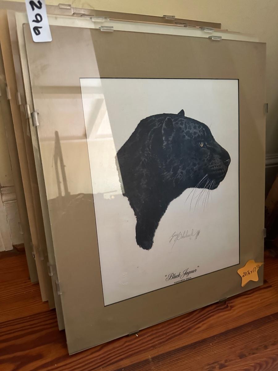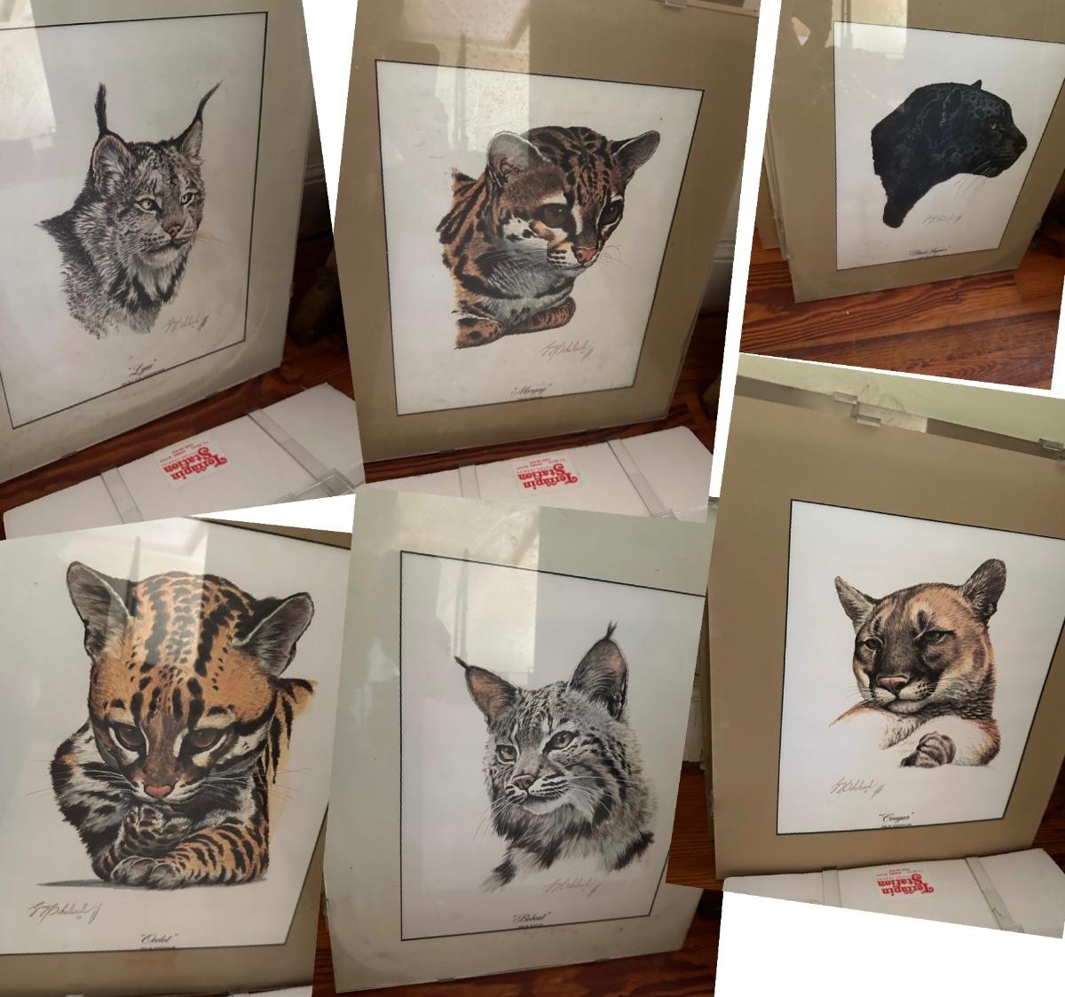 GUY COHELEACHE SIGNED CAT PRINT LOT BLACK JAGUAR, BOBCAT, LYNX, MARGAY,COUGAR, OCELOT, ONE GLASS FRONT IS MISSING