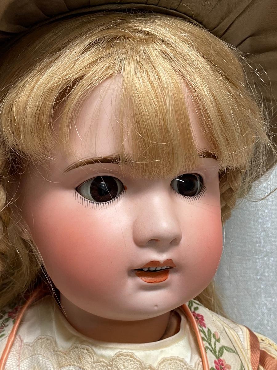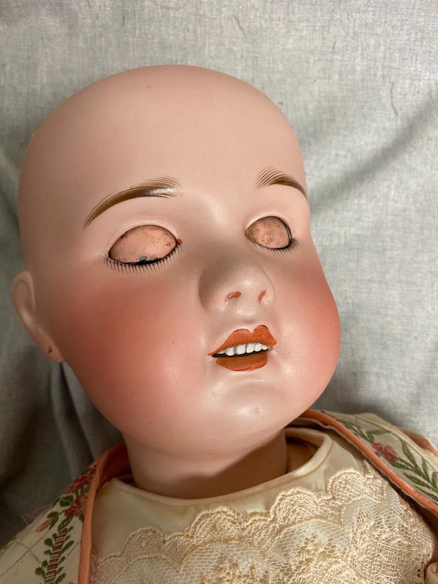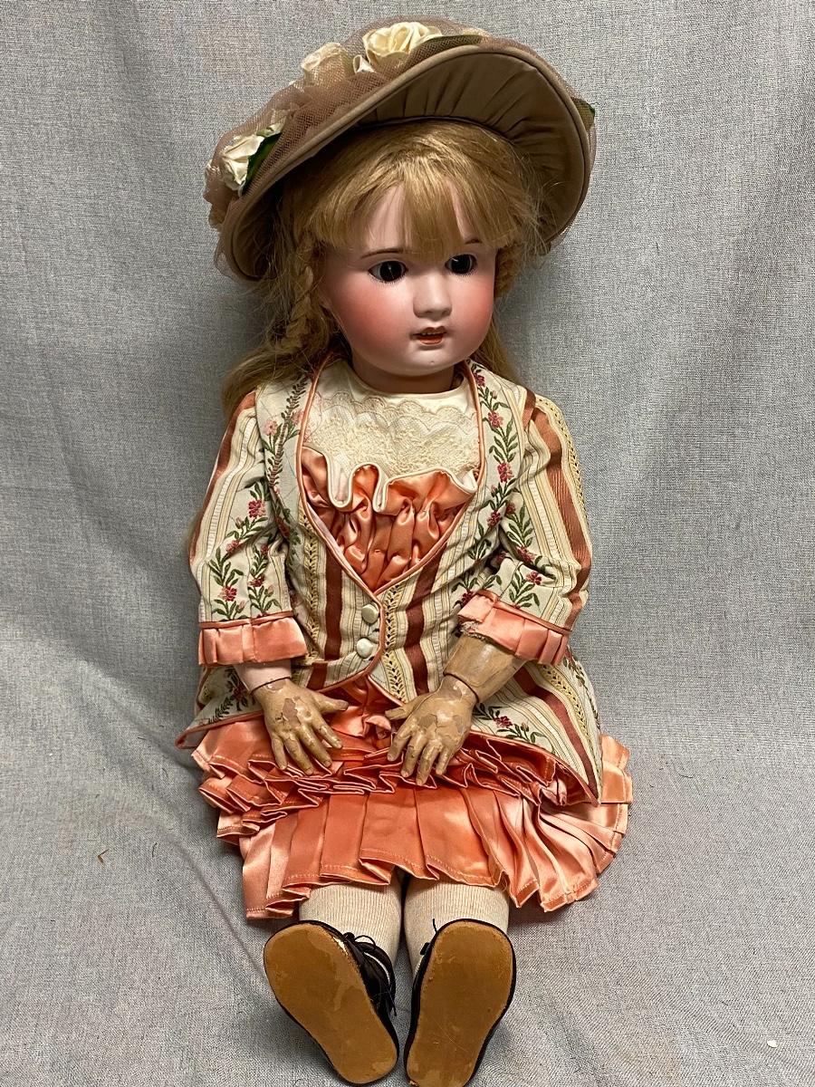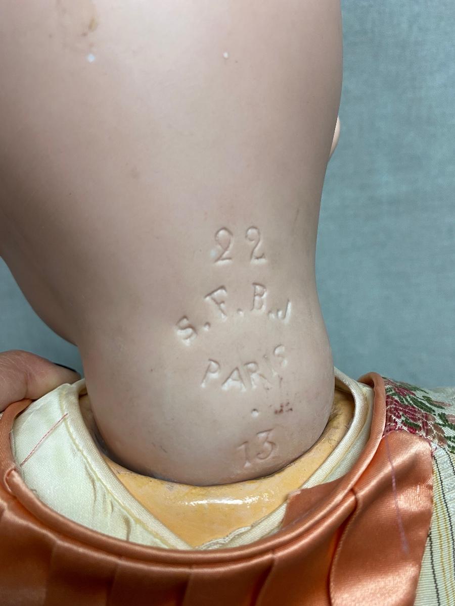 Antique 22 SFBJ Paris Bisque & Composite Sleepy Eye Doll. Blonde hair, dark eyes, open mouth with teeth, small dimple in chin. Beautiful face. Composite is not in the best condition as seen on her hands/arms. Head is marked 22 SFBJ Paris 13. About 27" size.
